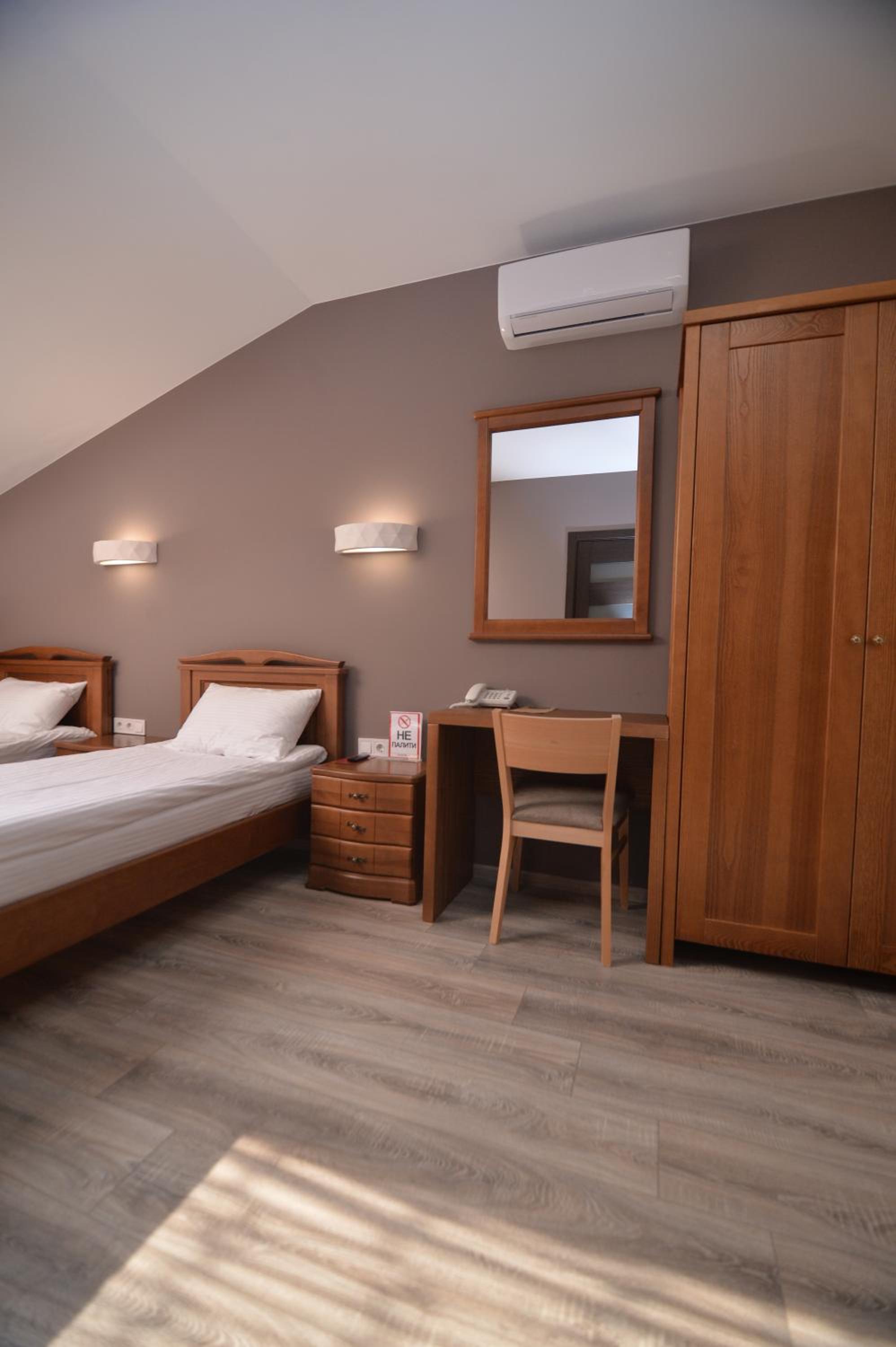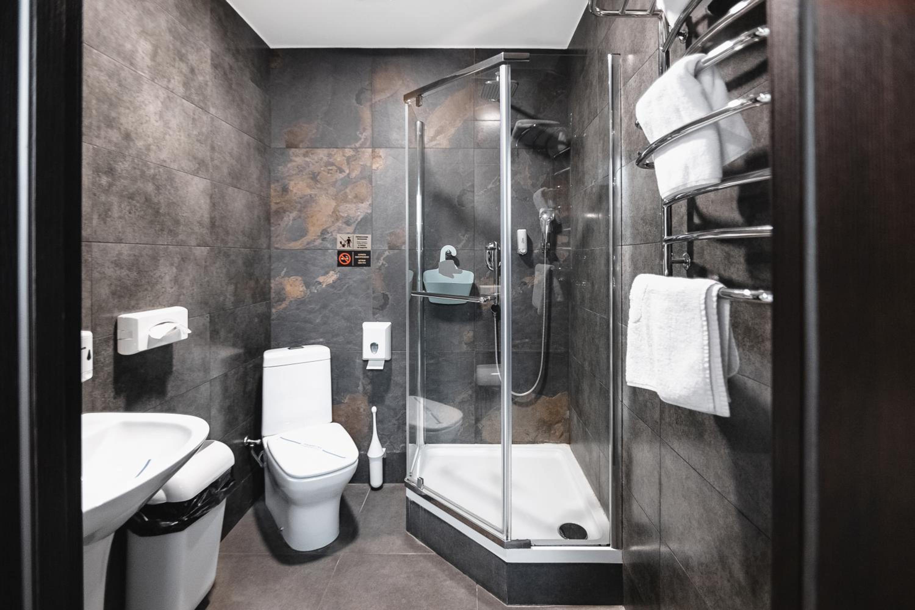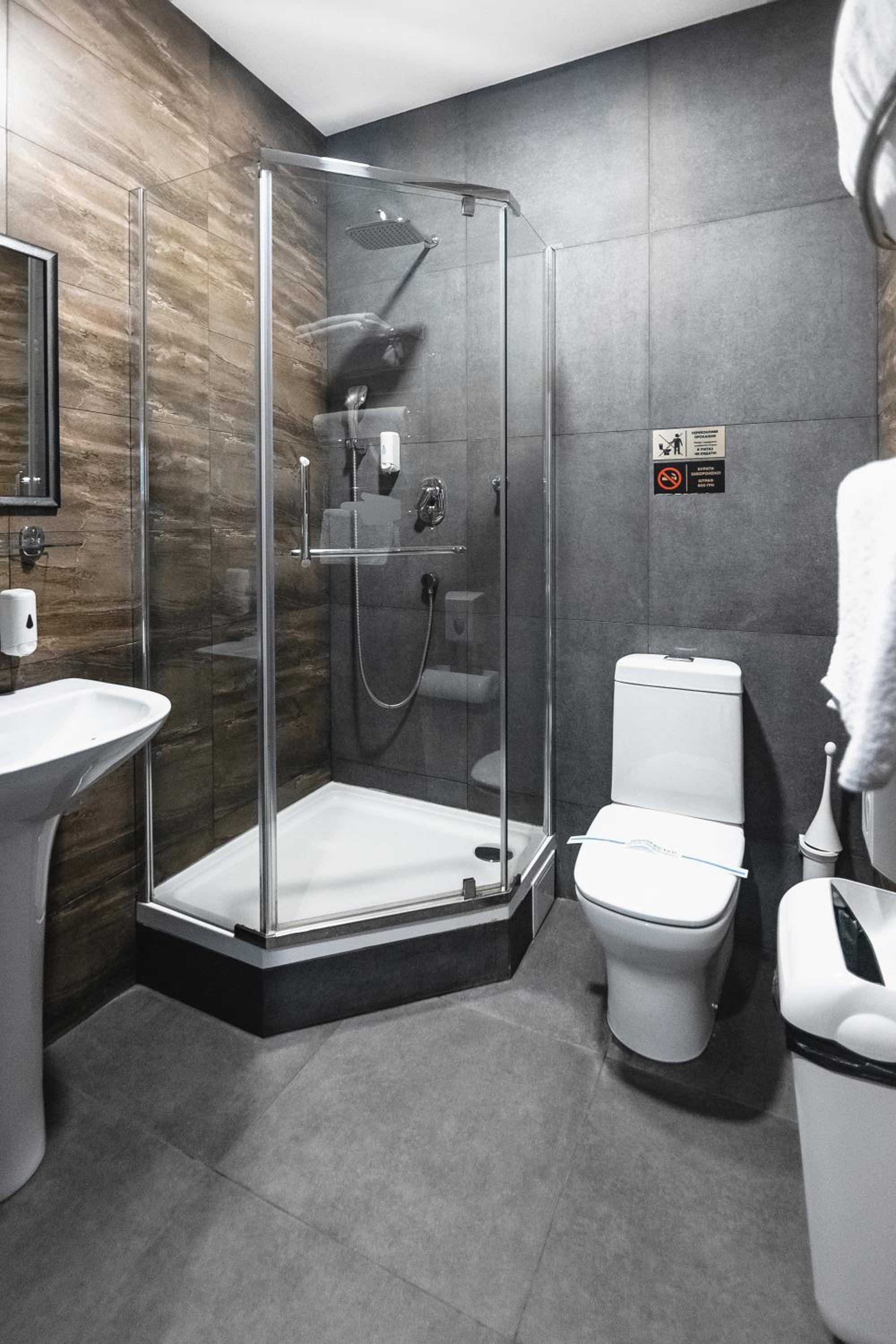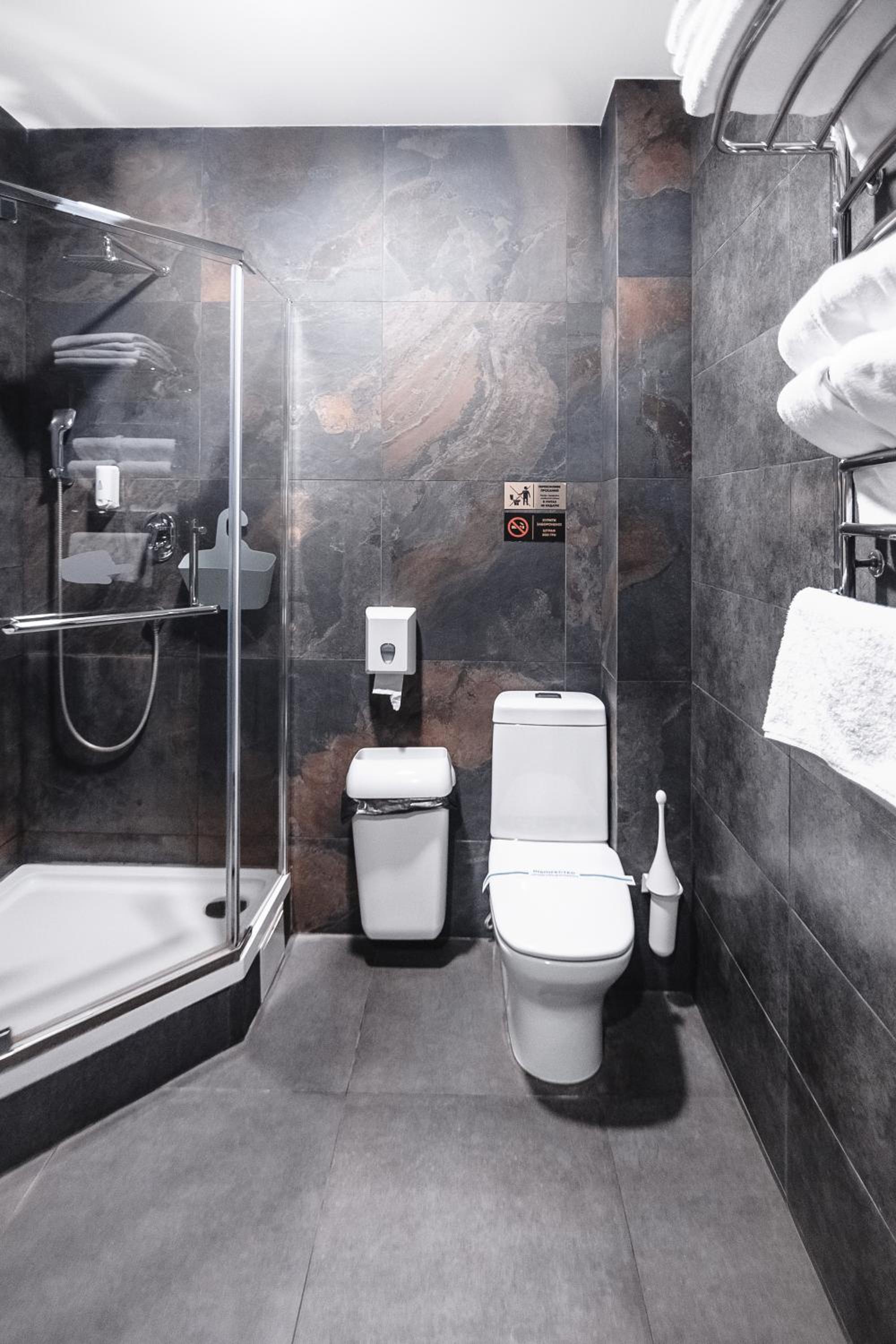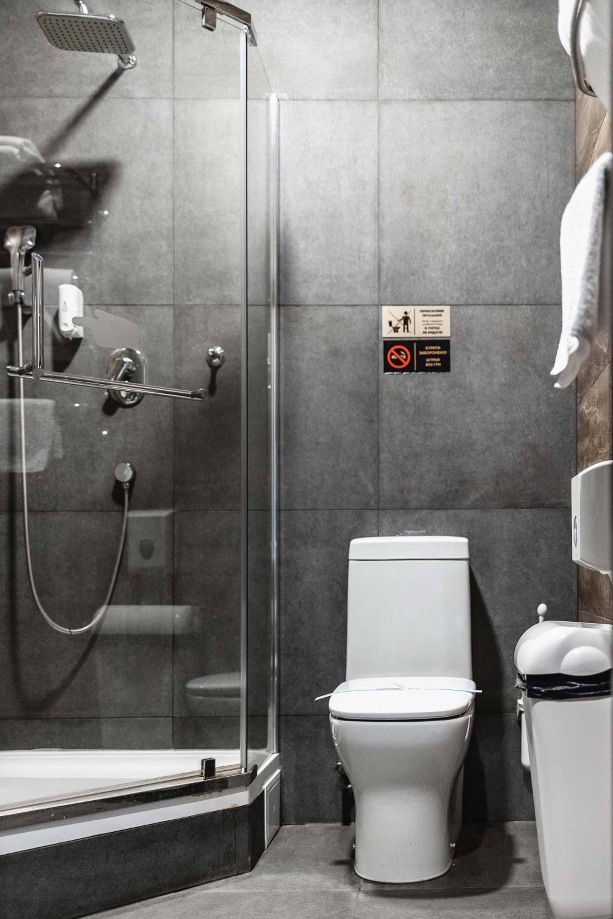 На підвіконні в коридорі майже 5 годин стояли брудний посуд і залишки їжі, сморід йшов по всьому коридору. Чому не прибирали , незрозуміло… сказали, що в готелі не палять, але в ванній кімнаті було чутно запах від цигарок… ми були із песиками, поряд із готелем немає зеленої території, маленька клумба із забороною вигуки для собак, але там досить весело бігав дворовий пес…