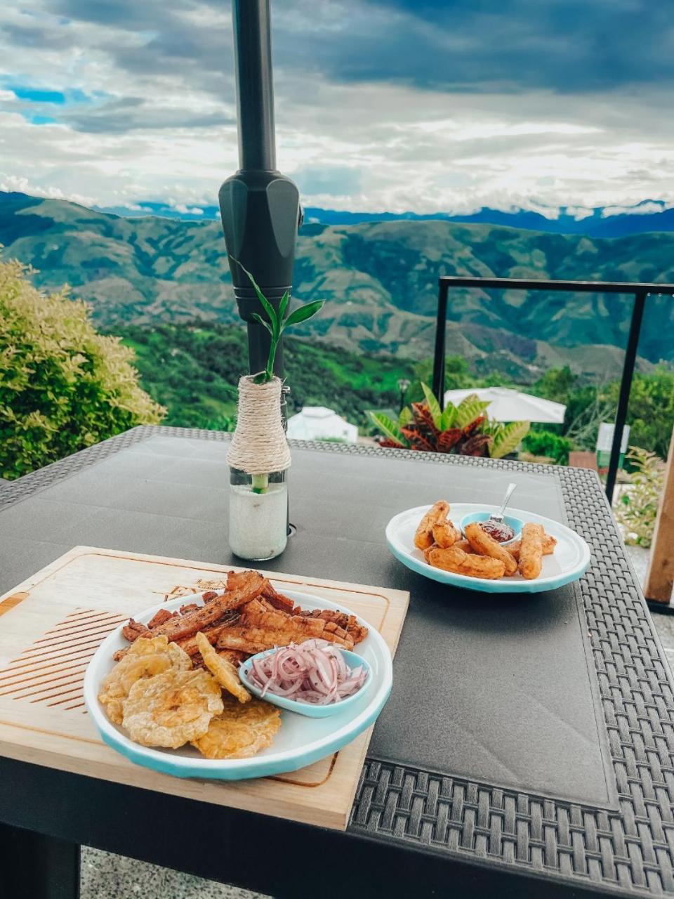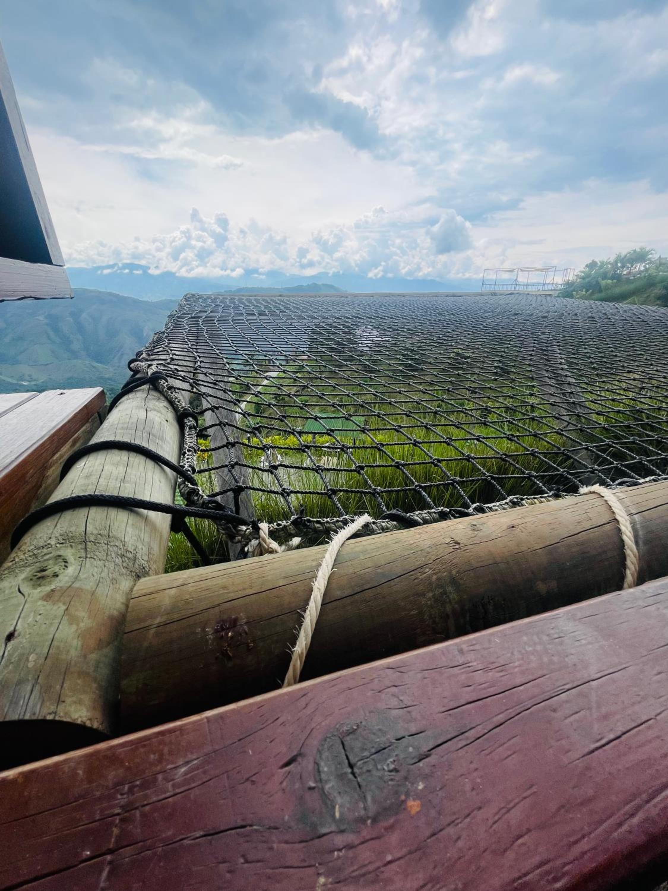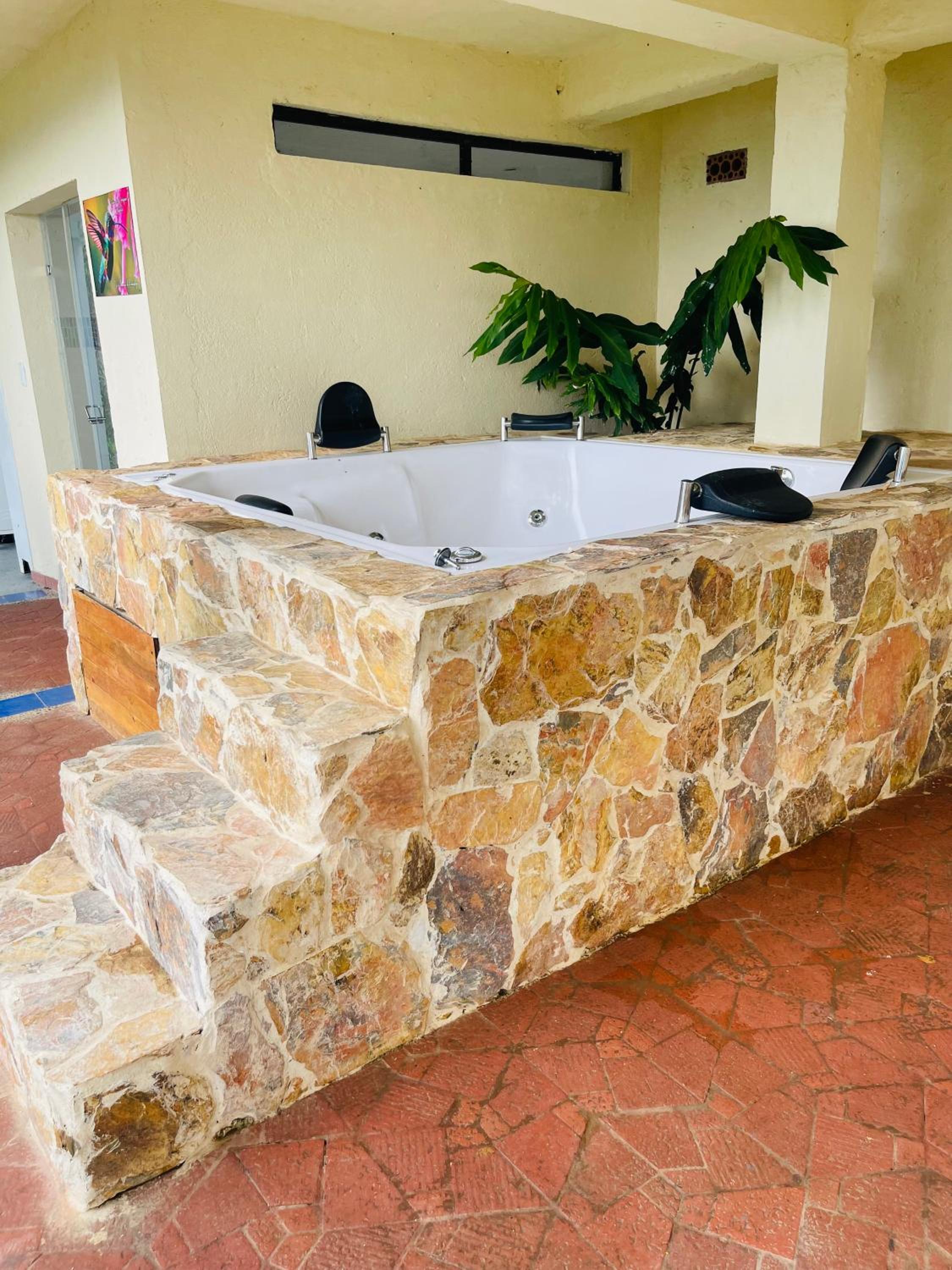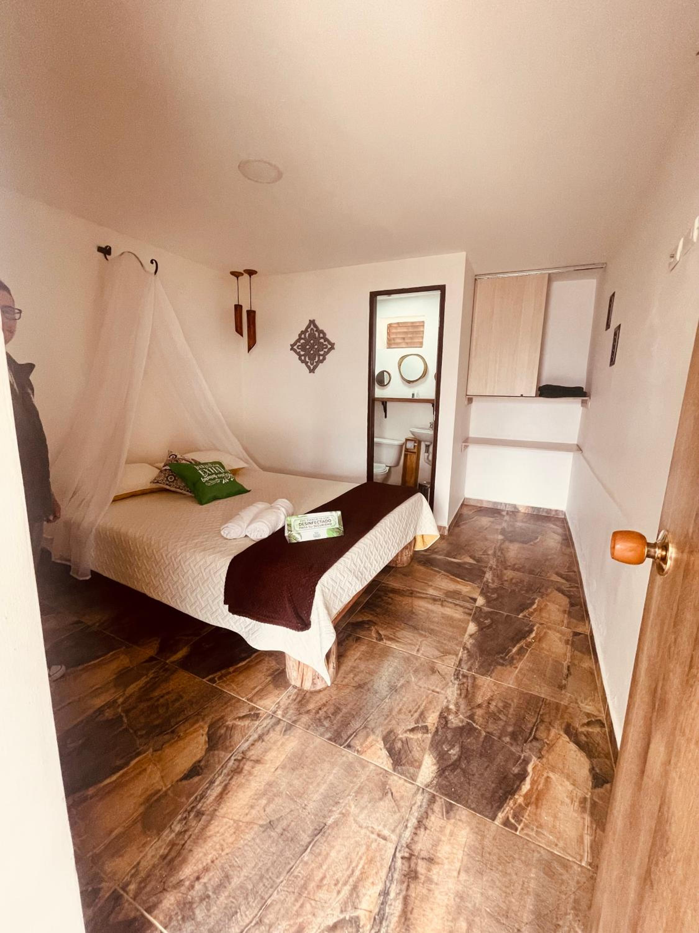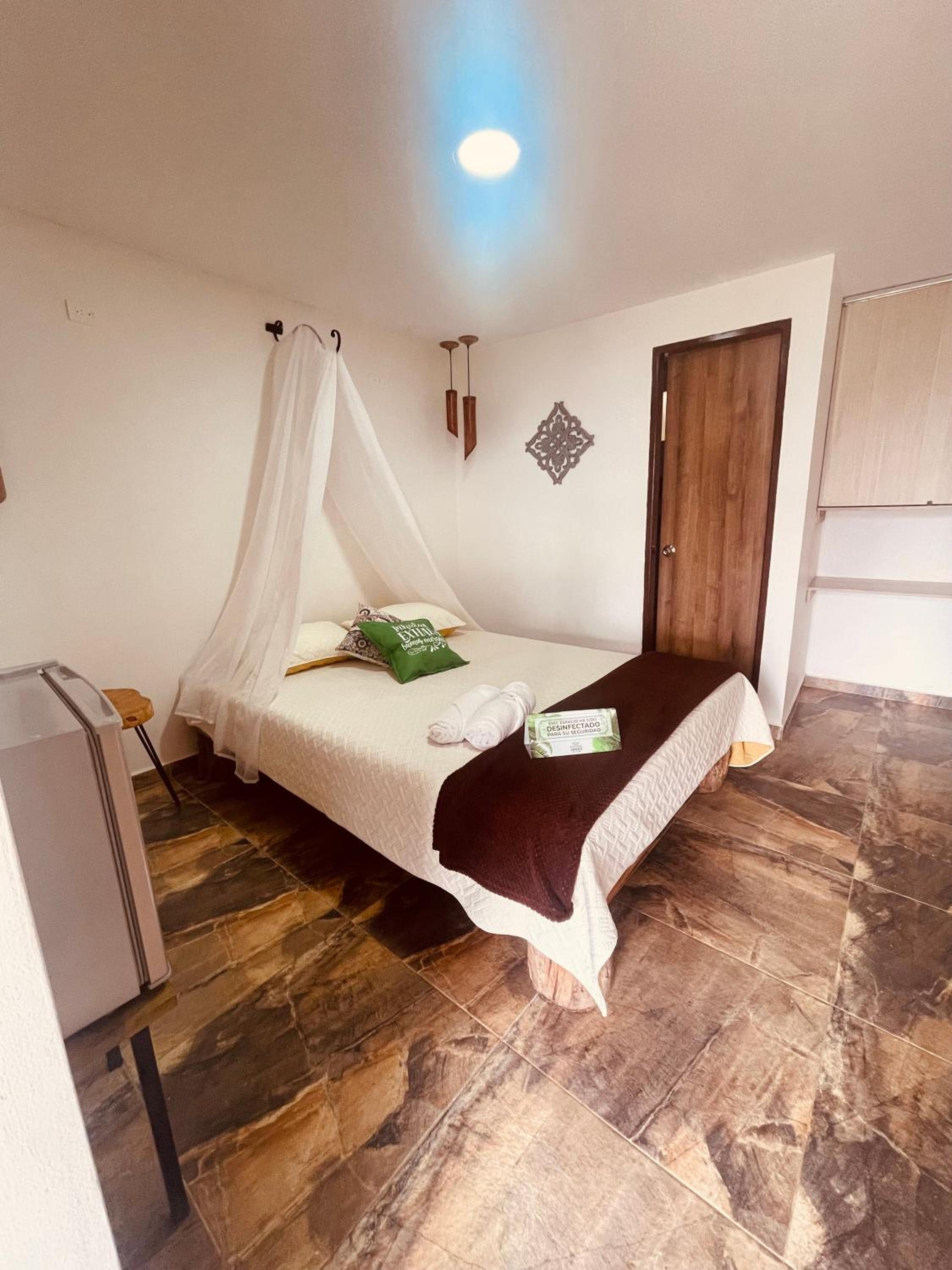 We stayed in the hotel portion of the property. Restaurant was not operating except for a minimal breakfast offering. Bar did not exist. The room had no closet or space to hang or store clothes, and only one light bulb and no AC or even a fan. Only one outlet to charge phones. Bathroom was small and only one light bulb. Pool was not heated. Bedding was thin and mattress was very hard. The view was nice but not different than anywhere else in Colombia. The road to the hotel was unpaved and very rough. The only offering for dinner was a chicken and hotdog skewer. Town was a long ride and no quality restaurants.