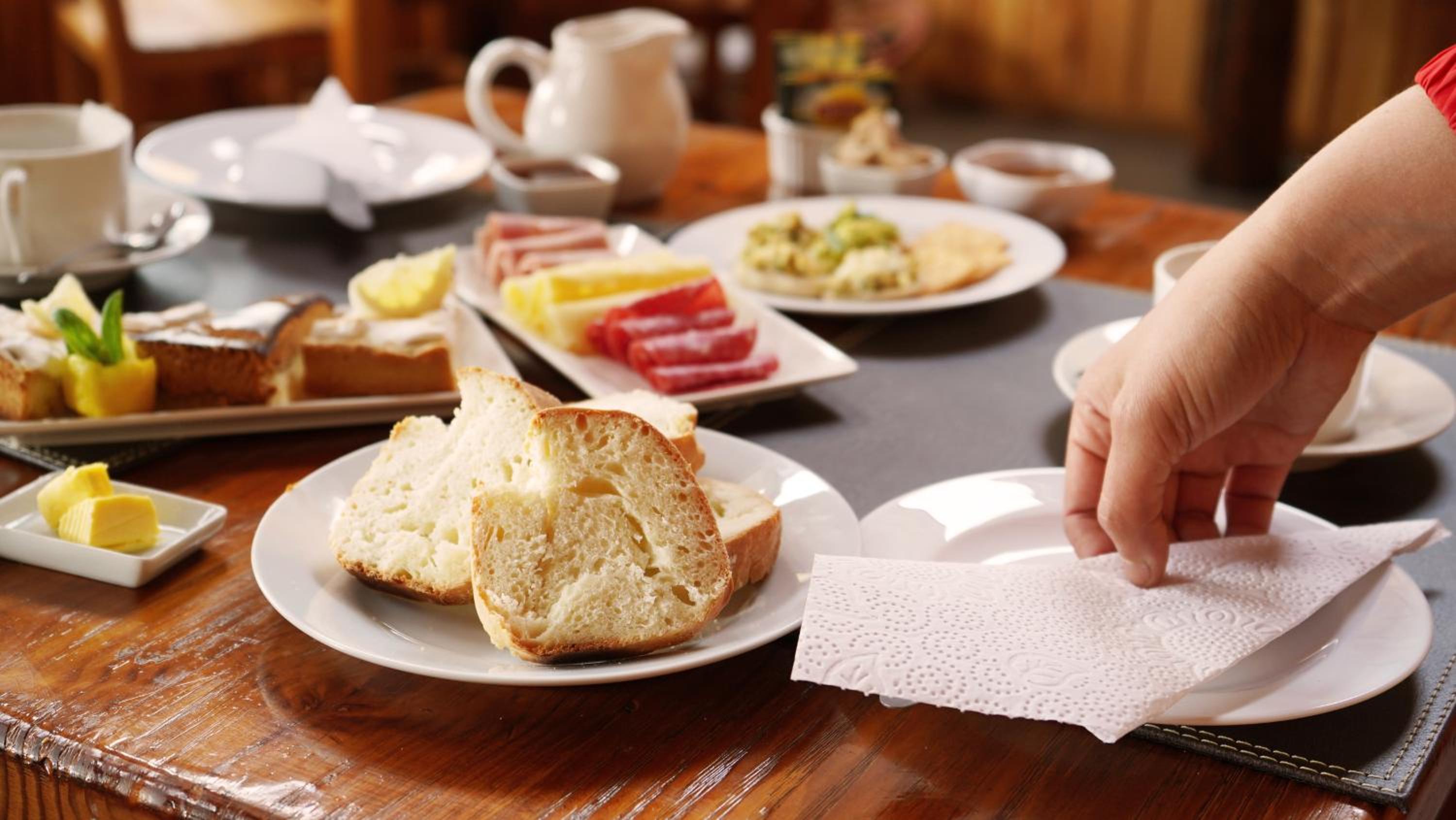 El desayuno regular, café malo y sólo pan envasado.