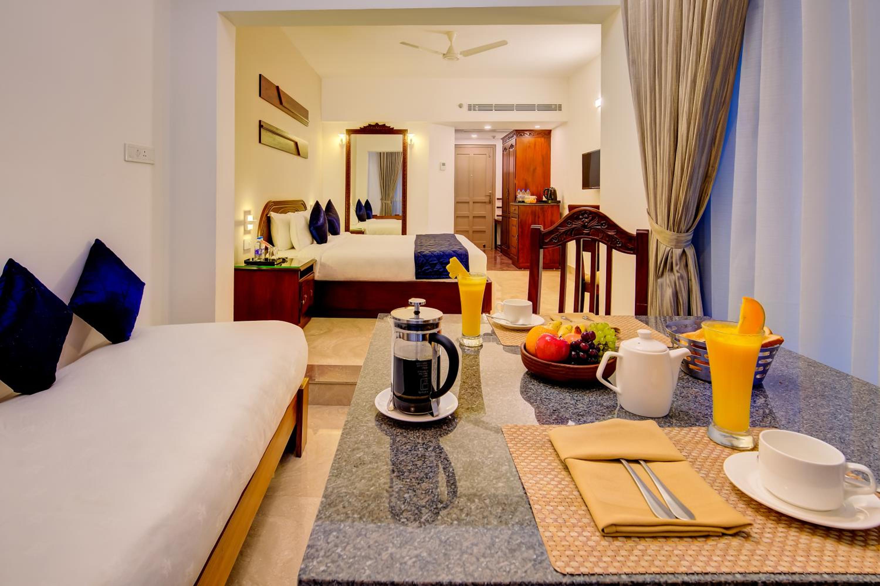 Sterling Guruvayur offers air-conditioned rooms with modern amenities like a flat-screen TV, minibar, and private bathroom, ensuring a comfortable stay for all guests.