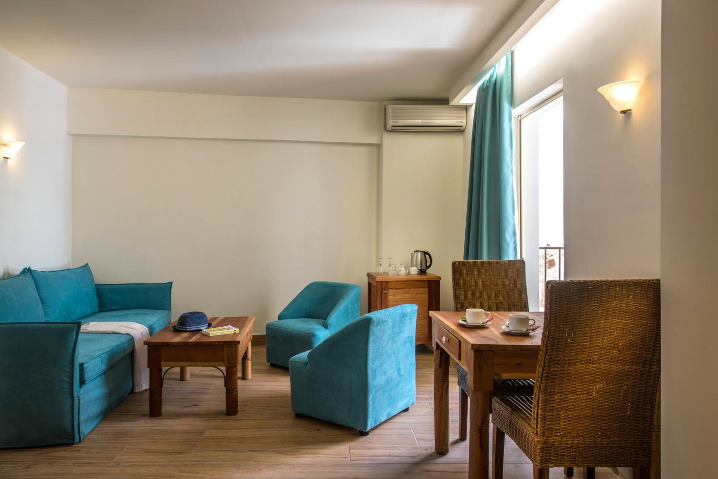 Very comfortable spacious room with full size sofa, soft but comfortable beds and everywhere was very clean. Staff were all friendly and polite, helpful with information as requested. Good location, easy walking distance to the seafront with restaurants and bars. Also close to mountain villages of Koutouloufari and Piskopiano for brilliant tavernas. Simple selection of breakfast foods. Large balcony on the top floor has views of the mountains despite being inward looking over the courtyard.