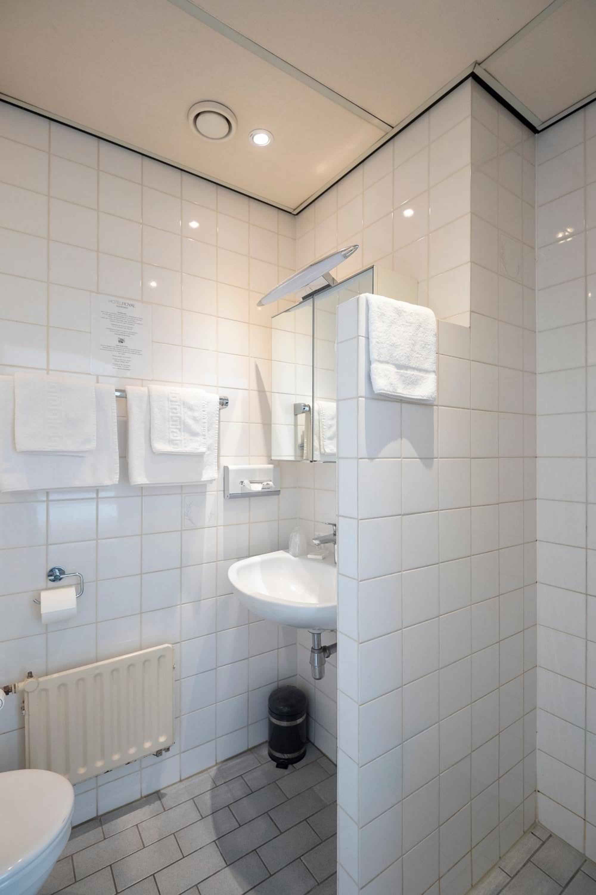 Each room at Hotel Royal is adorned in light décor and equipped with essential amenities such as a desk, TV, and a bathroom with complimentary toiletries.