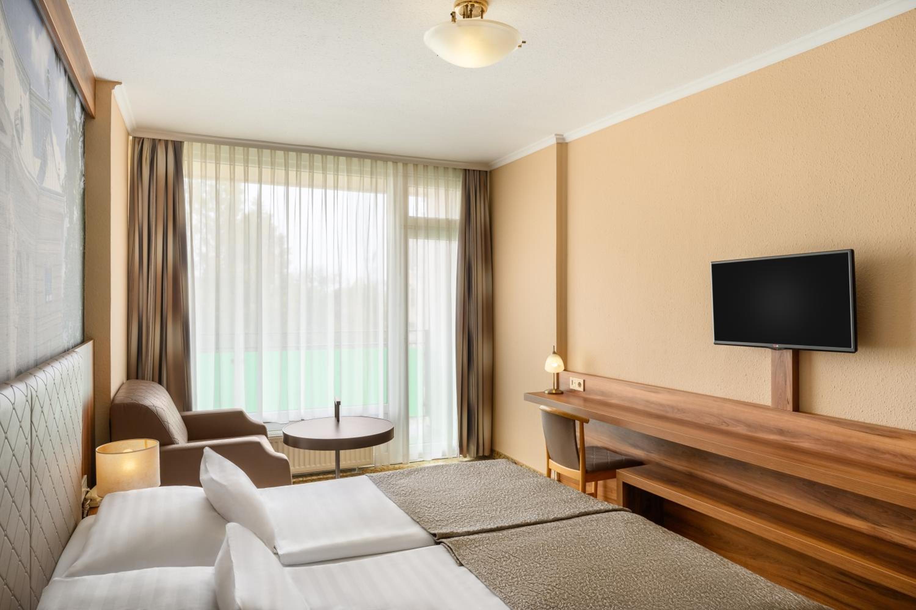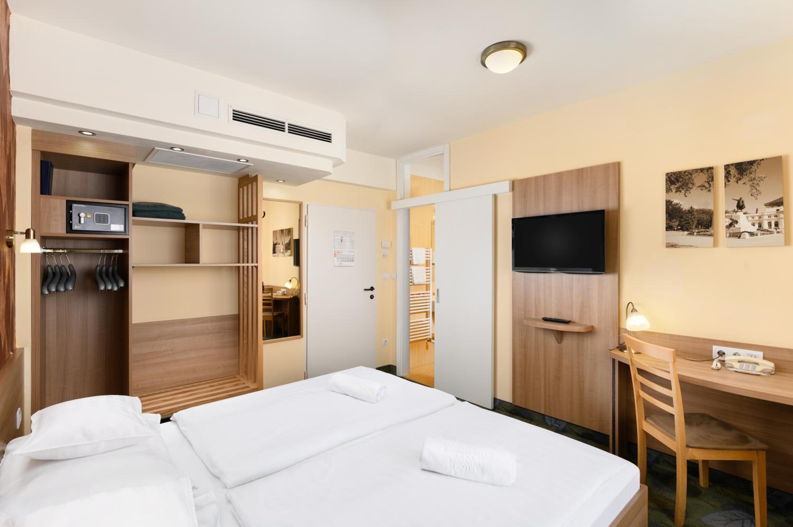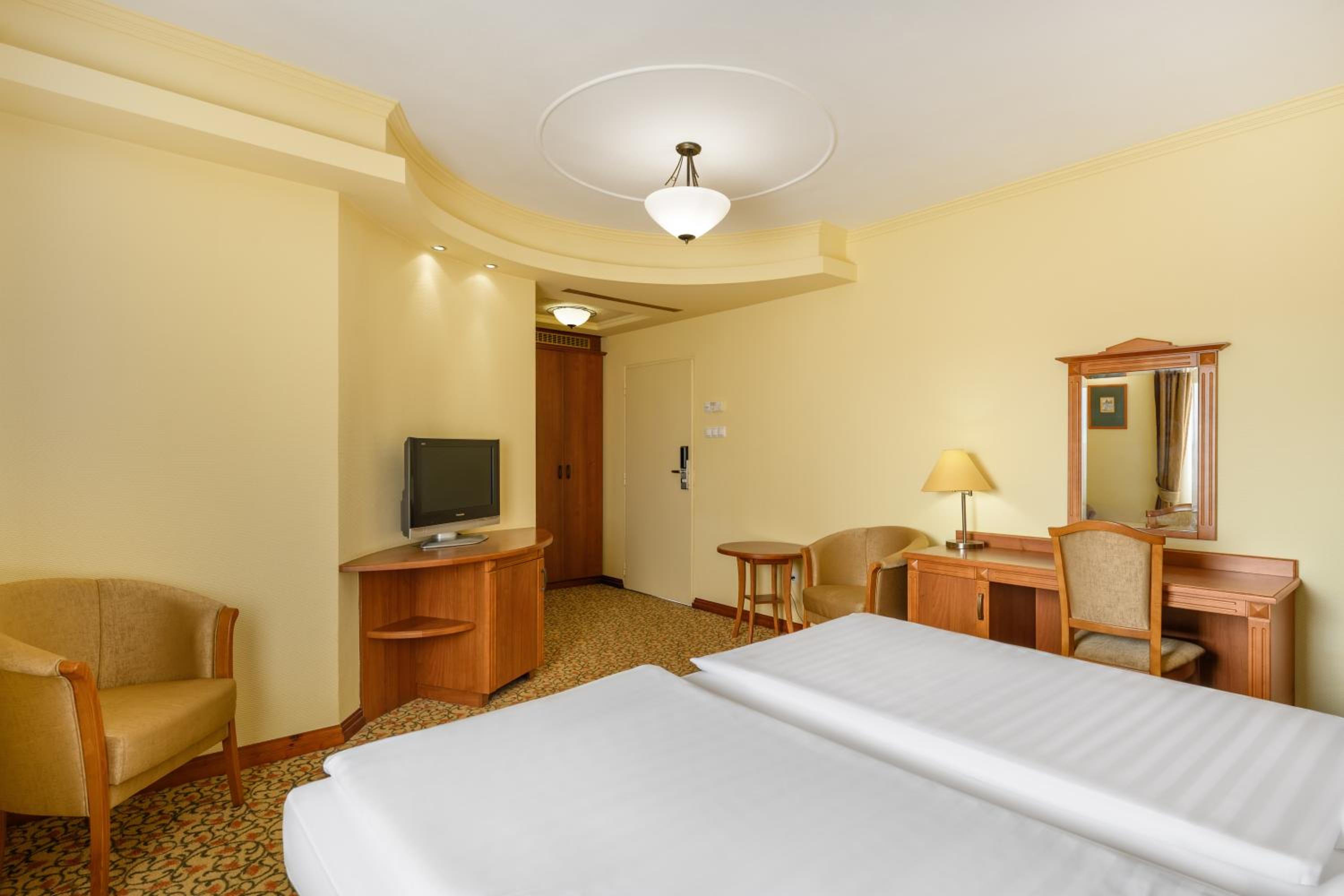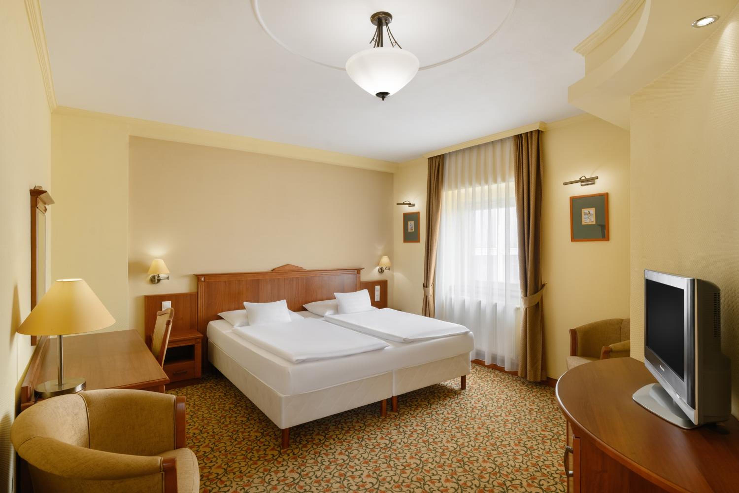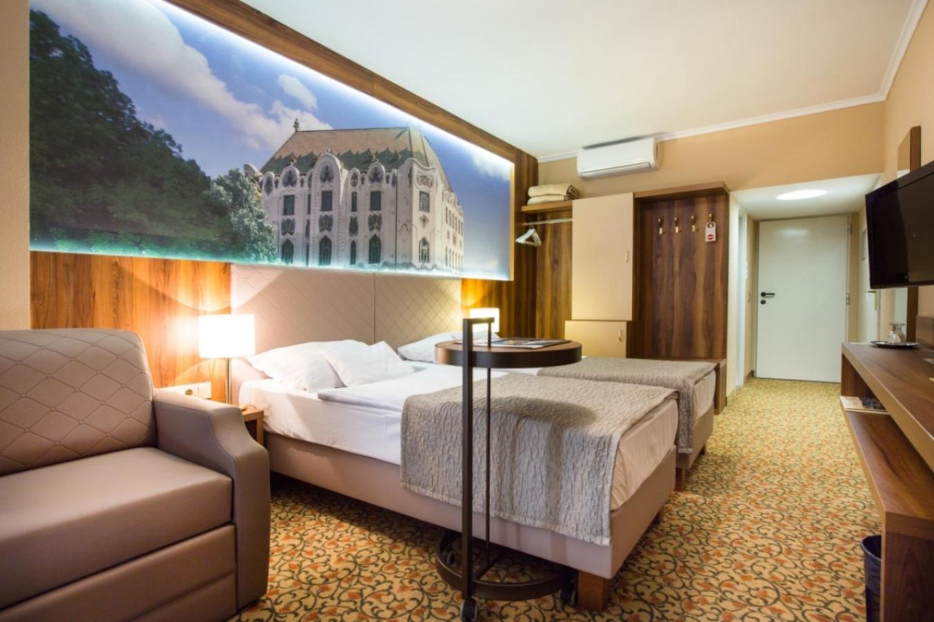 The Aranyhomok Business Wellness Hotel offers modern 4-star rooms with amenities such as a safe, satellite TV, and plush bathrobes.