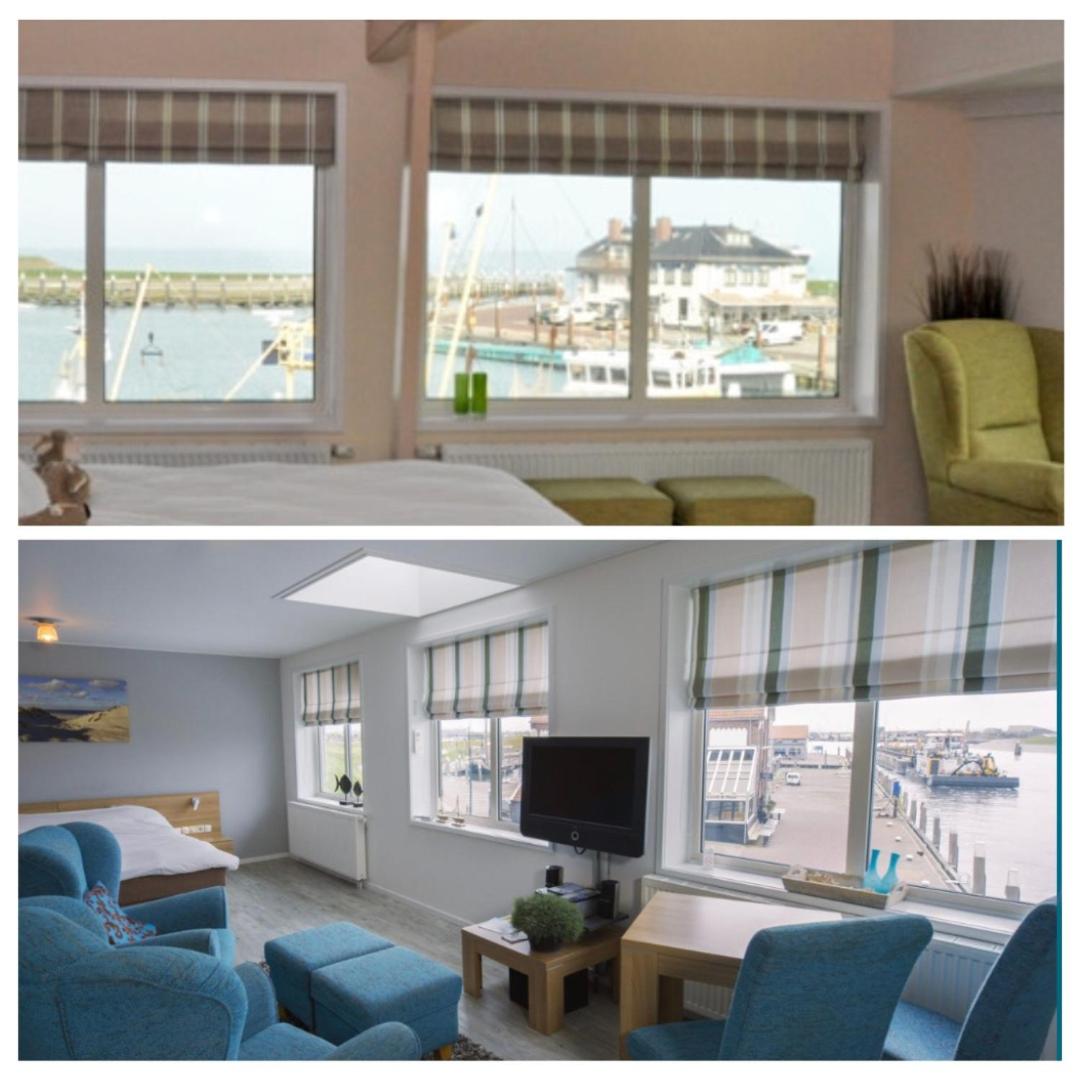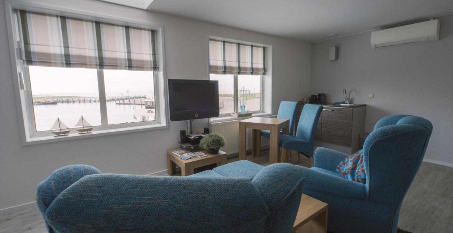 Een ruime kamer met een prachtig uitzicht over de haven en de Waddenzee