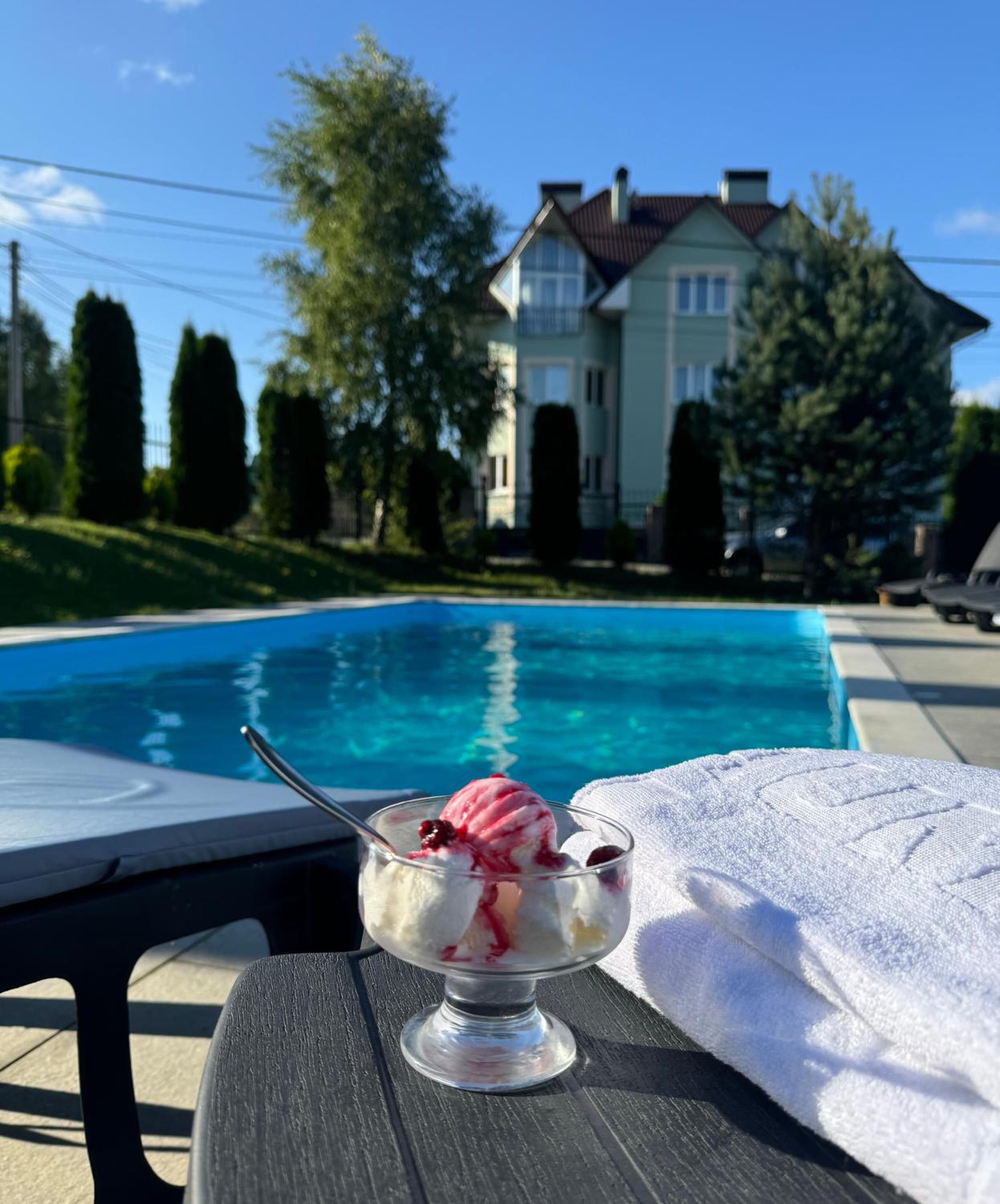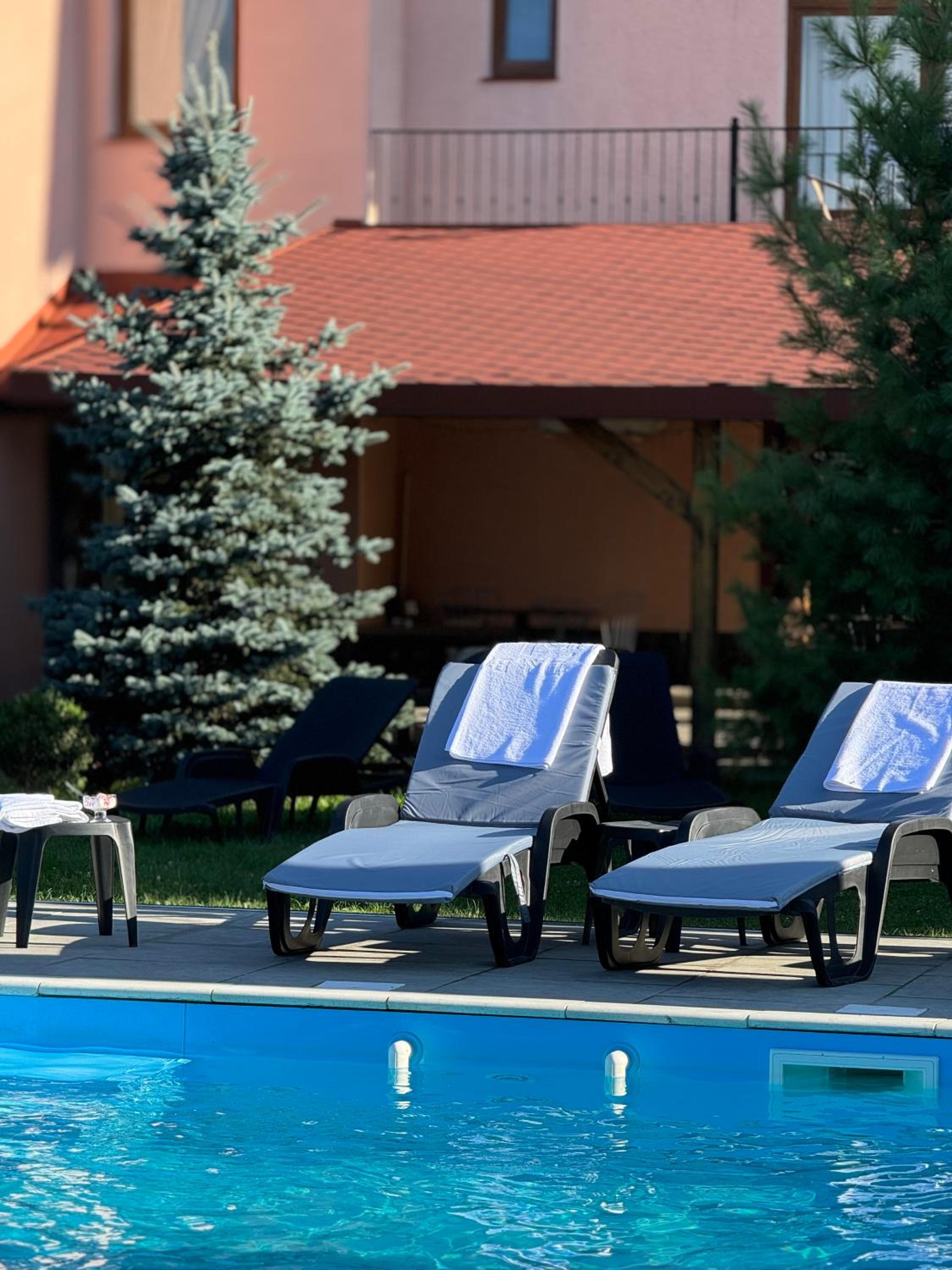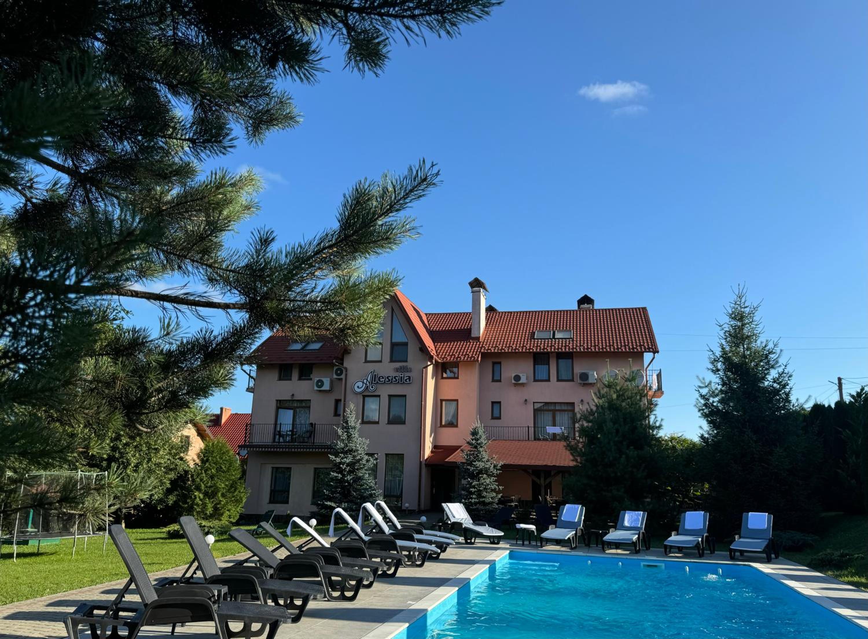 Територія невеличка, але дуже зелена, красива. Басейн ну прямо дуже теплий. Коли на вулиці було 21-22 градуси, у басейні ми грілися) думаю градусів 28-30 температура води, і це вау для осінньої погоди.