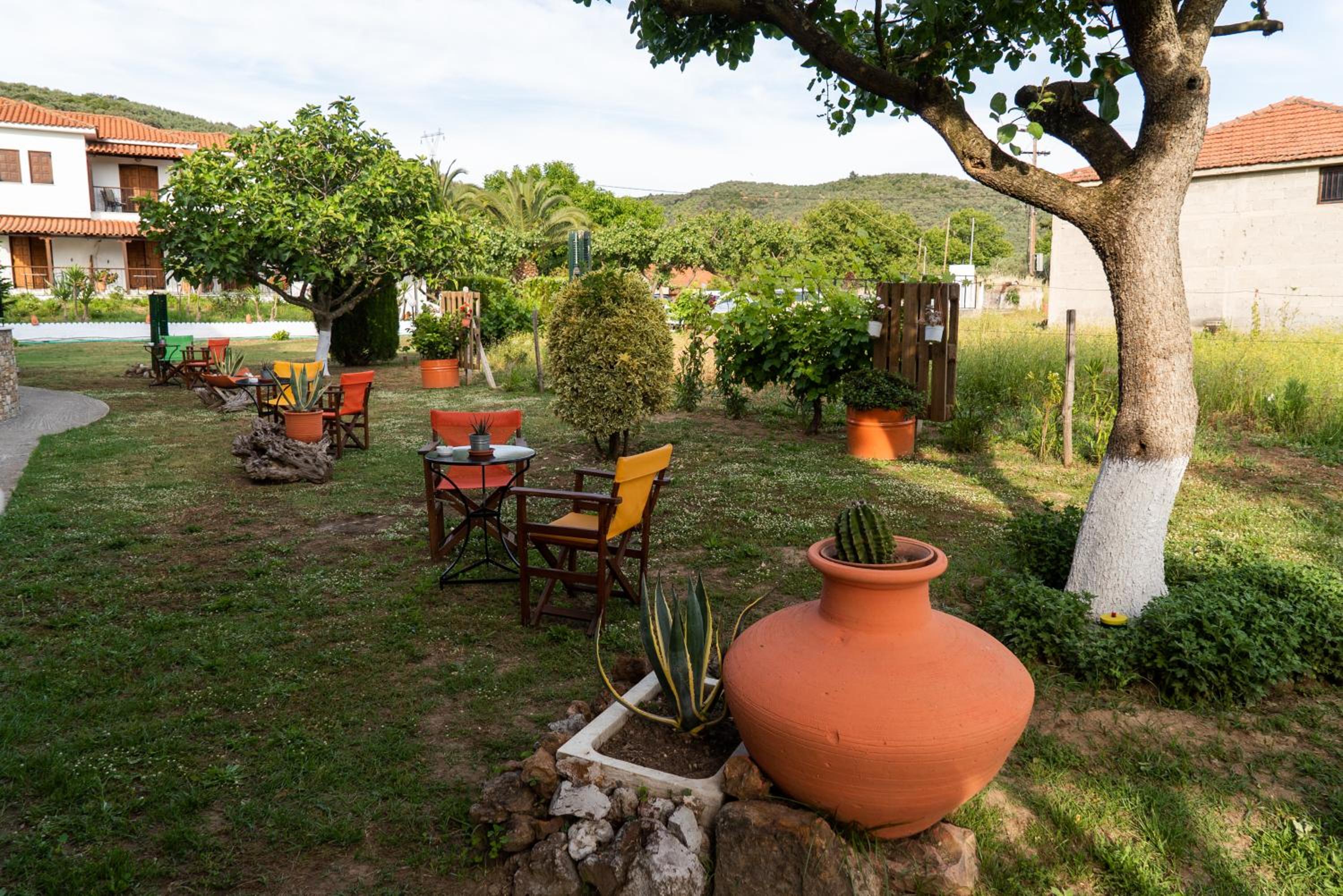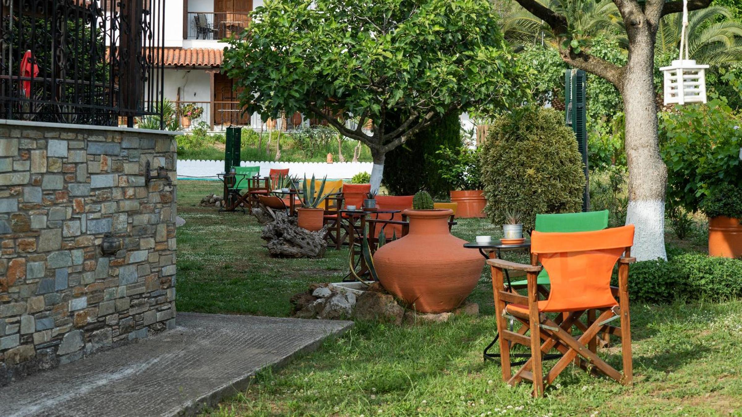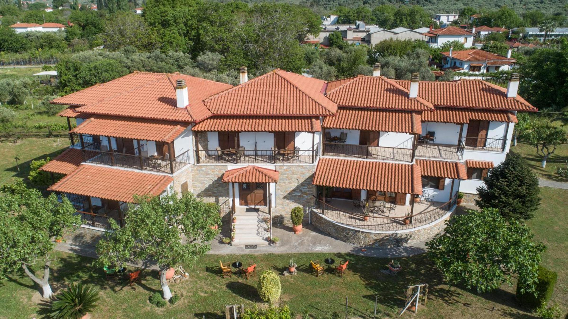 Experience the cozy charm of Hotel Ainareti with rooms featuring fireplaces and balconies overlooking Mount Pilion or the lush garden. The dark wood furnishings and warm colors create a welcoming atmosphere for your stay.