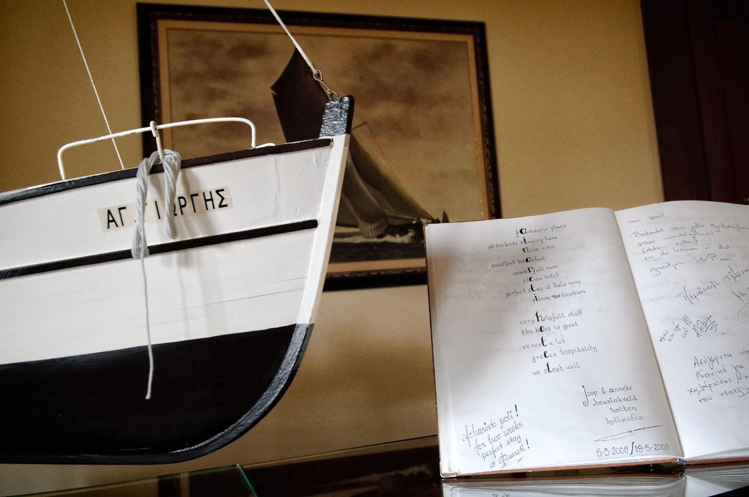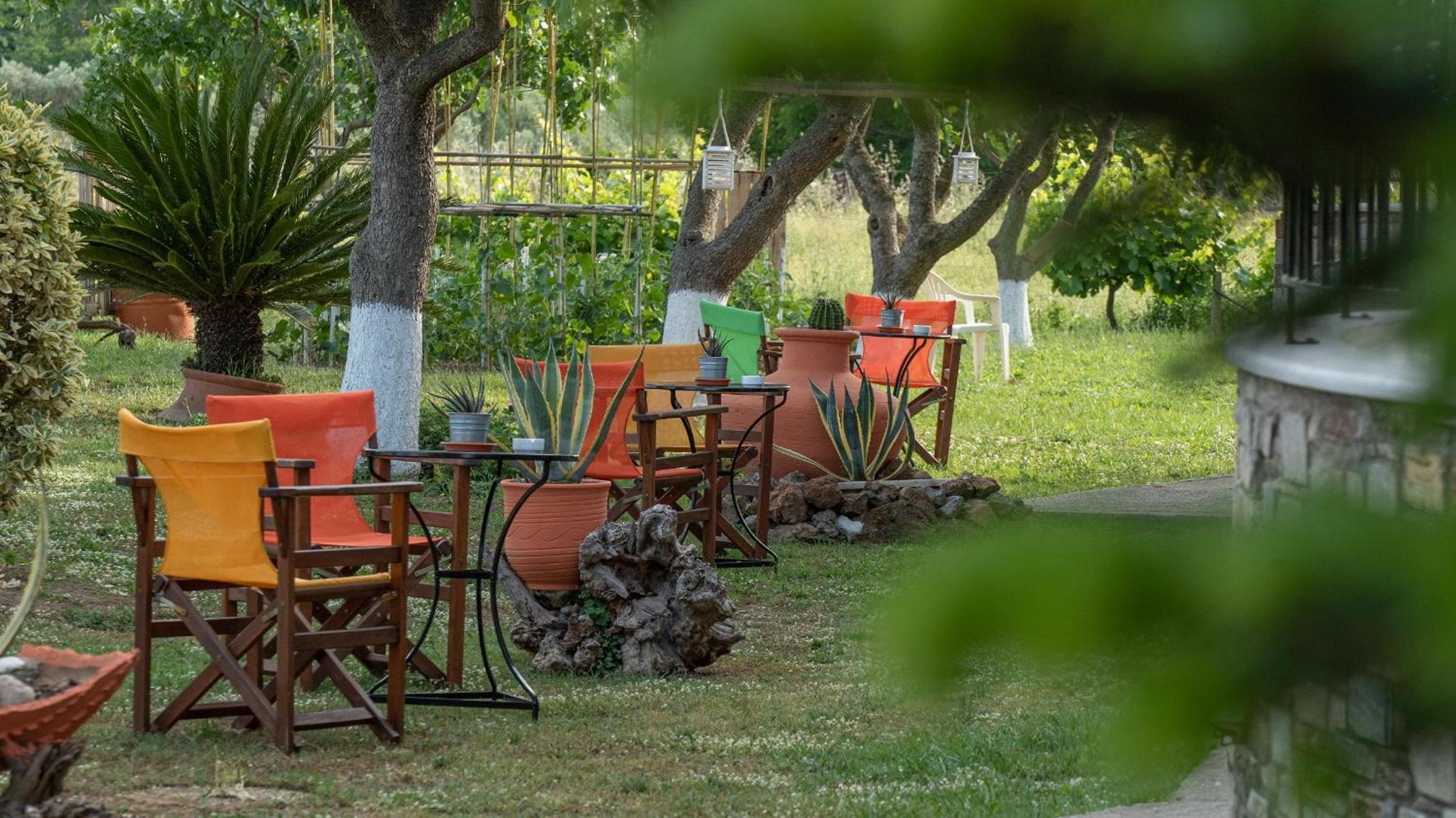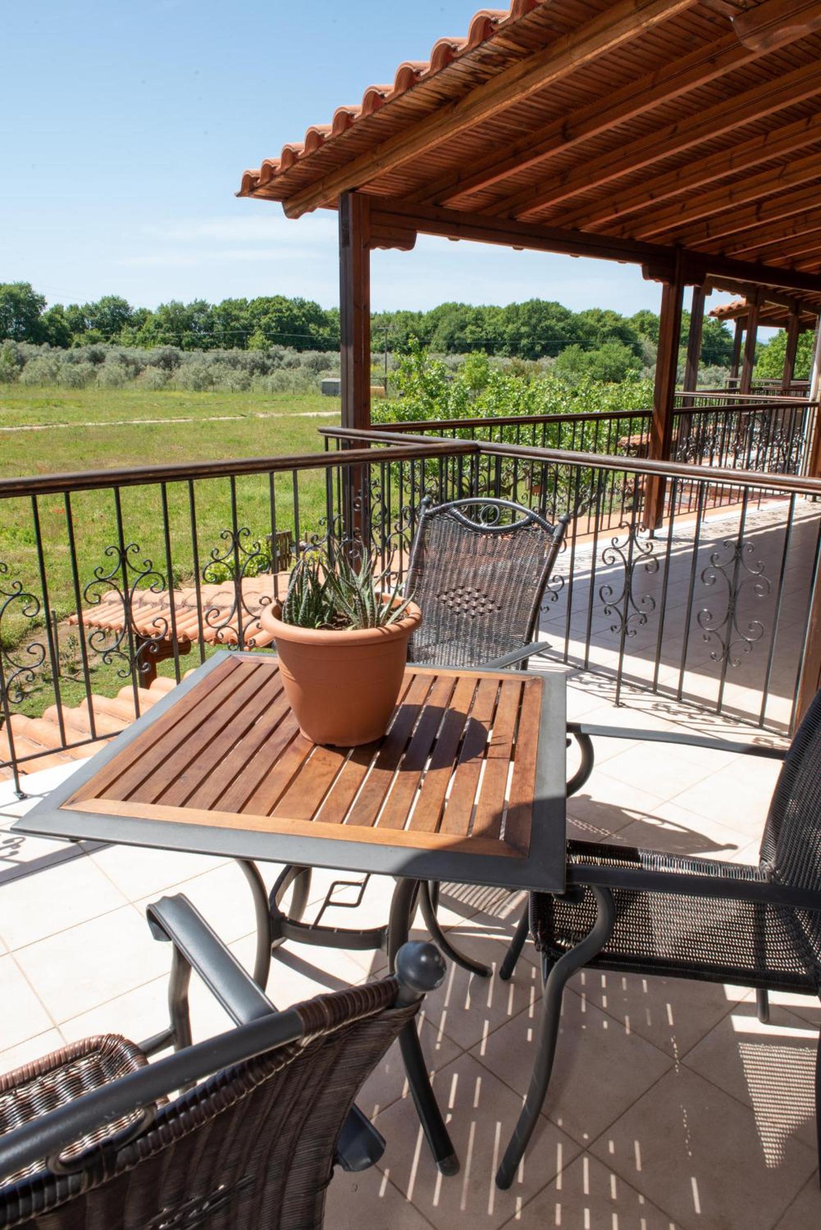 Experience the cozy charm of Hotel Ainareti with rooms featuring fireplaces and balconies overlooking Mount Pilion or the lush garden. The dark wood furnishings and warm colors create a welcoming atmosphere for your stay.