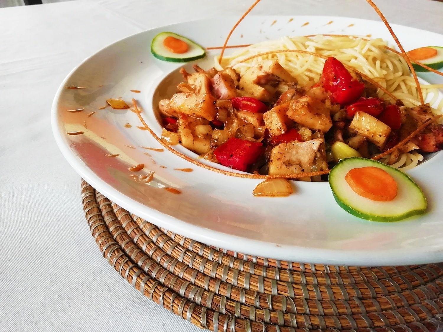 Was really difficult to get food, first night there was no cook, second night I didn’t bother, third night the very disinterested girl behind the bar told me to read the menu on the wall which was mostly illegible. So I ate every night at the Cap St Louis Hotel about 100 yards away which was very nice. Also it seems you have to request water for the shower when you need it which seems a little odd.
