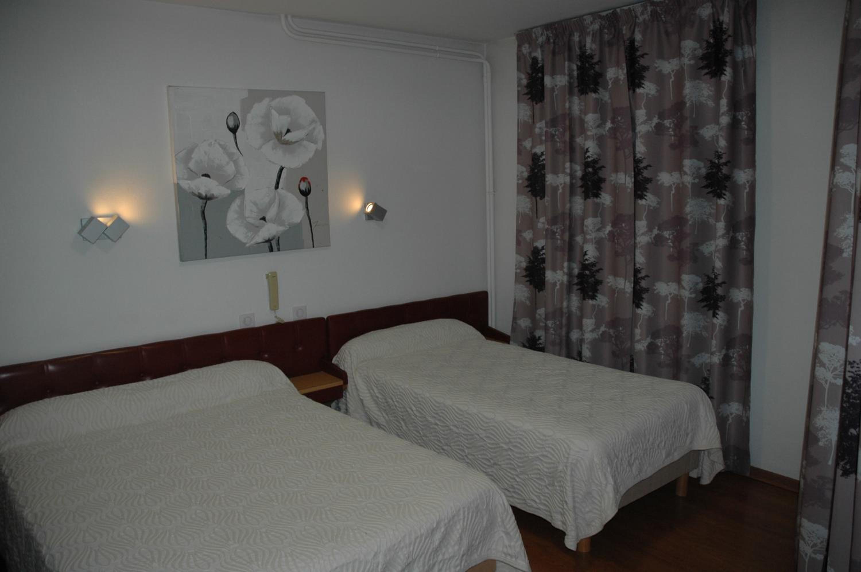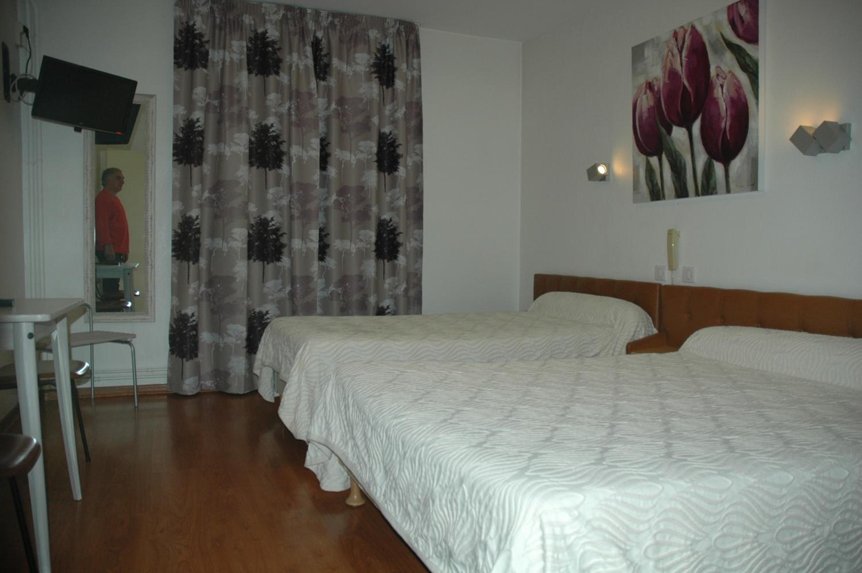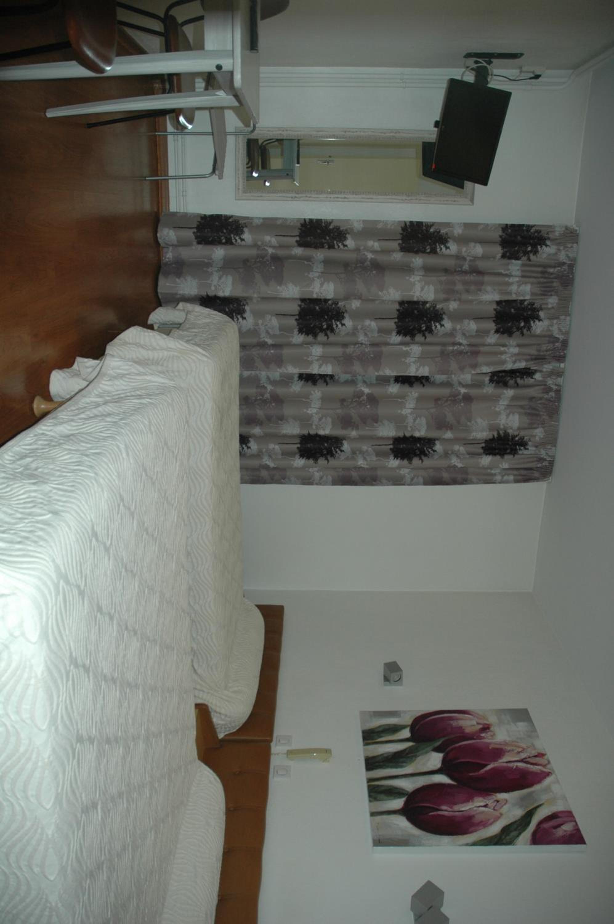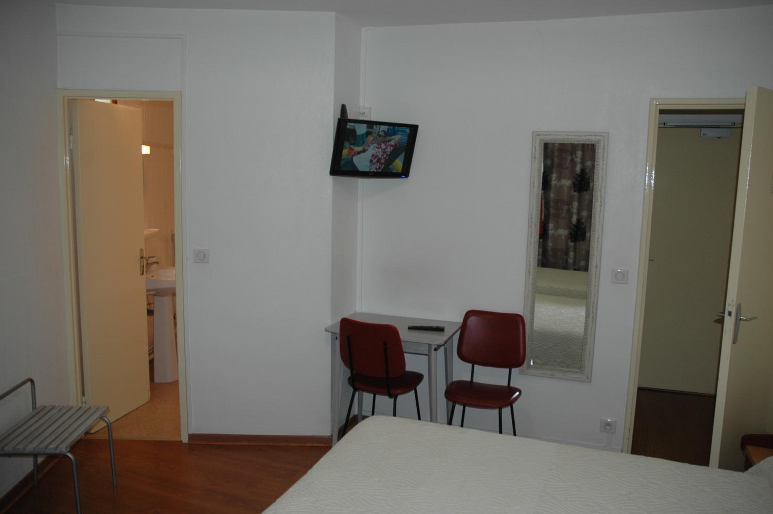 Accueil très sympathique. Accepté les chiens gratuitement. Le petit déjeuner à 7,50€ est très bien et à tout ce qu’il faut pour bien commencer la journée. La chambre spacieuse et très bien chauffée. Des places de parking devant l’établissement. Emplacement au calme sur une route pas très passante. Télé dans la chambre et prises sur un côté du lit.