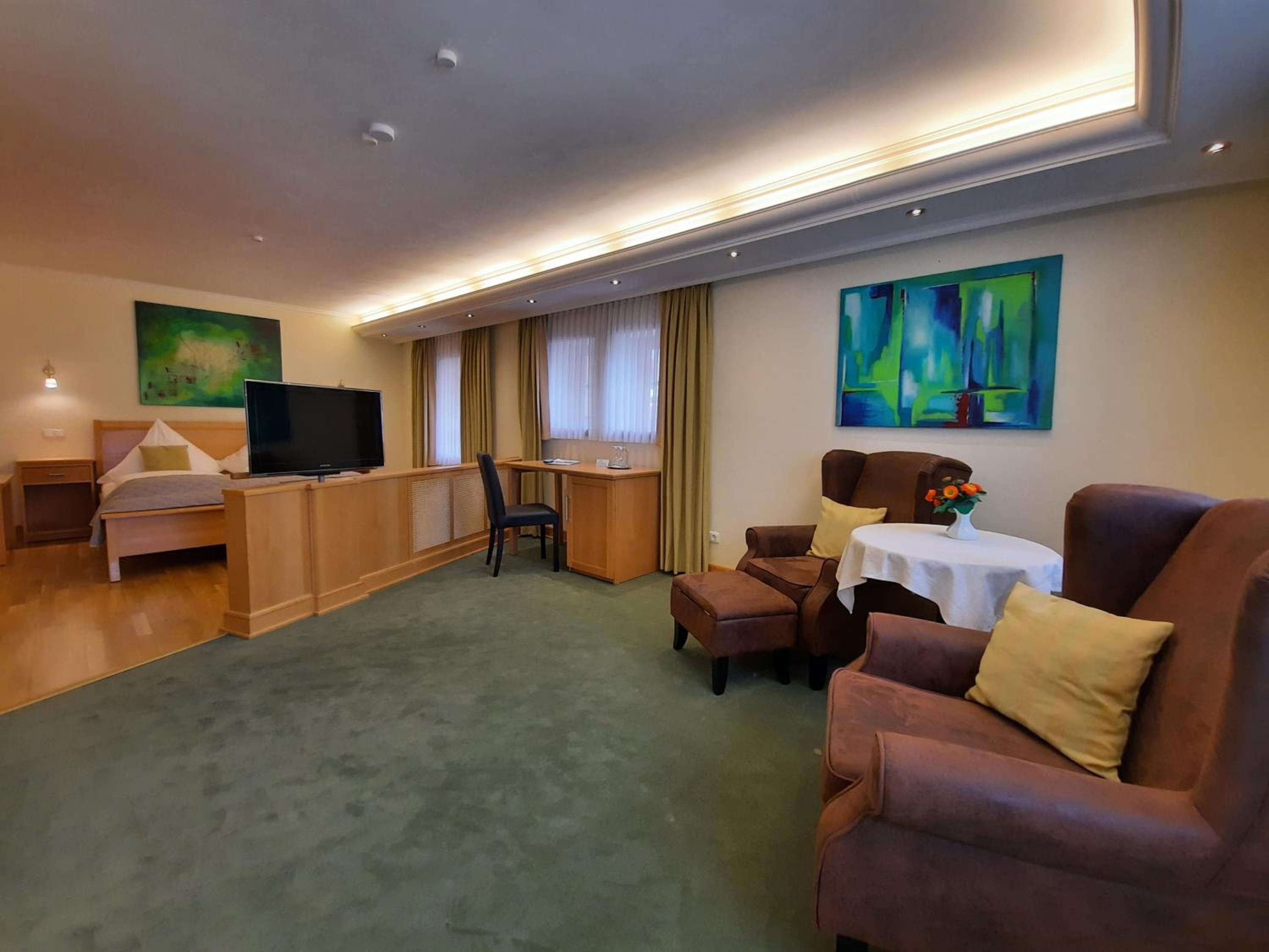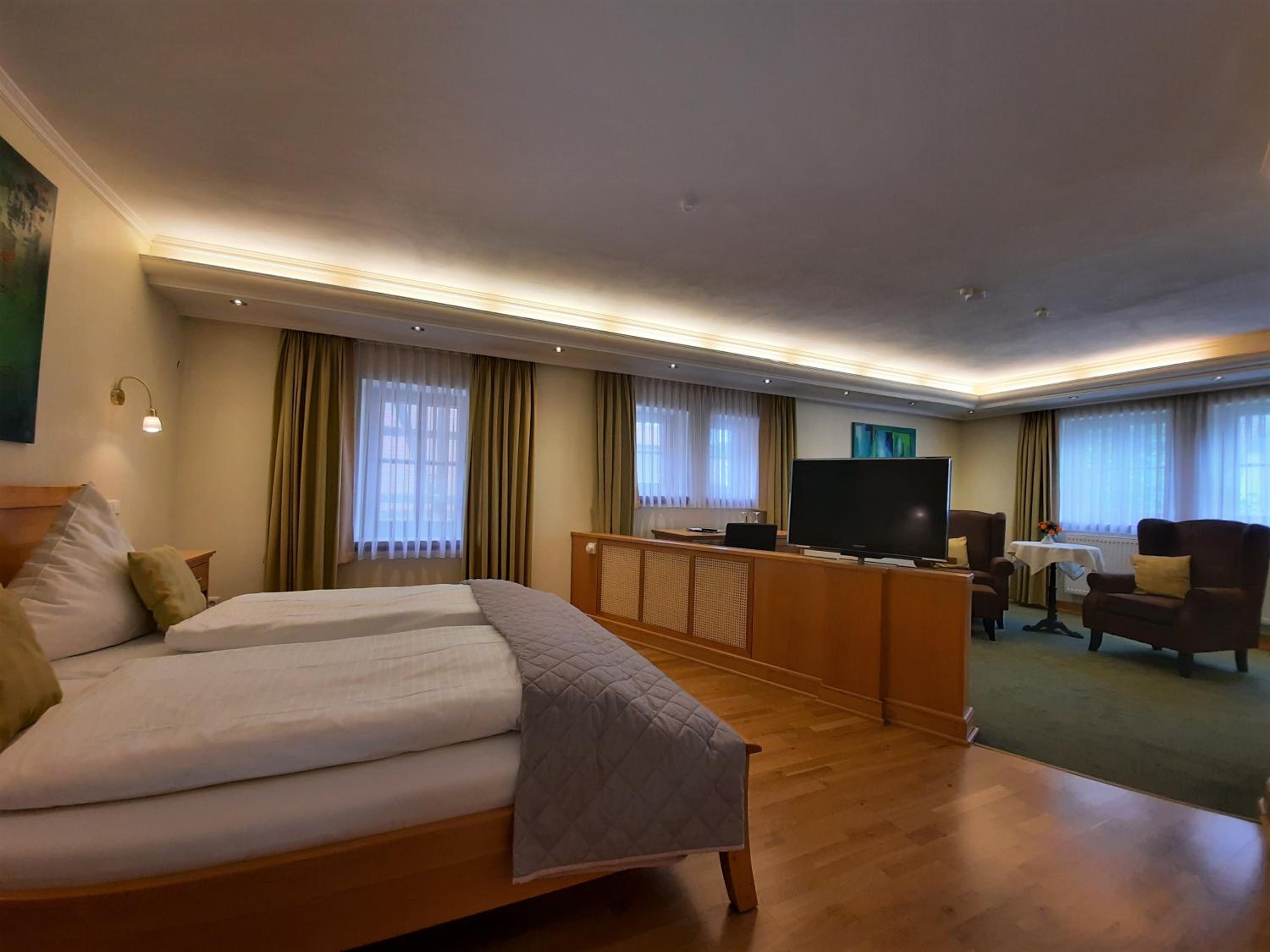 Tolles Ensemble aus Hotel, Café, Theater, Grünanlagen. Super nettes Personal, trockene Garage für unsere Fahrräder, sehr großzügiges Zimmer.
