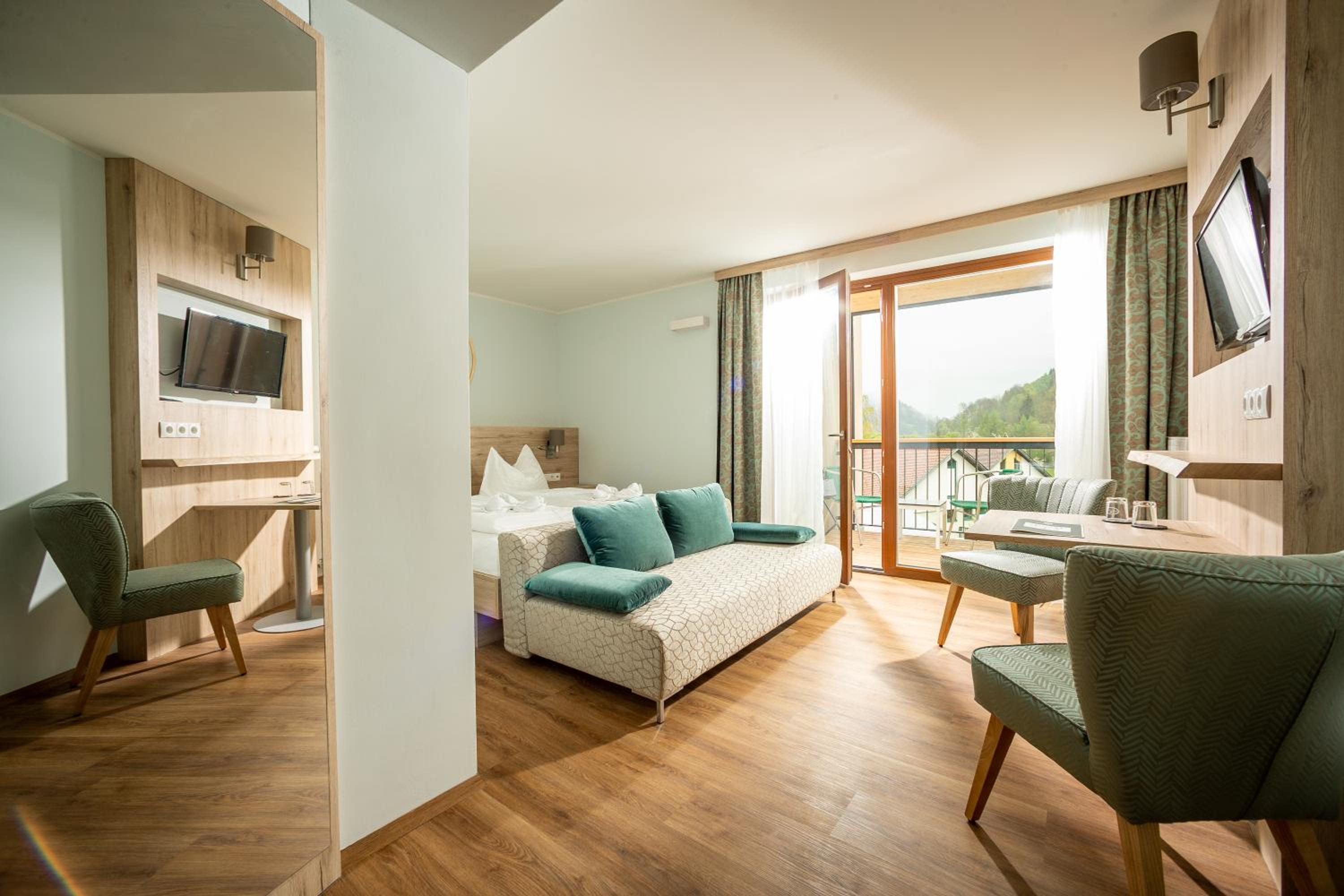 Each room at Hotel Mönichwalderhof features a balcony with stunning countryside views, flat-screen TV, and a cozy seating area. The rooms are elegantly furnished with bright wooden furniture and offer free WiFi in select rooms.