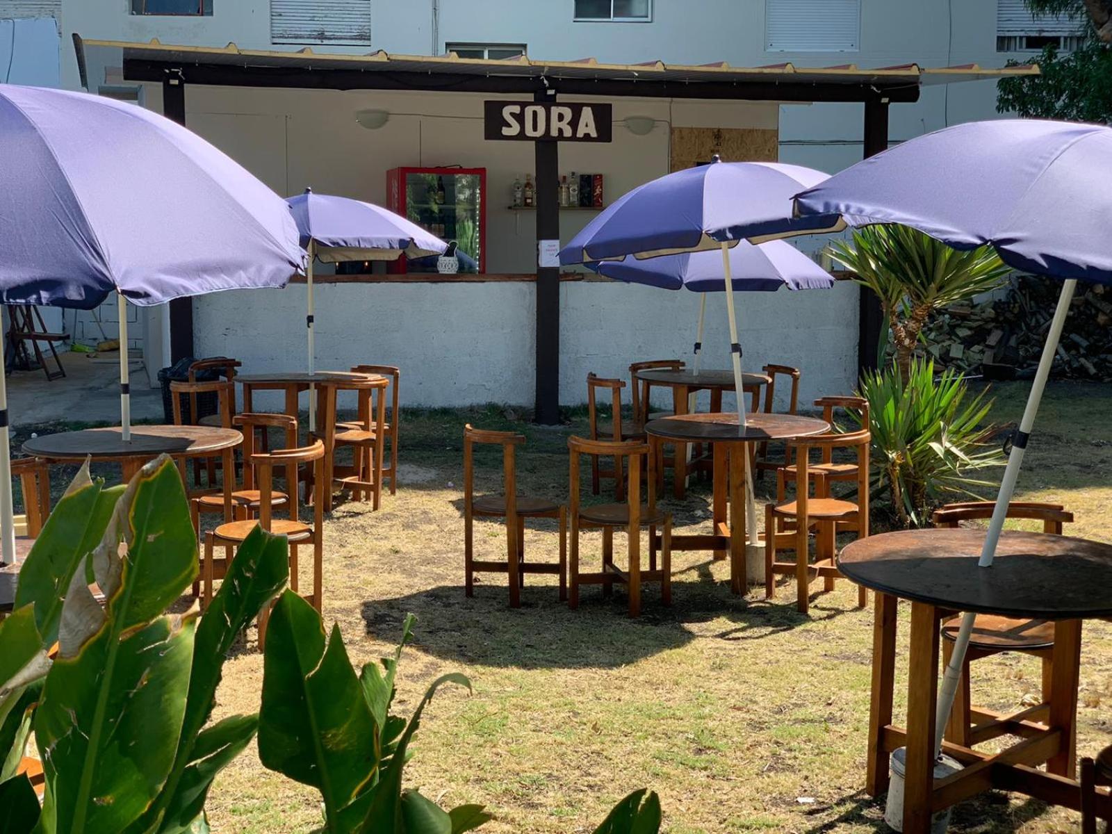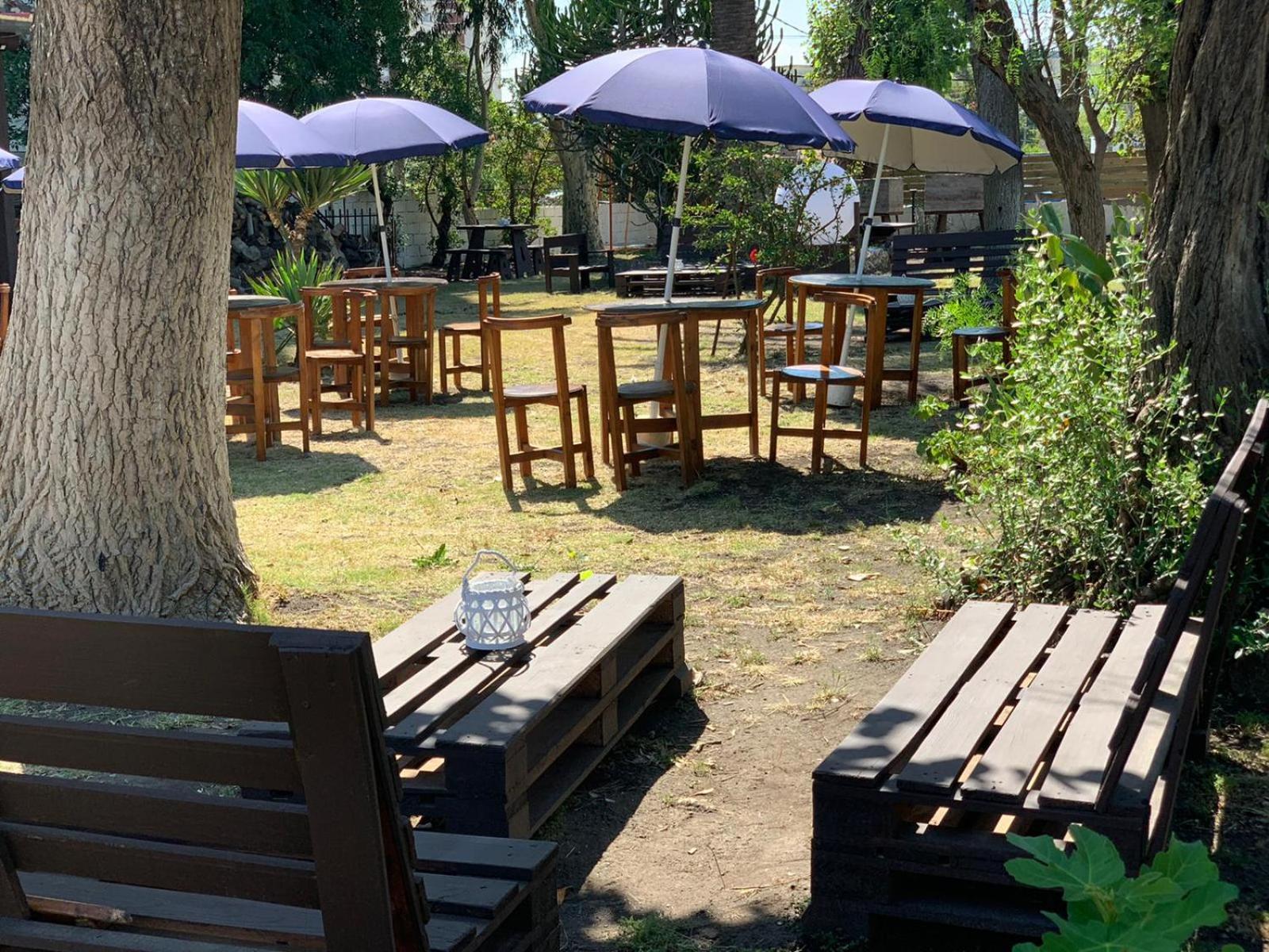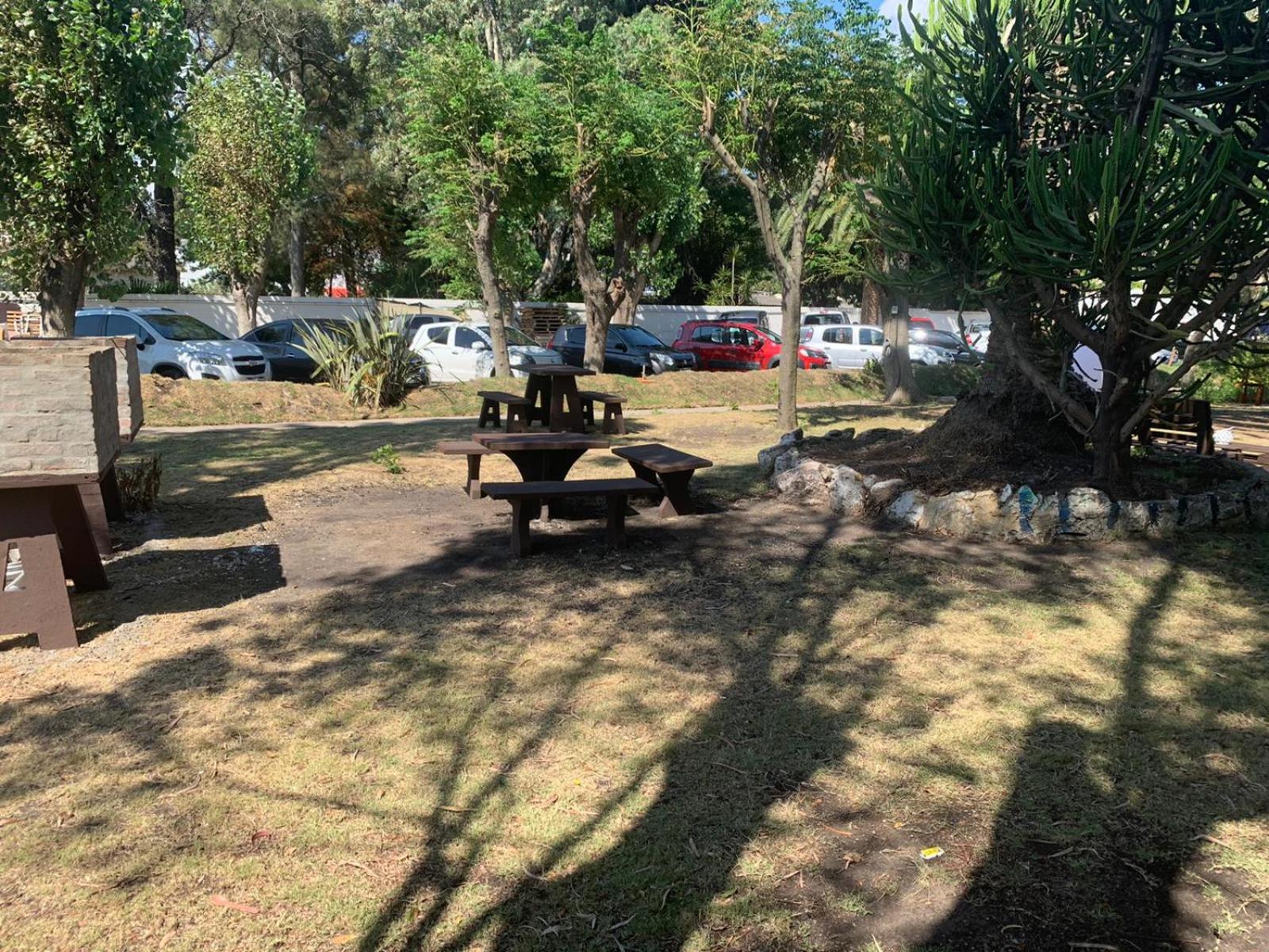 Las mesas con silla de afuera y el estacionamiento amplio.
