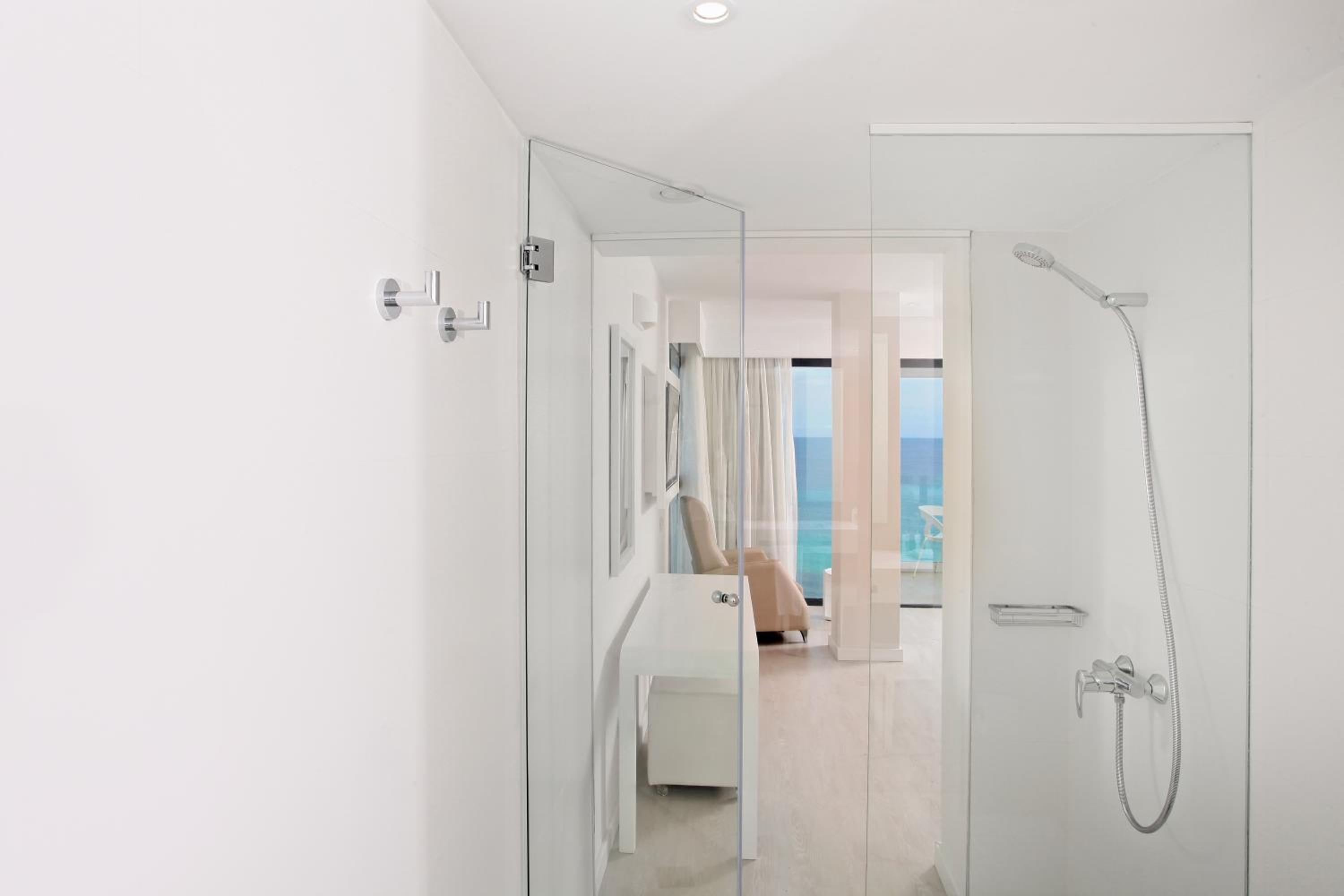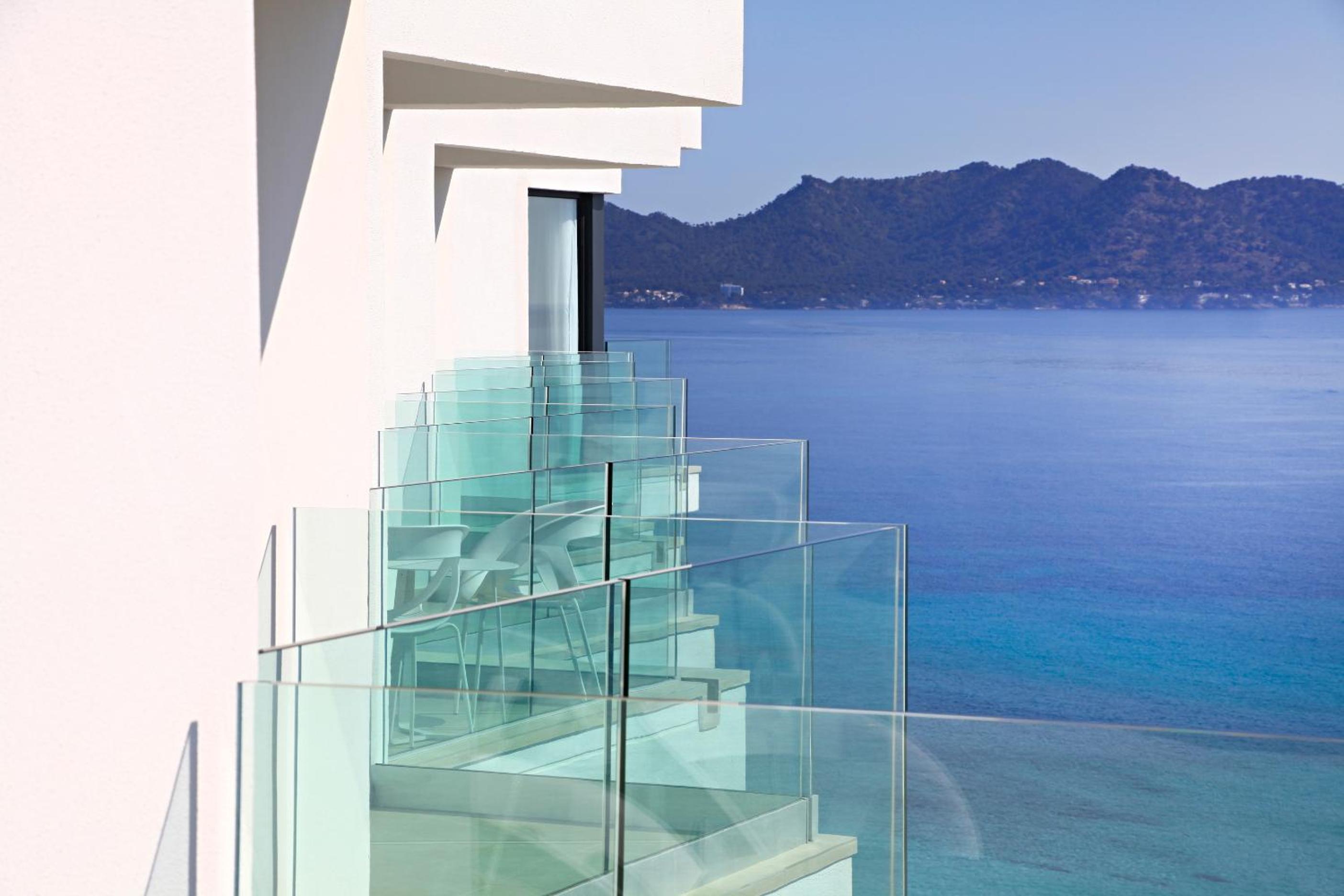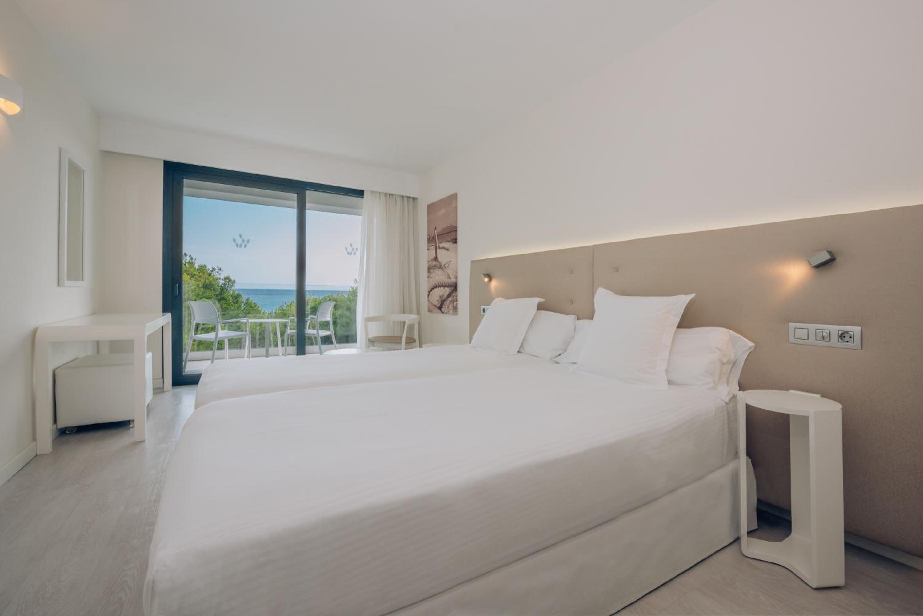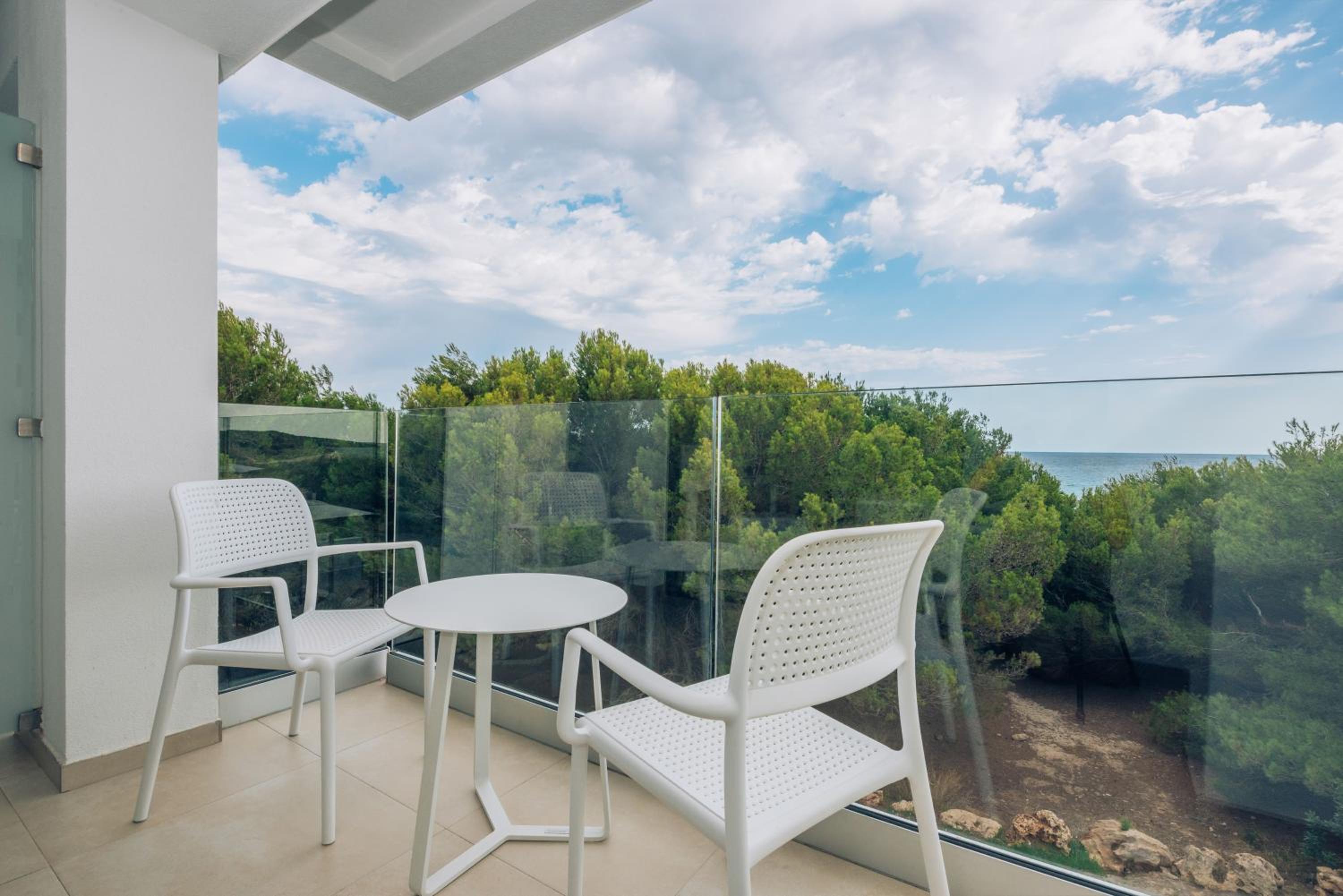 The Iberostar Cala Millor - Adults Only offers elegantly designed rooms with modern amenities including flat-screen TVs and minibars. Each room features a private balcony for guests to enjoy the stunning views.