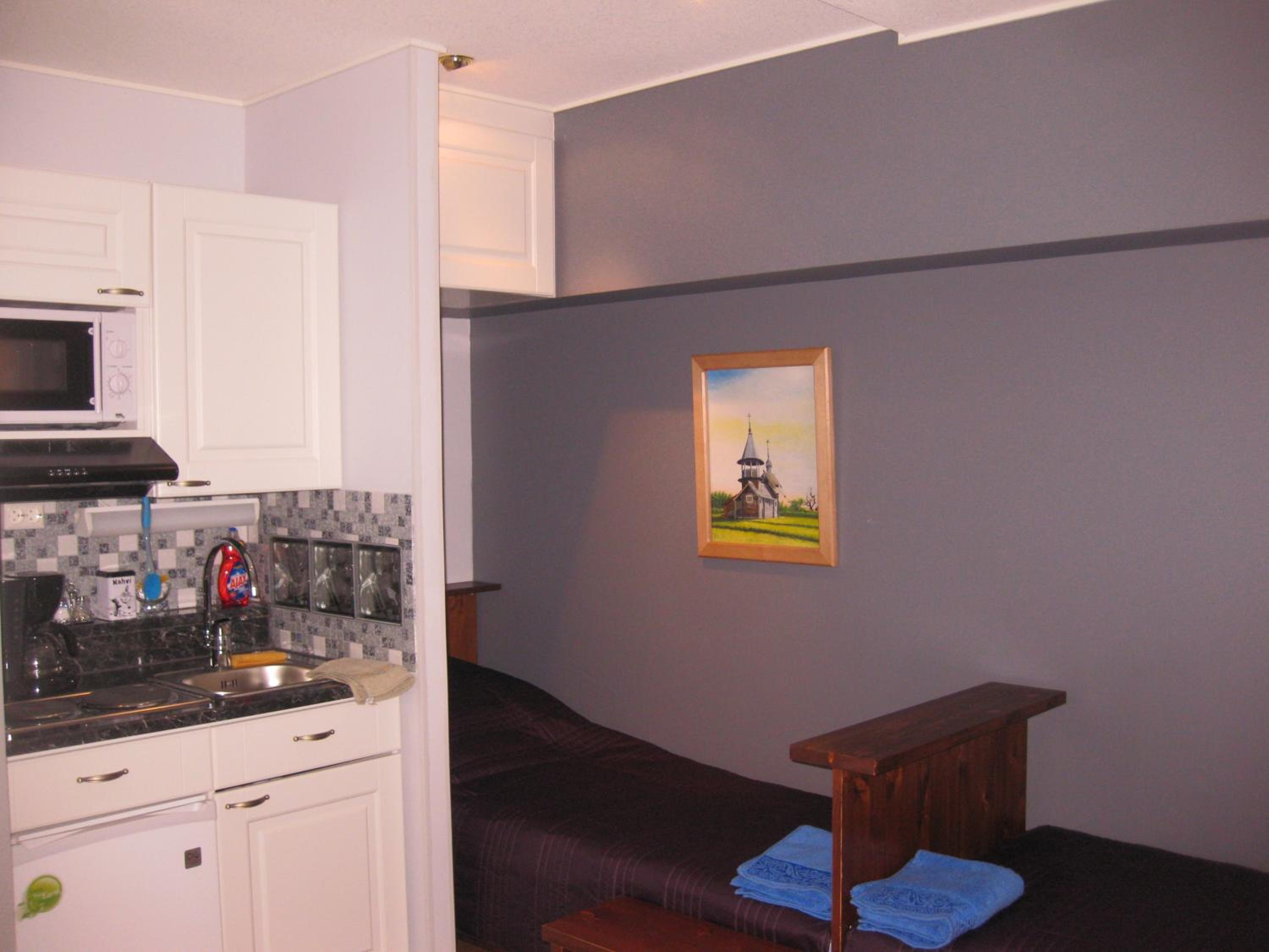 This is what my reservation says: "This studio's standout feature is the sauna. In the fully equipped kitchen, guests will find a stovetop, a refrigerator, a dishwasher and kitchenware. The studio offers a tea and coffee maker, a wardrobe, as well as a private bathroom boasting a shower and a bidet. The unit has 5 beds"