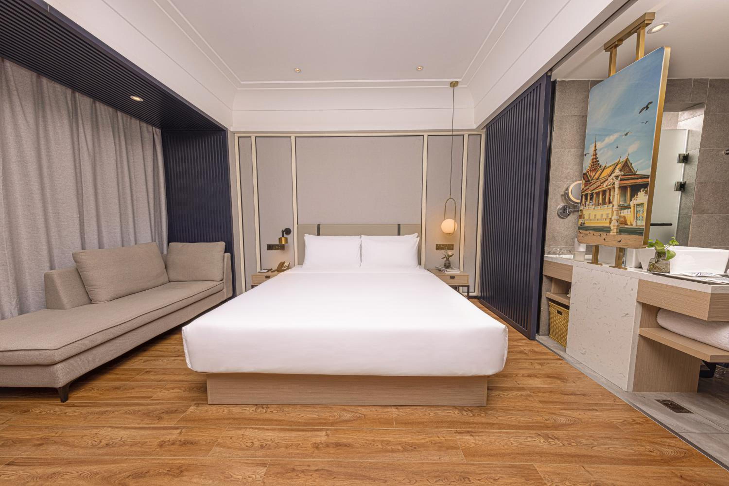 Experience modern and luxurious accommodation at Marco Polo Hotel in Phnom Penh. The air-conditioned rooms offer city views and are equipped with amenities like a flat-screen TV, minibar, and en suite bathroom for a comfortable stay.