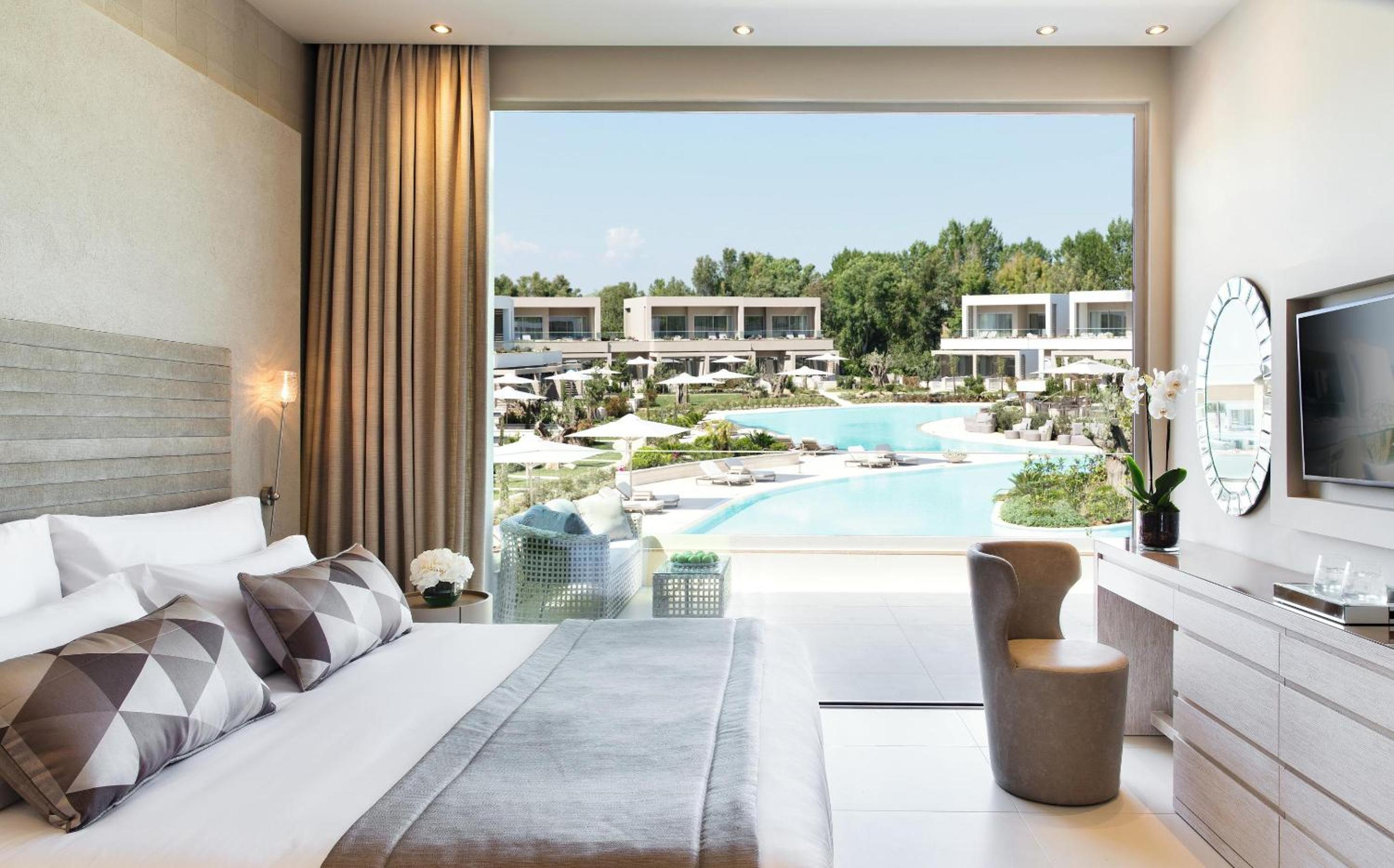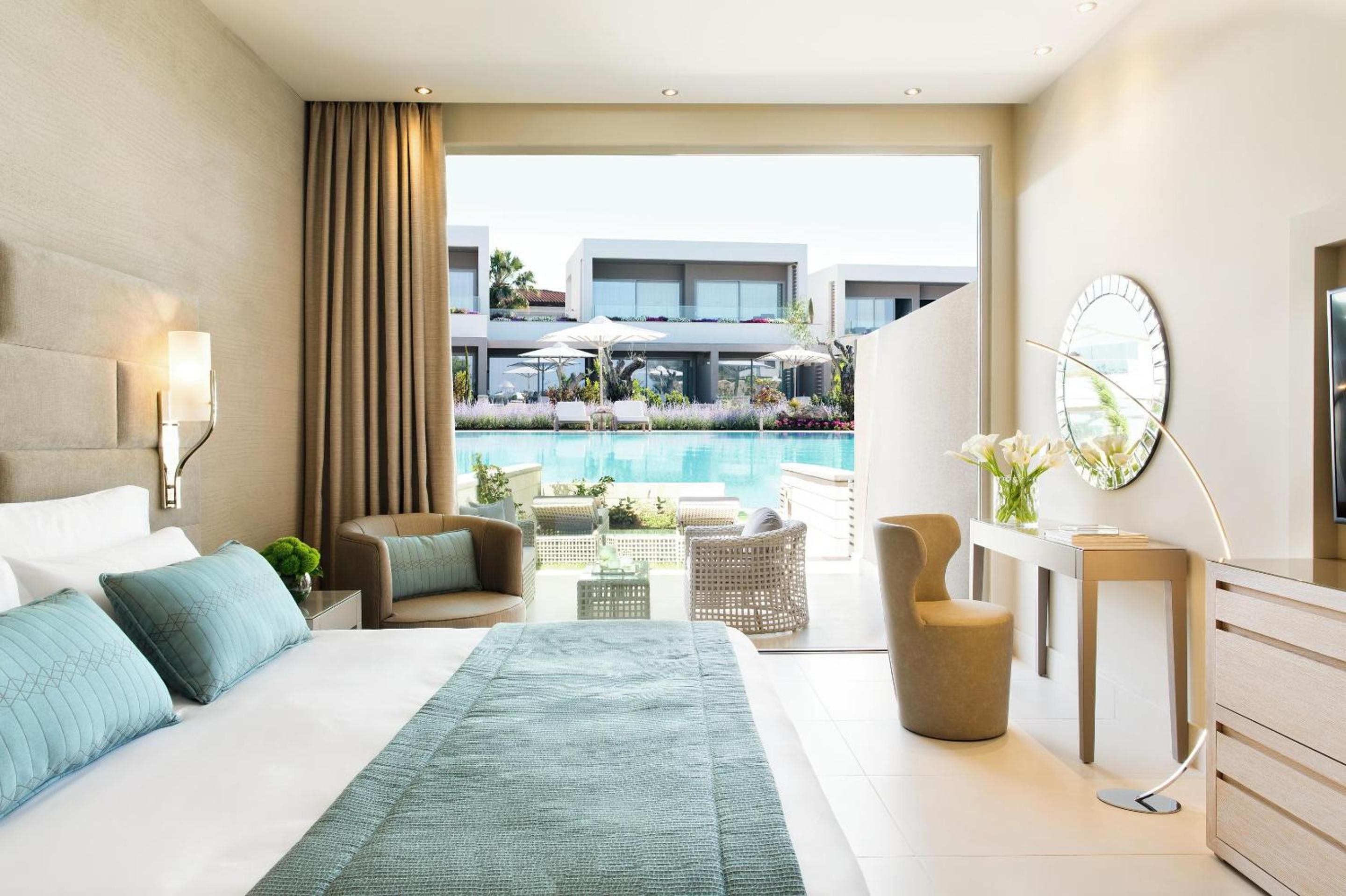 Sani Dunes offers modern rooms and suites with breathtaking Aegean Sea or pool views. Enjoy amenities like Nespresso machines, free WiFi, and private bathrooms in each elegantly designed space.