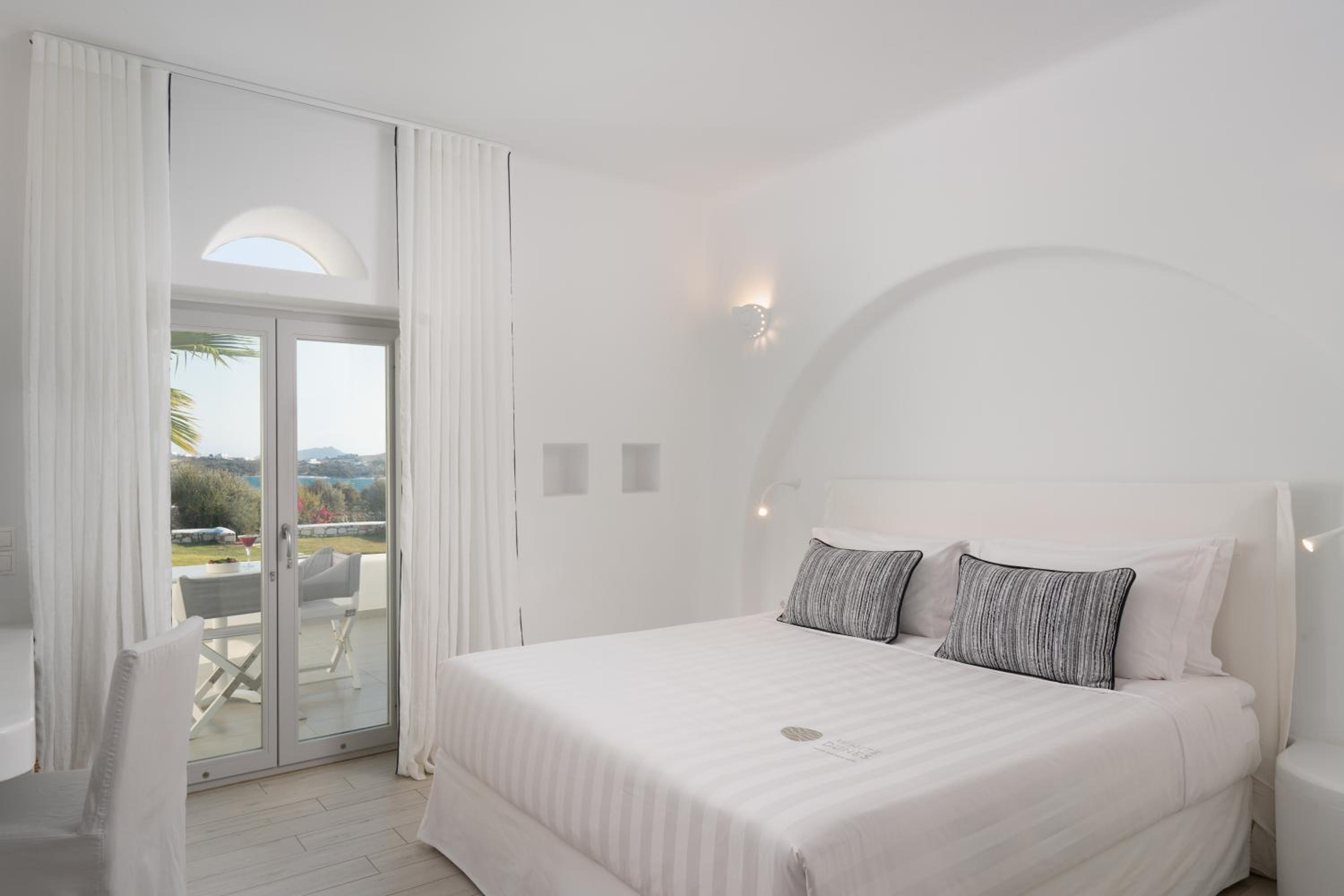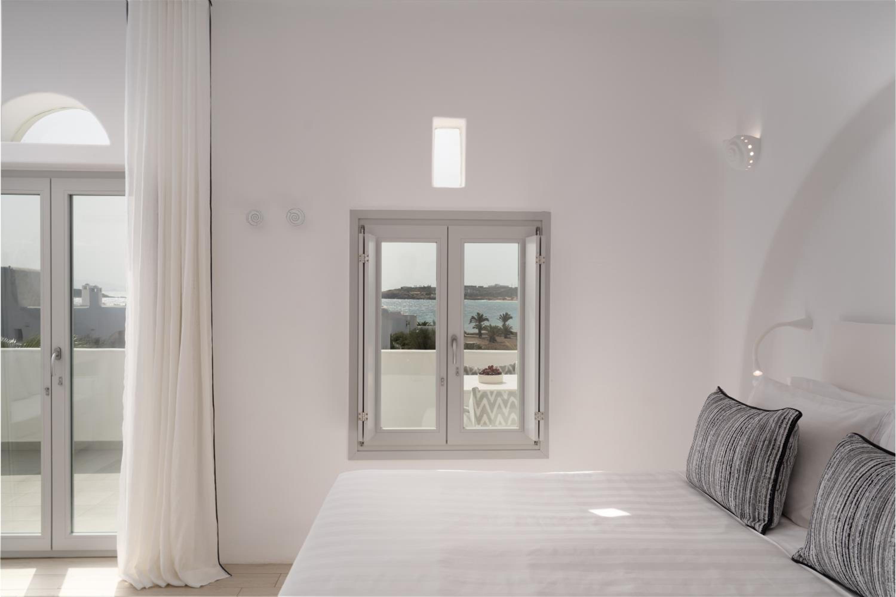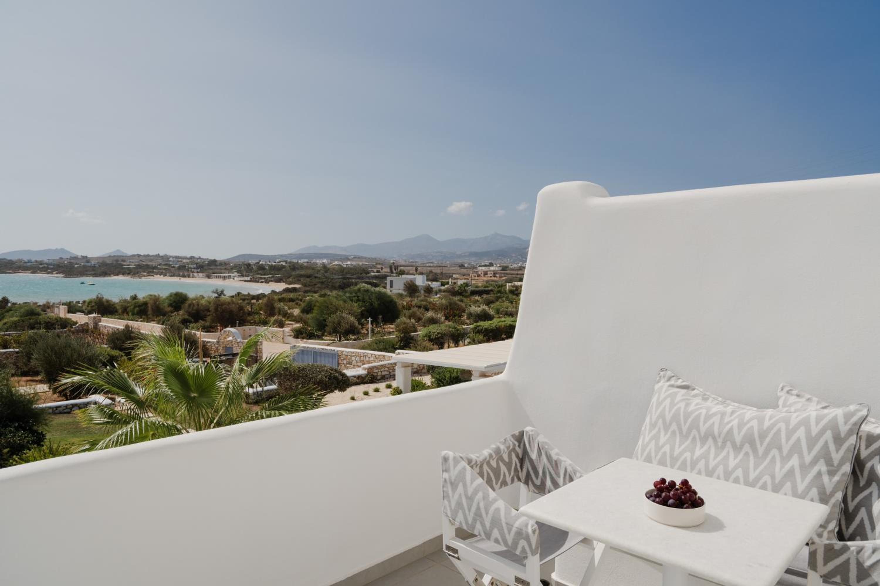 Wonderful stay. Staff was warm, friendly, and not only met our needs, but anticipated them. Customer service was exemplary. Beautiful facility and rooms. Very quiet atmosphere. You can see water at Santa Maria beach, but 1st floor rooms only get a peak. Short walk to this nice beach. Short drive to Naoussa. Delicious breakfast with many options. More limited dinner menu at on site restaurant but tasty and enjoyable. Highly recommend this hotel