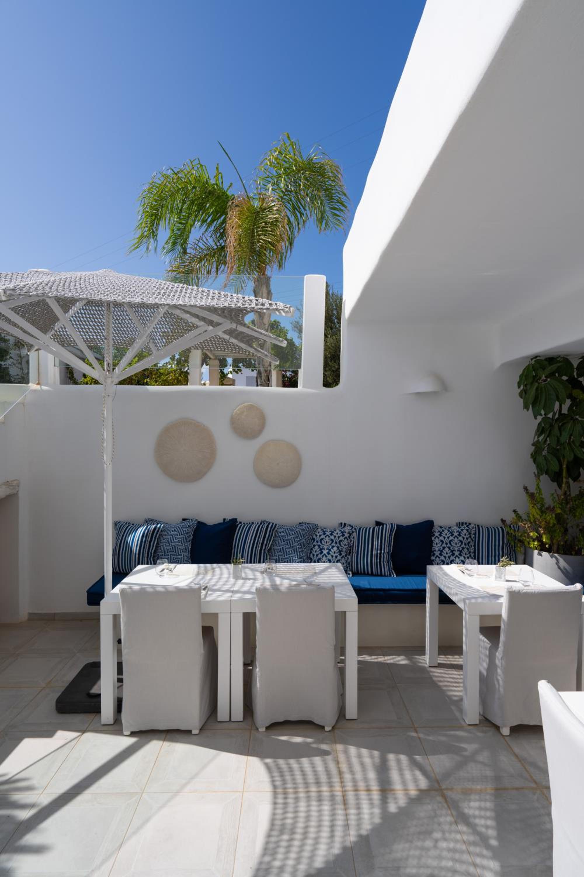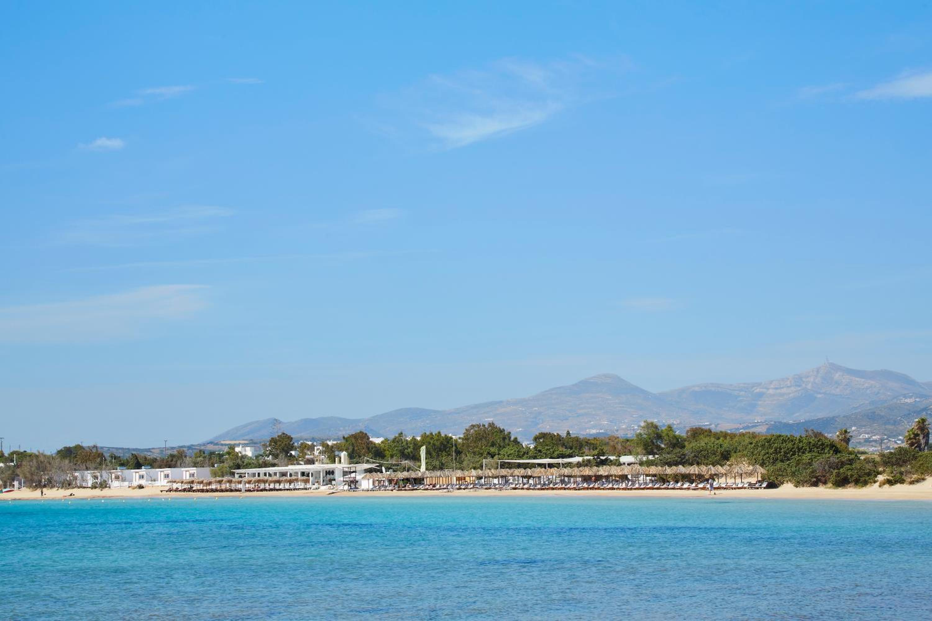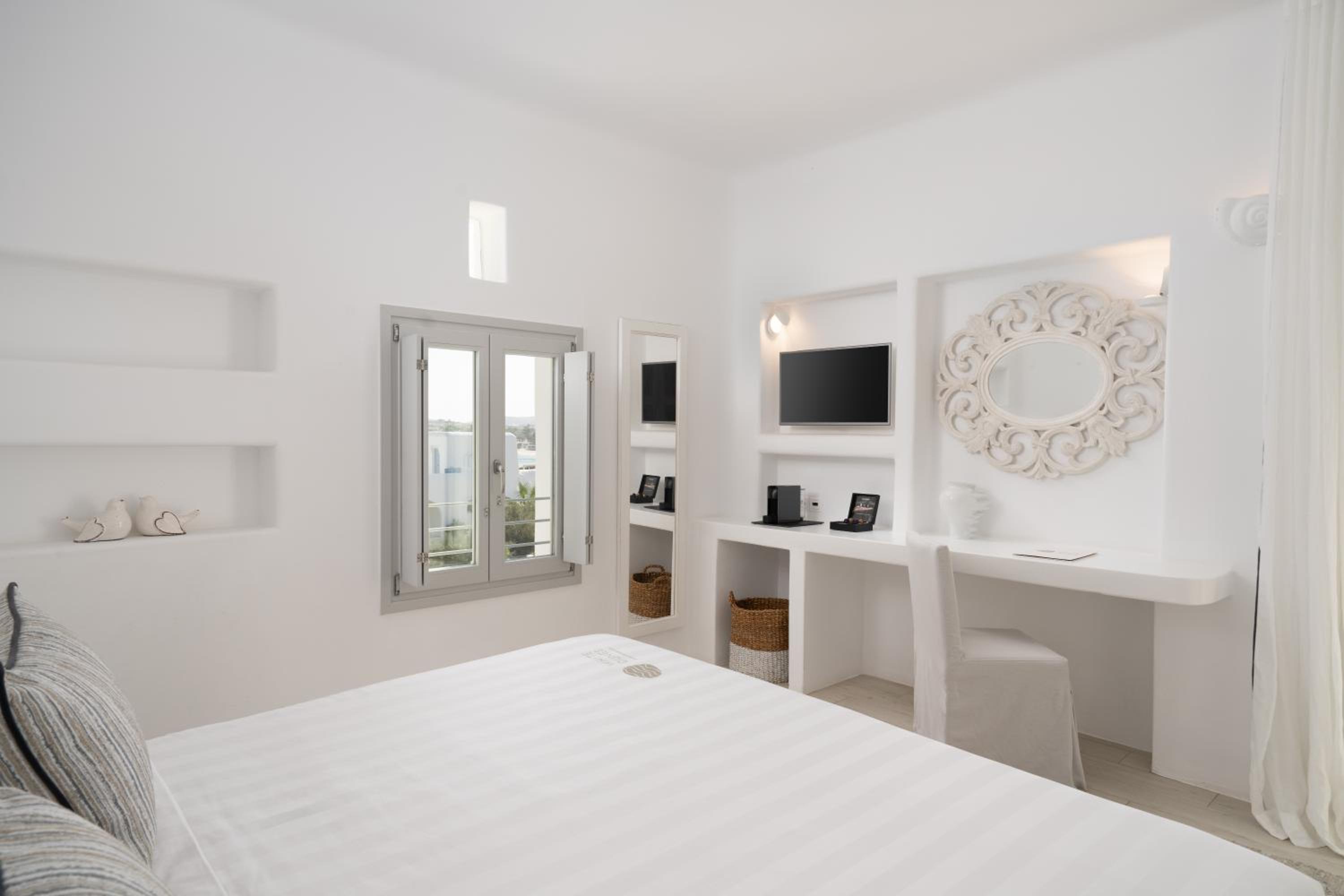 Wonderful stay. Staff was warm, friendly, and not only met our needs, but anticipated them. Customer service was exemplary. Beautiful facility and rooms. Very quiet atmosphere. You can see water at Santa Maria beach, but 1st floor rooms only get a peak. Short walk to this nice beach. Short drive to Naoussa. Delicious breakfast with many options. More limited dinner menu at on site restaurant but tasty and enjoyable. Highly recommend this hotel