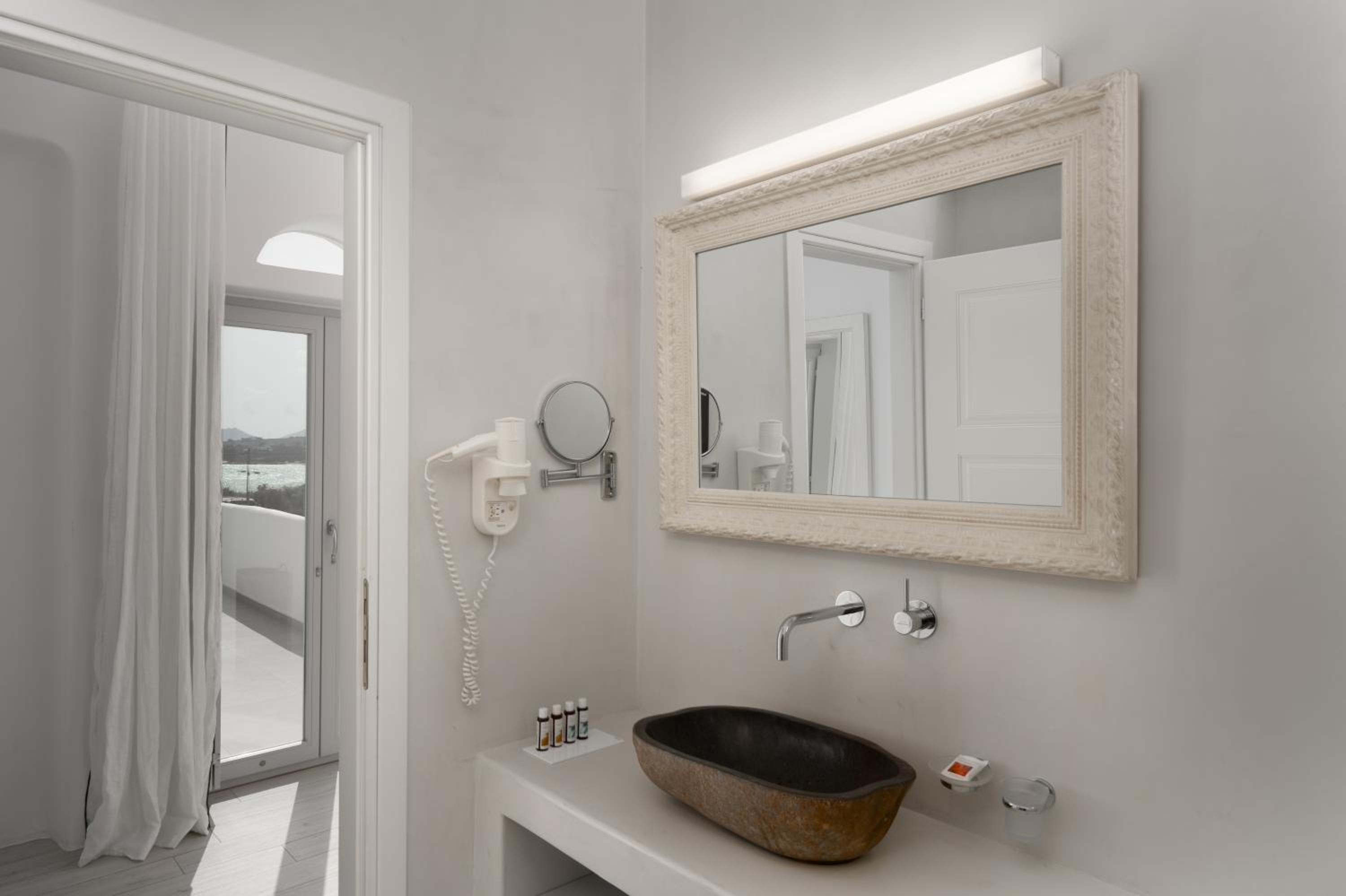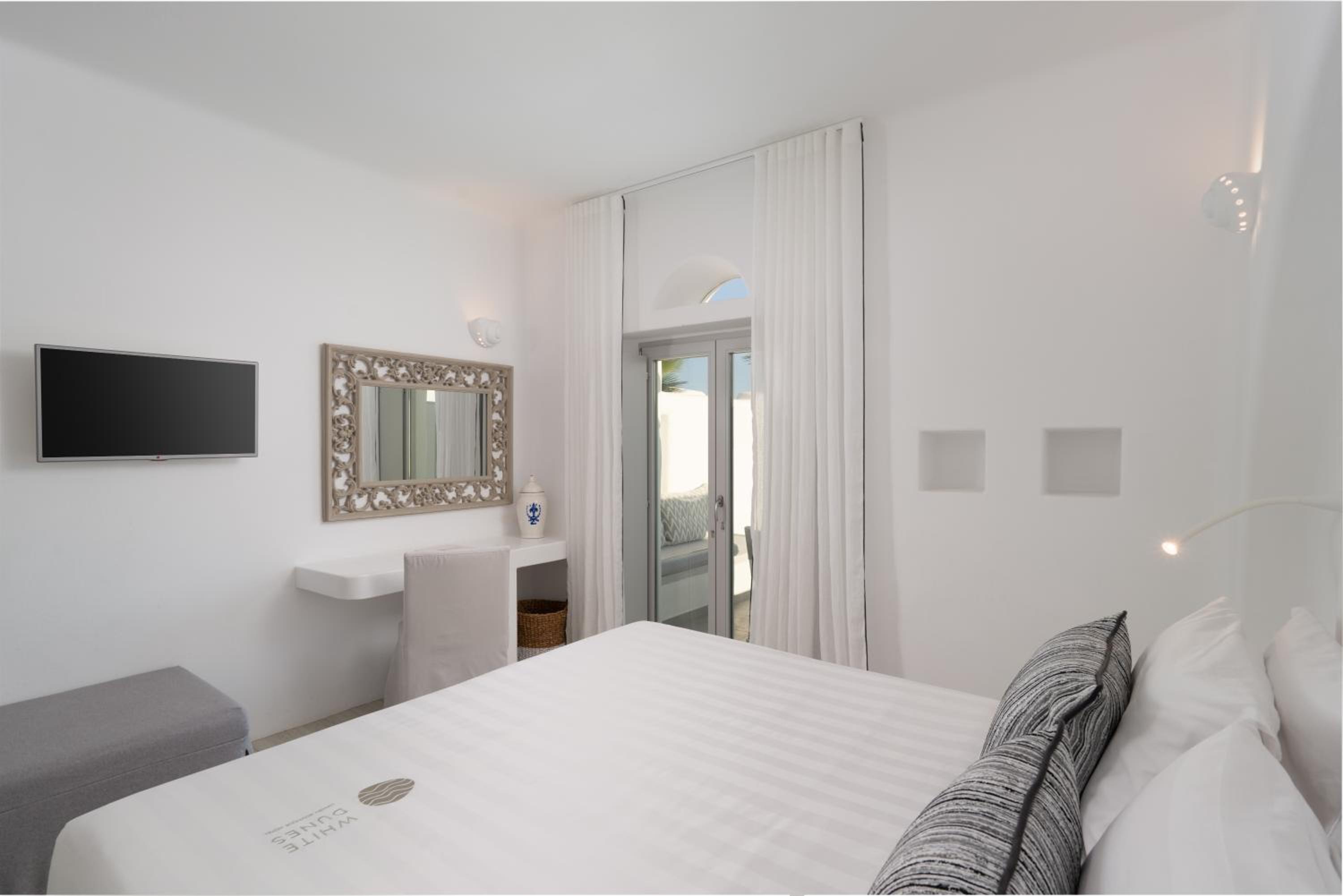 Indulge in the breathtaking Aegean Sea views from your spacious balcony or terrace at White Dunes Luxury Boutique Hotel. Relax in comfort on Coco-Mat mattresses and enjoy the entertainment on a flat-screen TV with satellite channels.