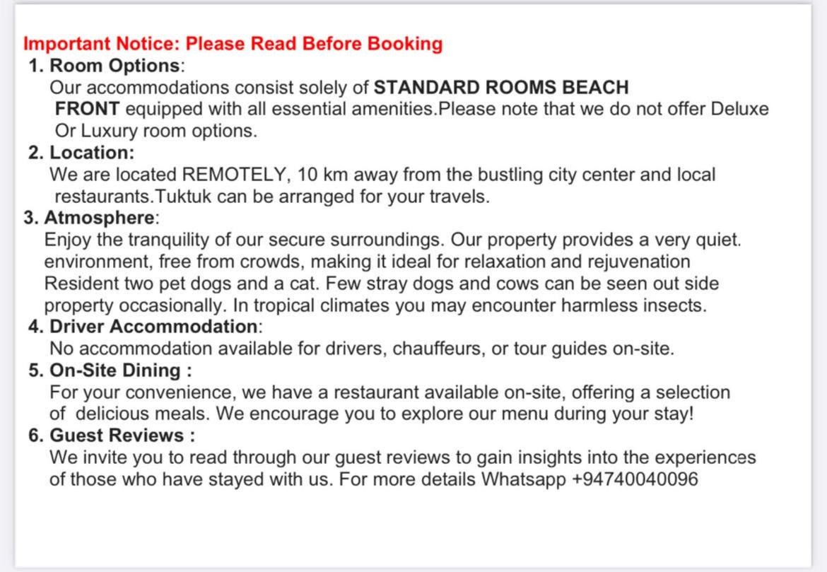 Hotel uprzedza, że jest daleko od wszystkiego. Około 10 min. tuk tukiem od miasta. Daje w zamian pustą plażę i spokój. Jedzenie jest serwowane na miejscu. Proste umeblowanie pokoi. Każdy z widokiem na morze. Fale są dość duże (listopad) i szybko jest głęboko.