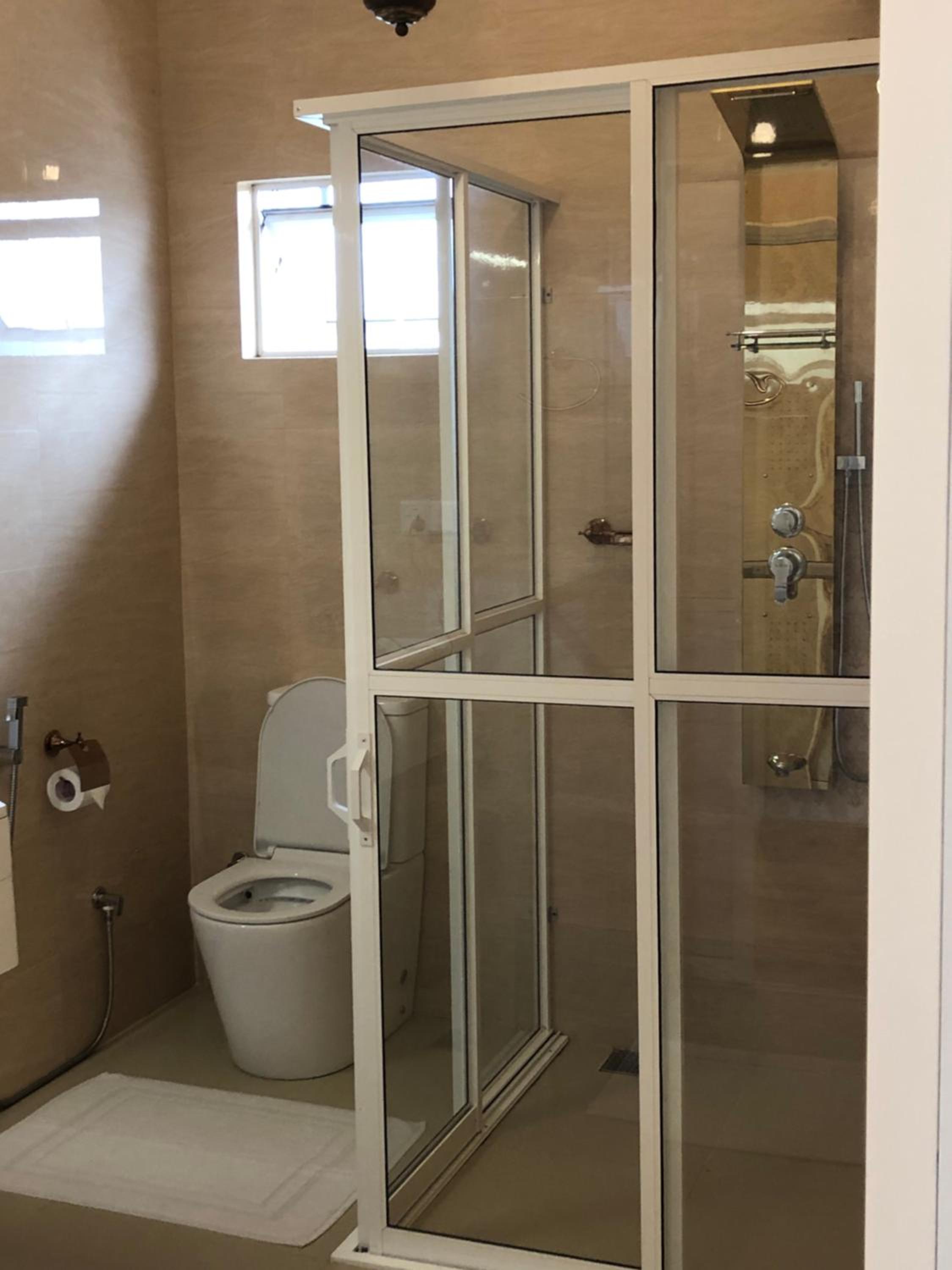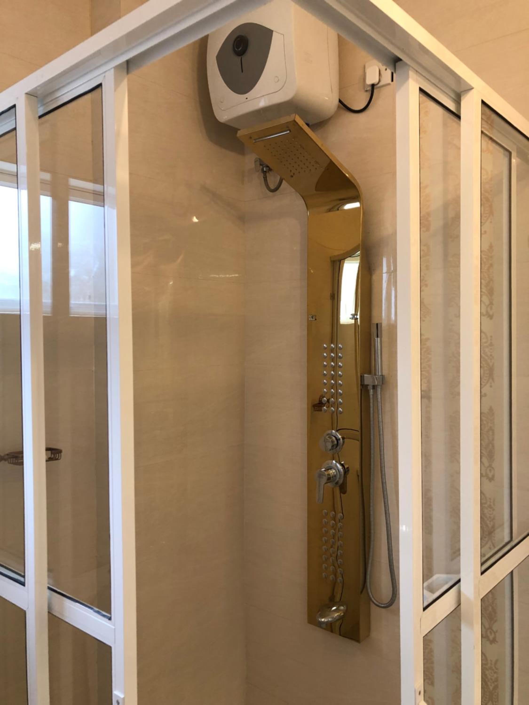 Baño con mampara, grande y limpio. Tiene secador.