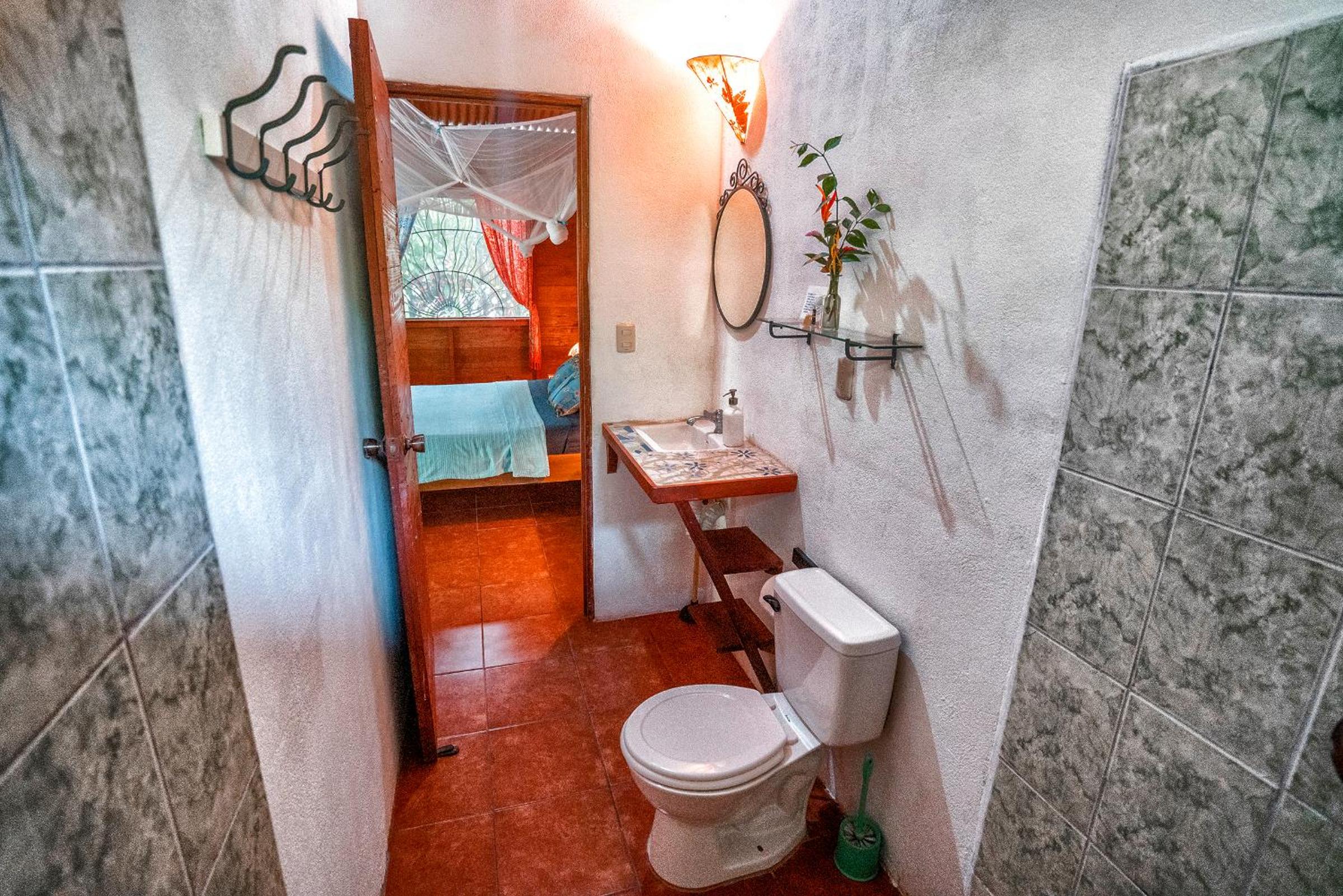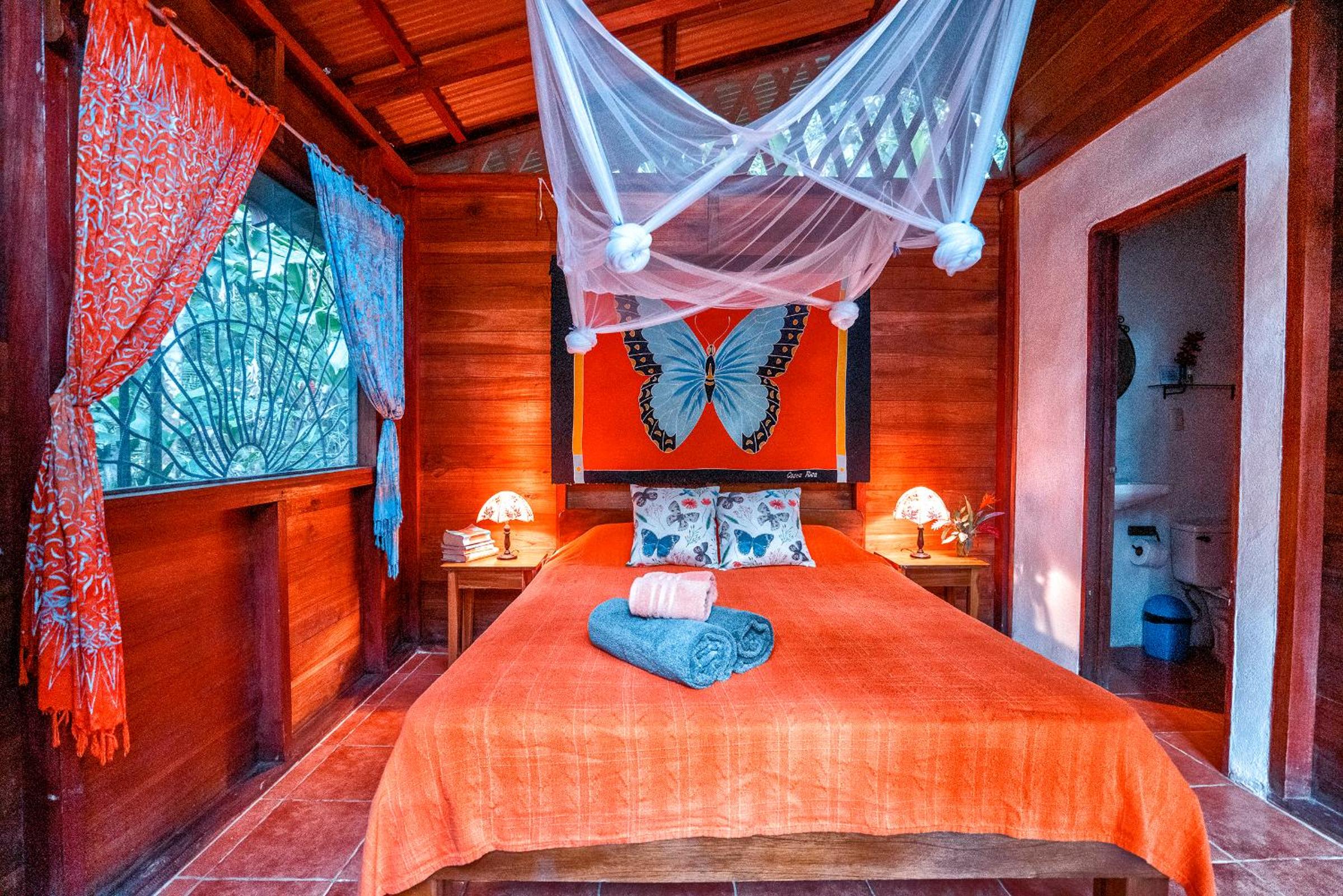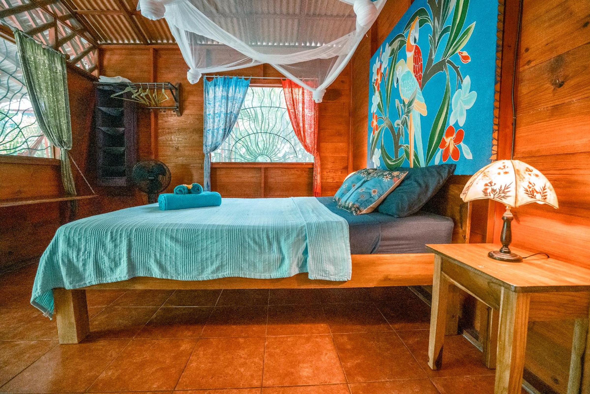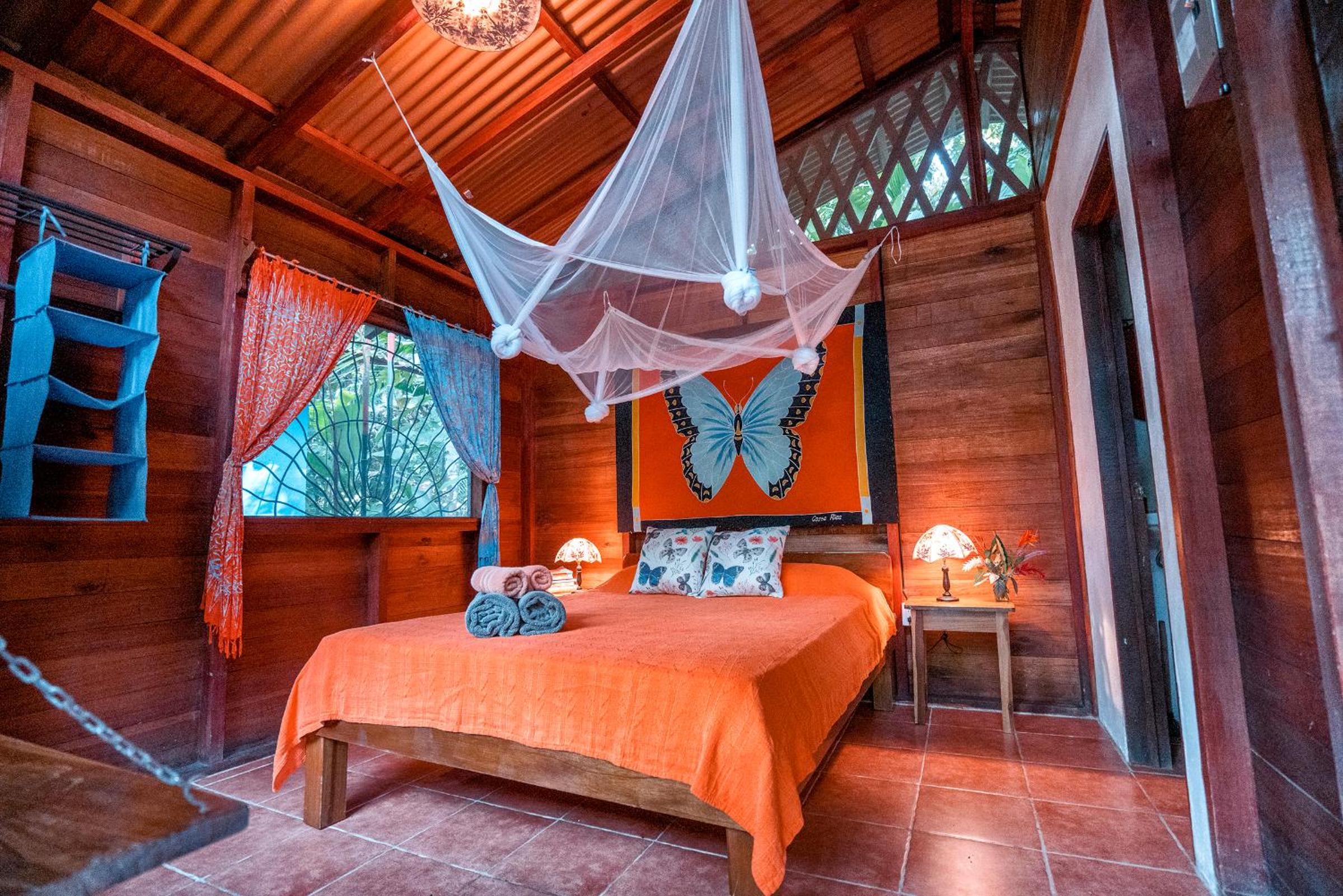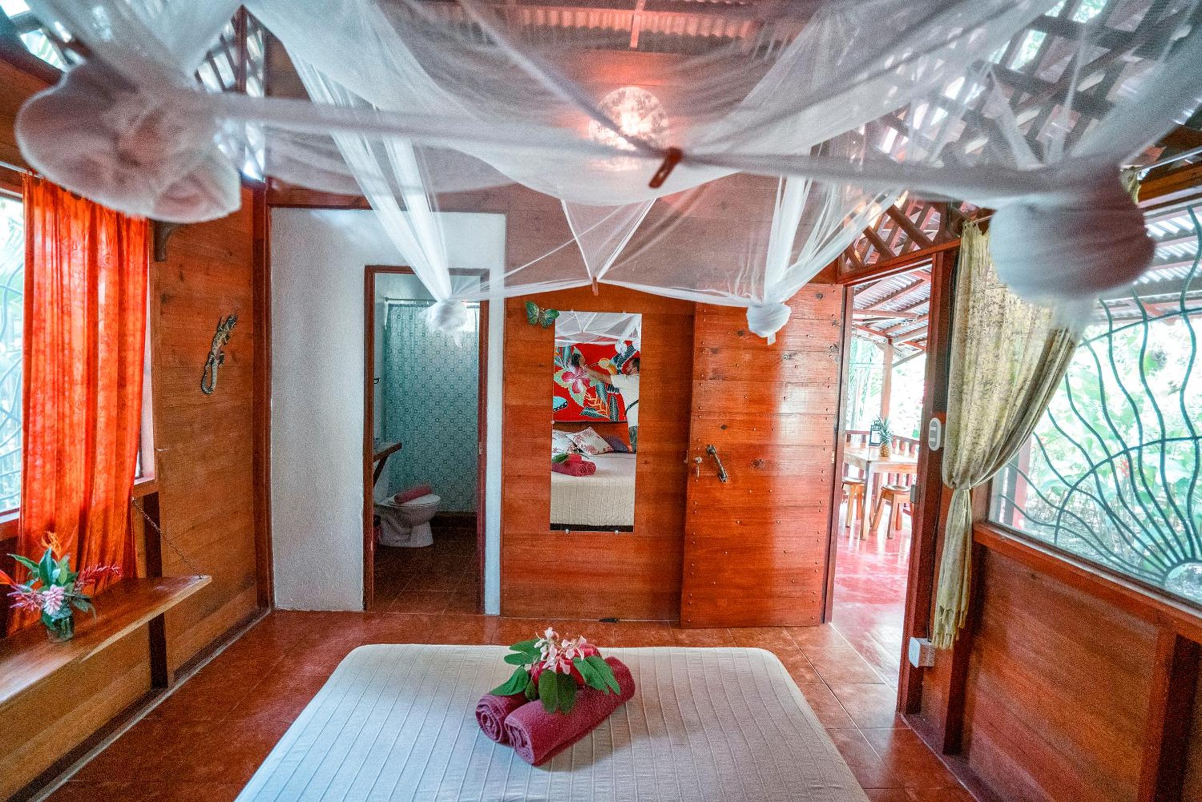 This place is for nature lovers. Only 4 huts in almost a jungle/park. You can watch colibres from your hammack. Slotsh in nearby, I also saw aguris. Very close to Puerto Viejo and walking distance from Playa Negra. There is mosquito net installed, that is pretty new.