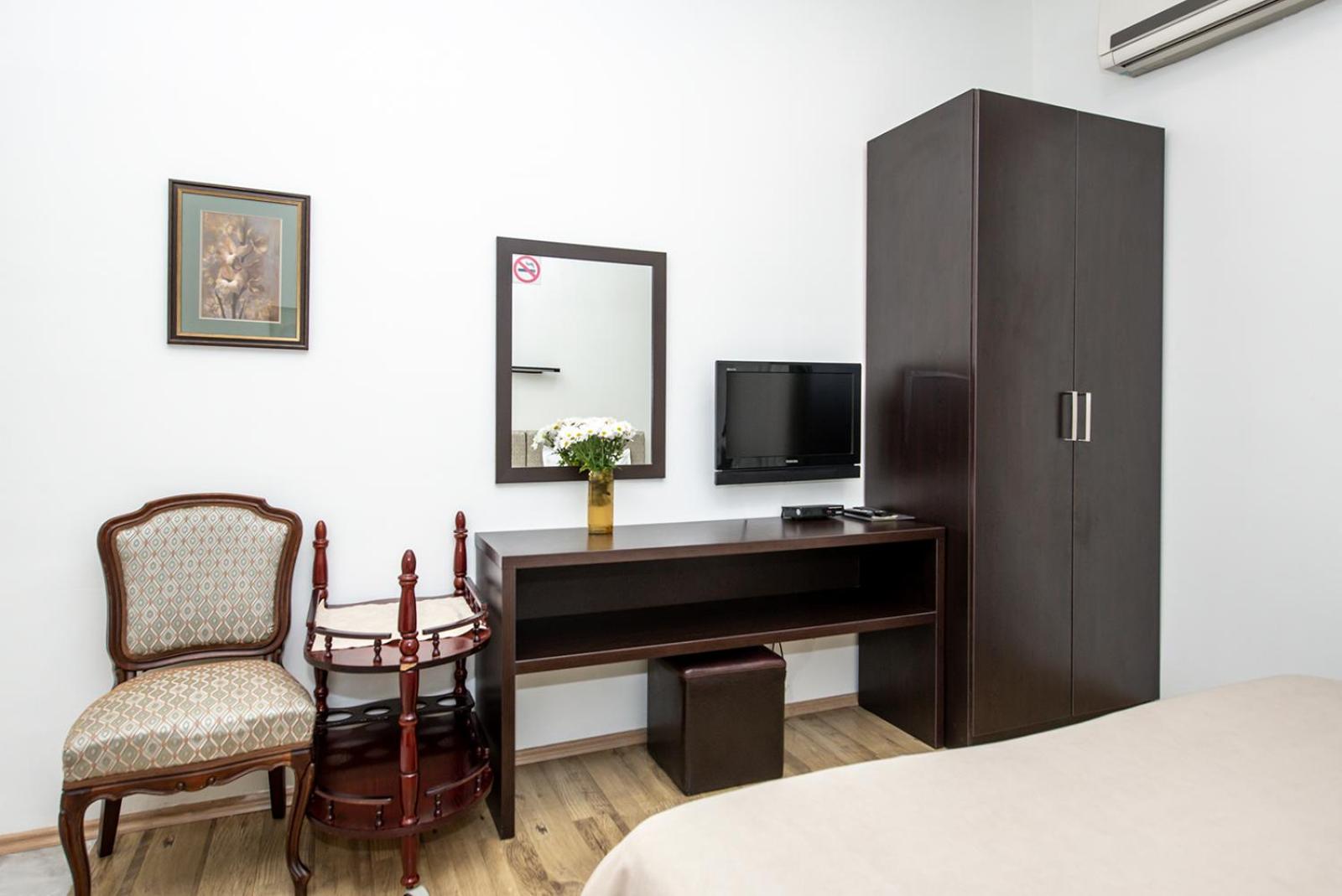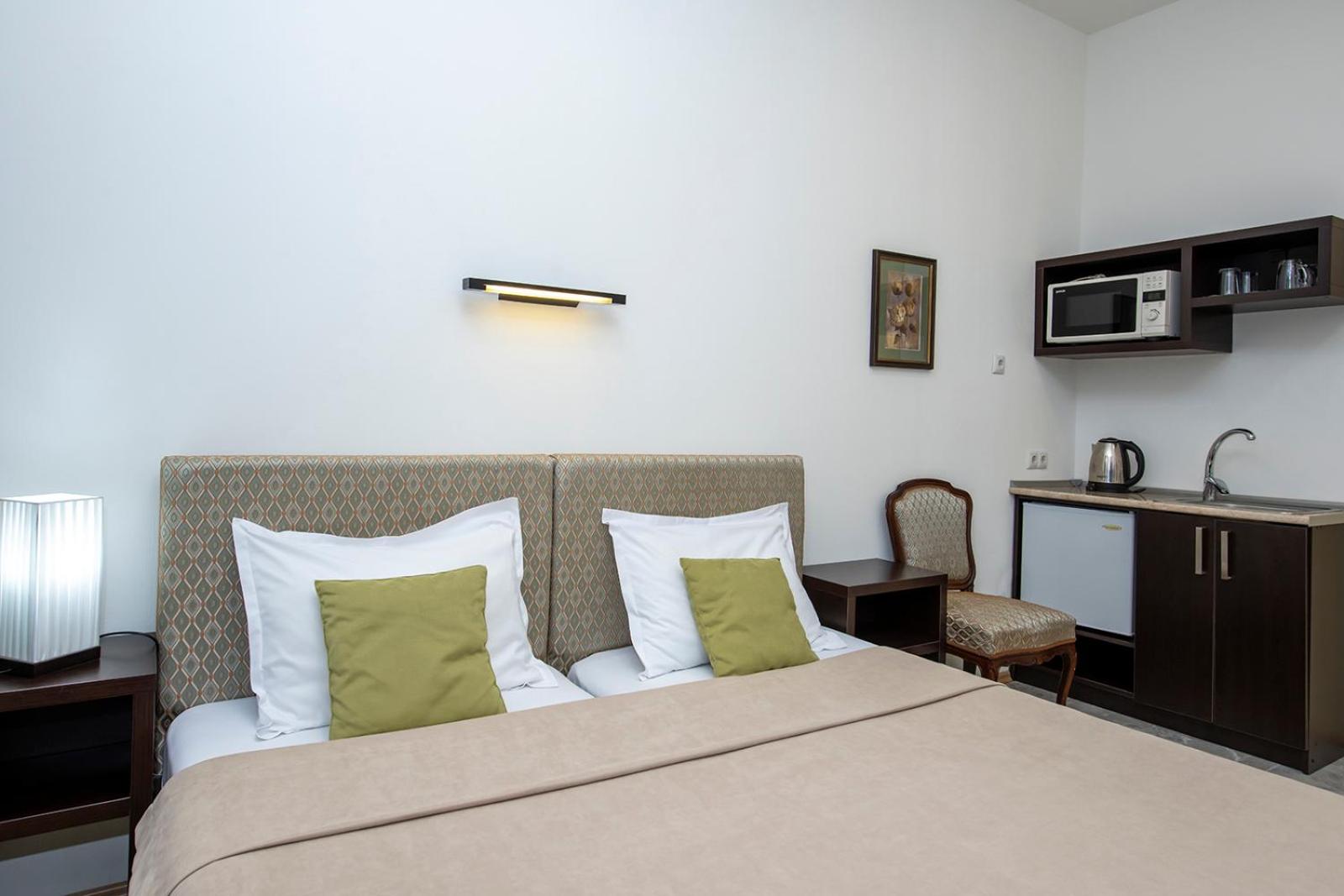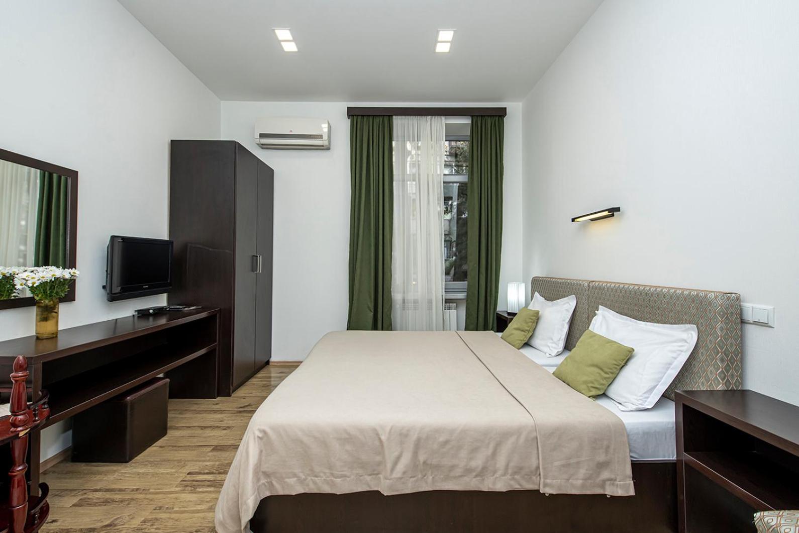 Modern Amenities: Enjoy chic rooms with cable TV, modern bathrooms, and kitchenettes at Apart Hotel GH. The interiors boast a soothing color palette and elegant wooden floors, with some rooms even offering a balcony for a breath of fresh air.