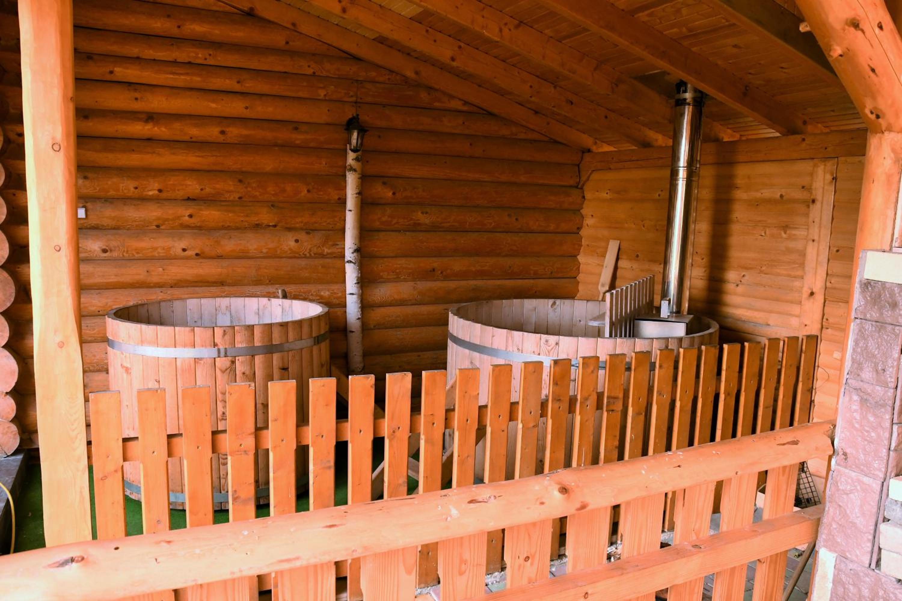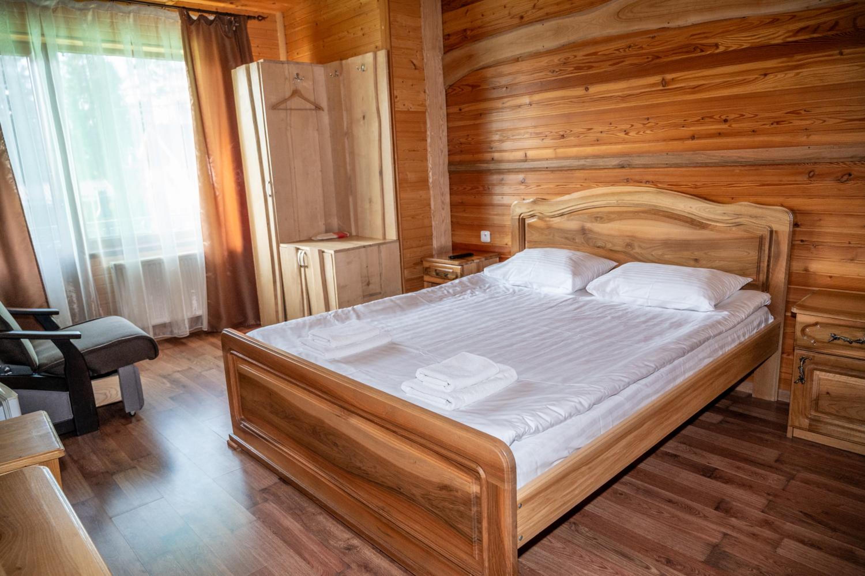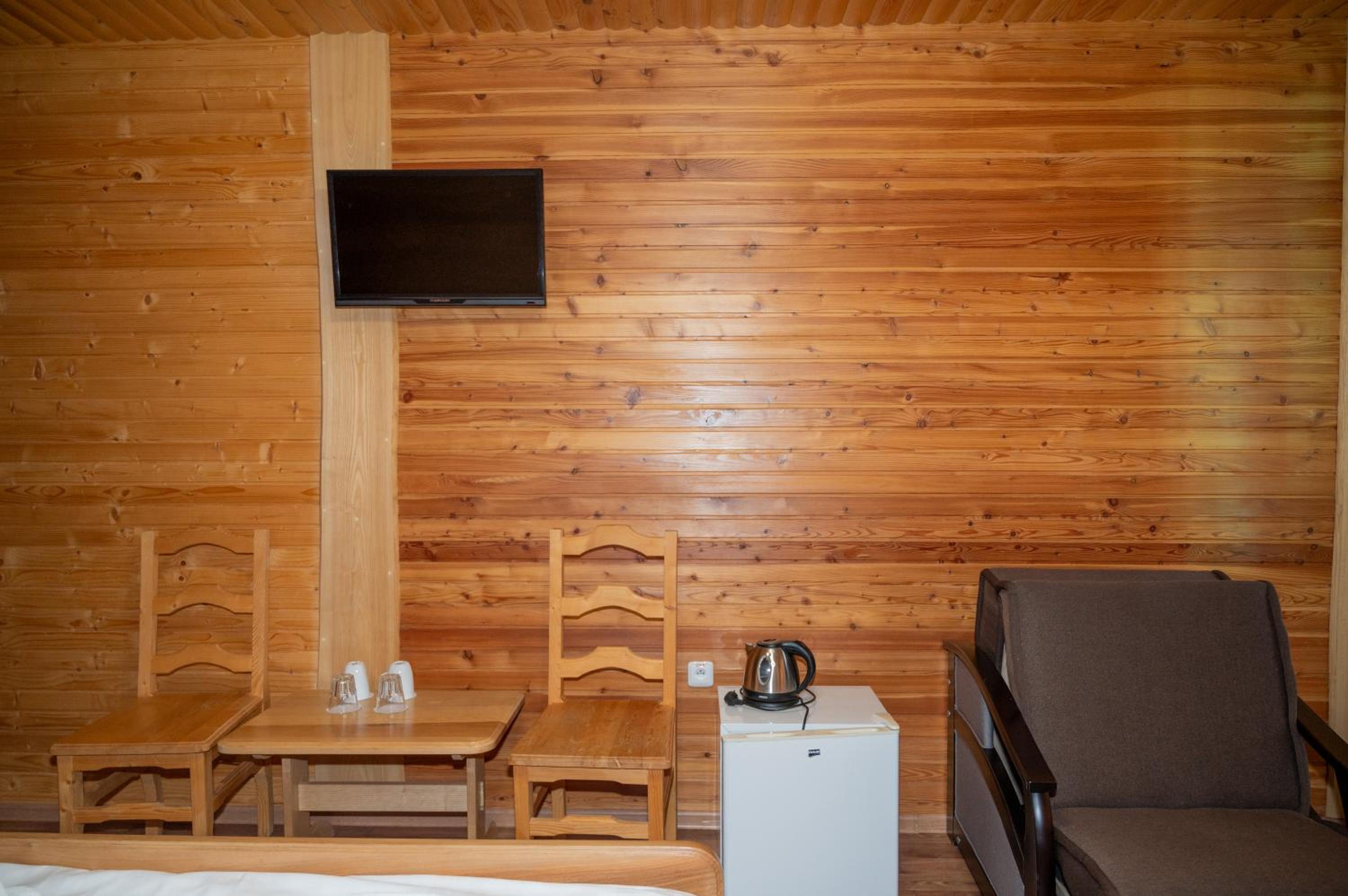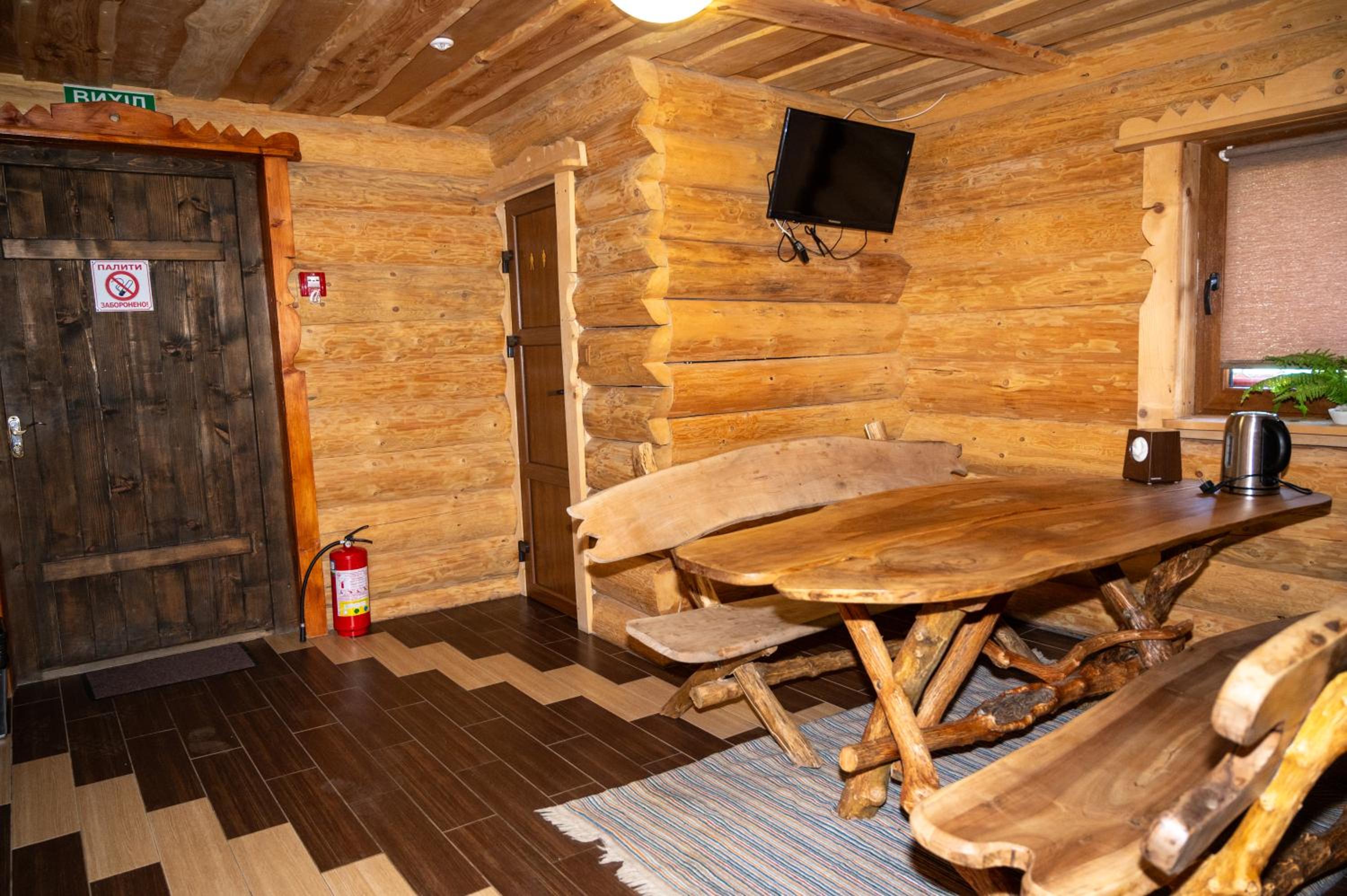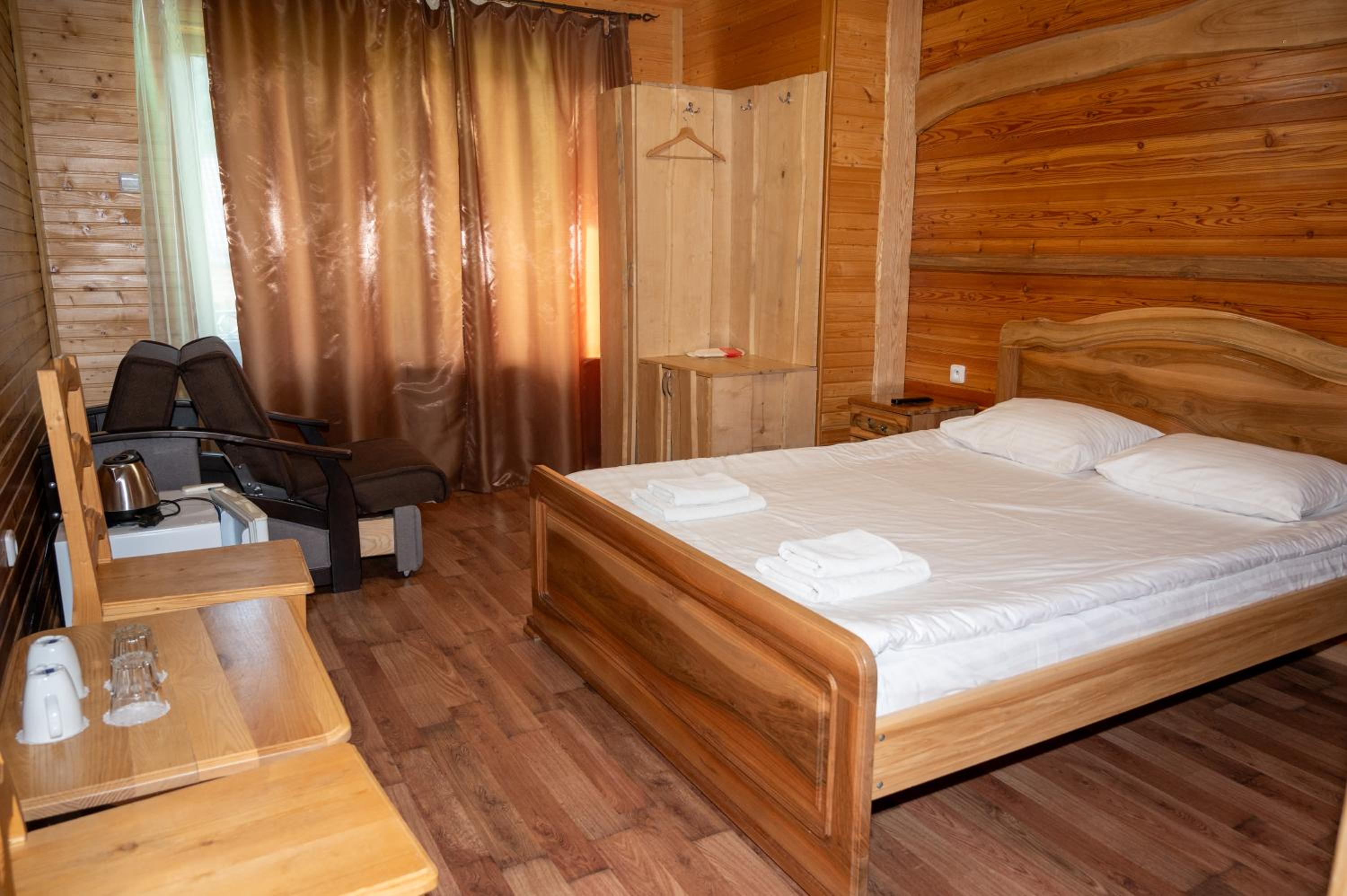 Заявлені дрібниці всі в наявності: холодильник із морозилкою в номері, чайник, фен та мило, гель для душу, шампунь у ванній кімнаті, капці у передпокої. Є басейн (невеличкий, без підігріву, проте за день дуже добре нагрівався на сонці, тому плавала і малеча, і дорослі), сауна, гарячі бочки, мангал, піч, альтанки, шезлонги та парасолі від сонця, м'якенький газон, місце для парковки, територія вся під відеоспостереженням.