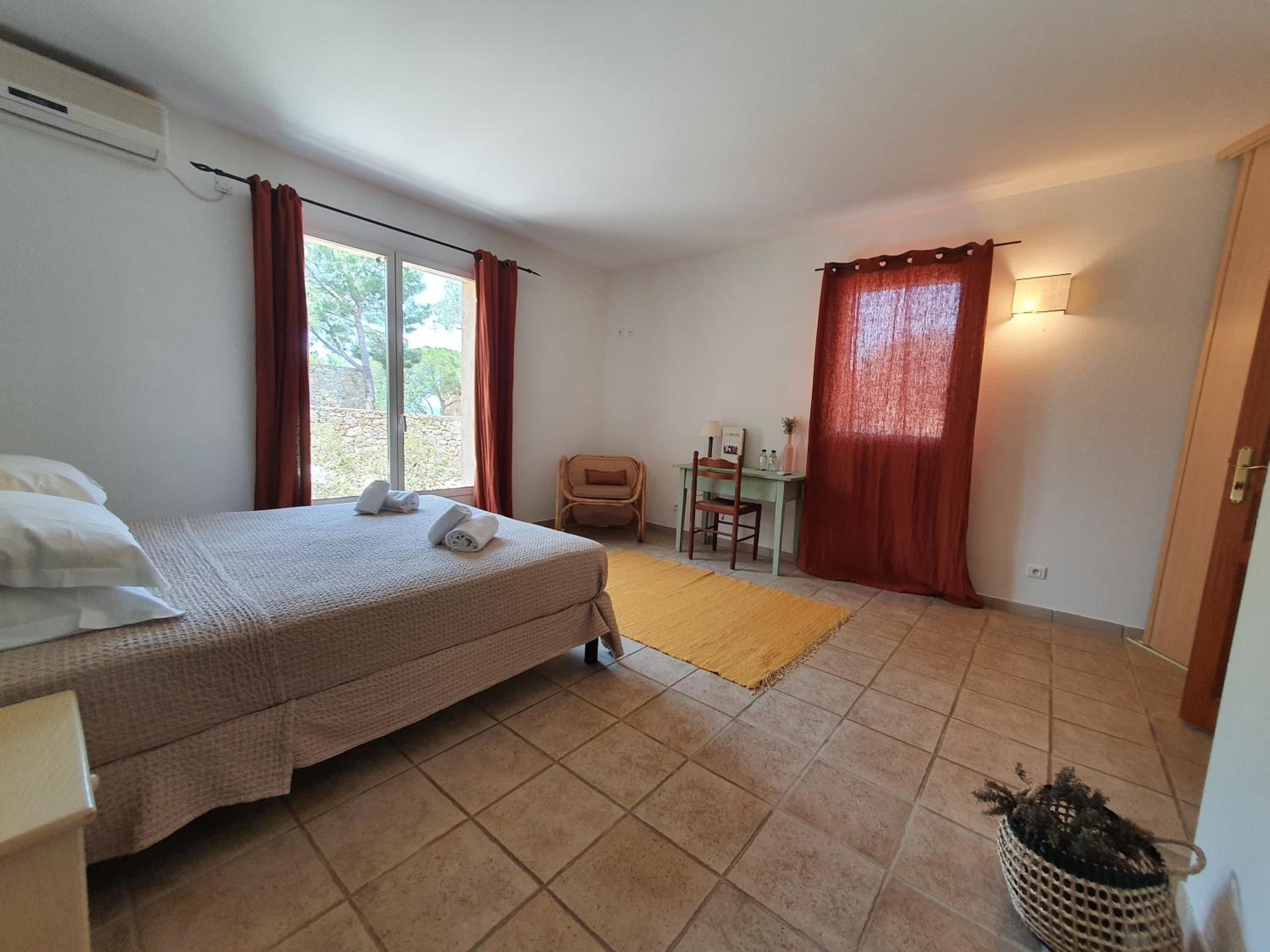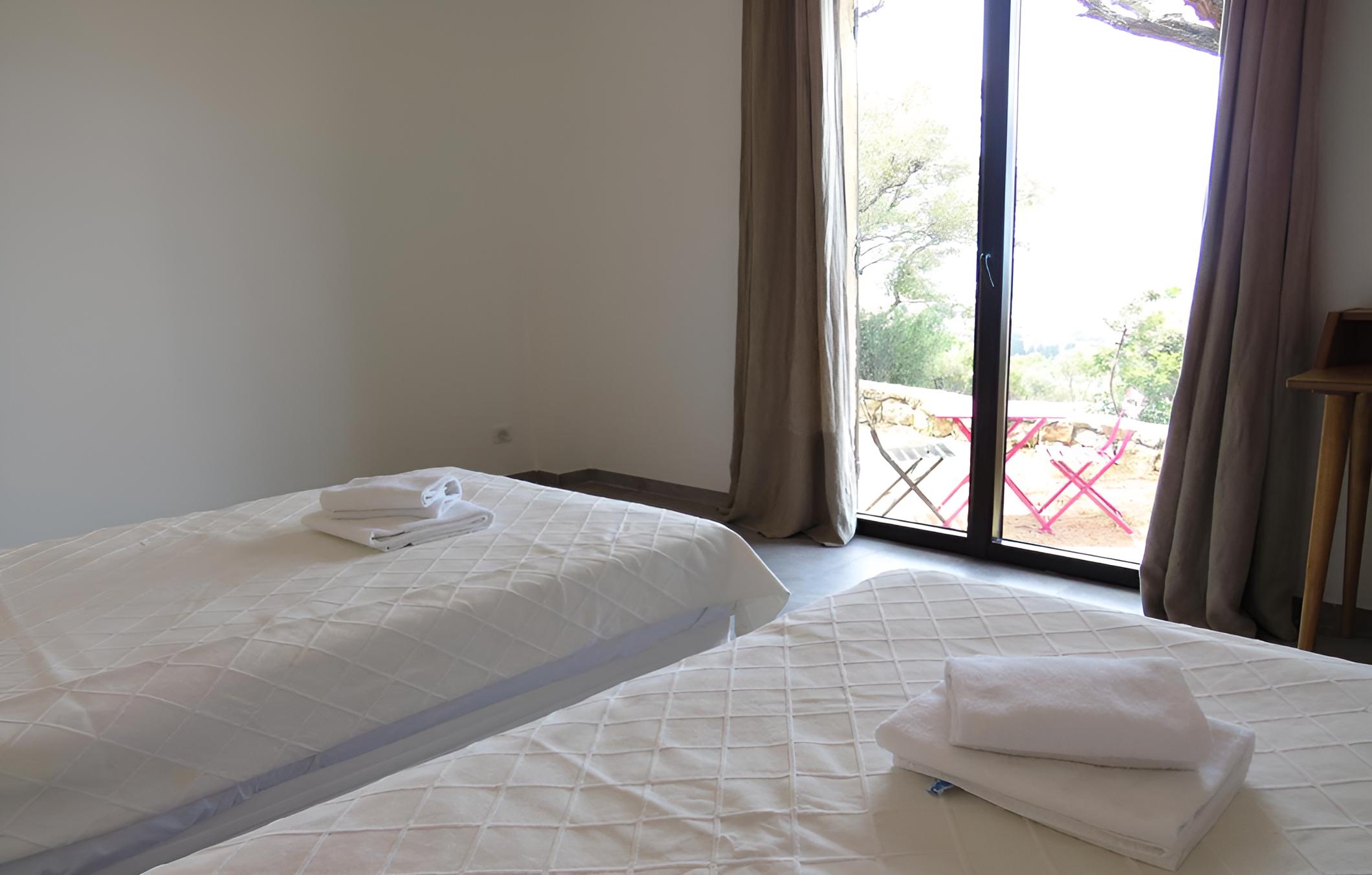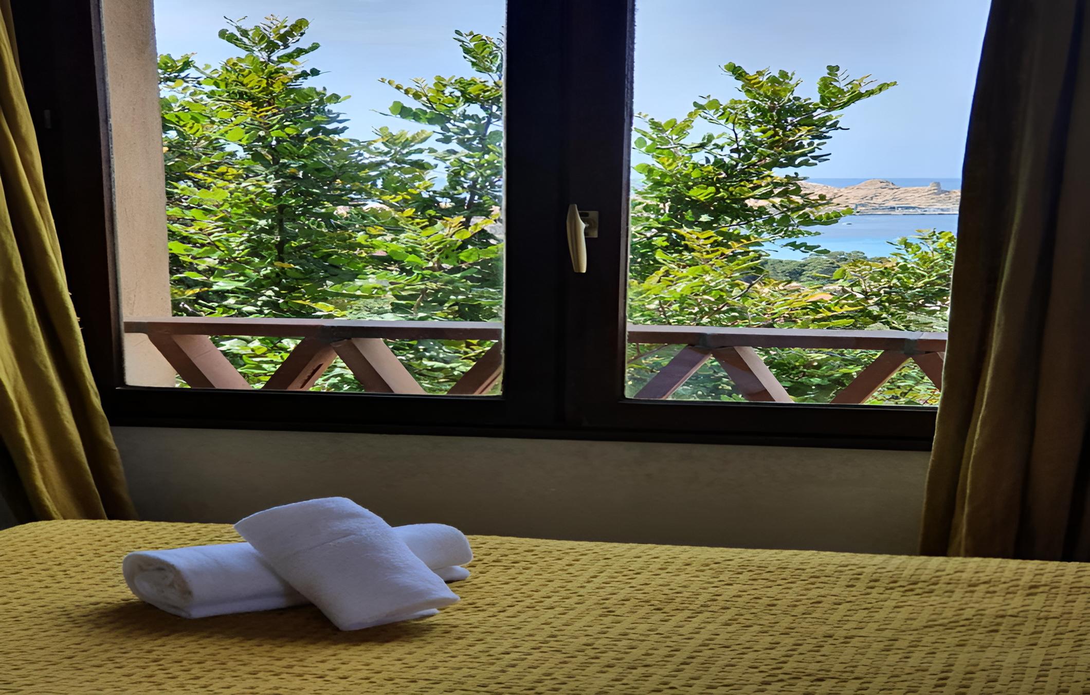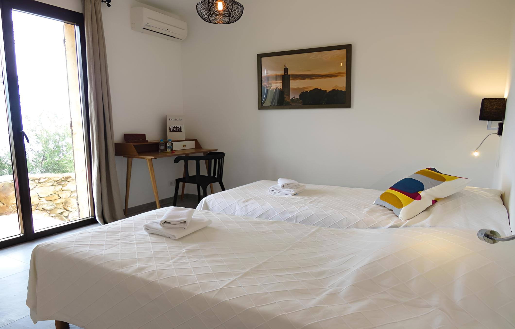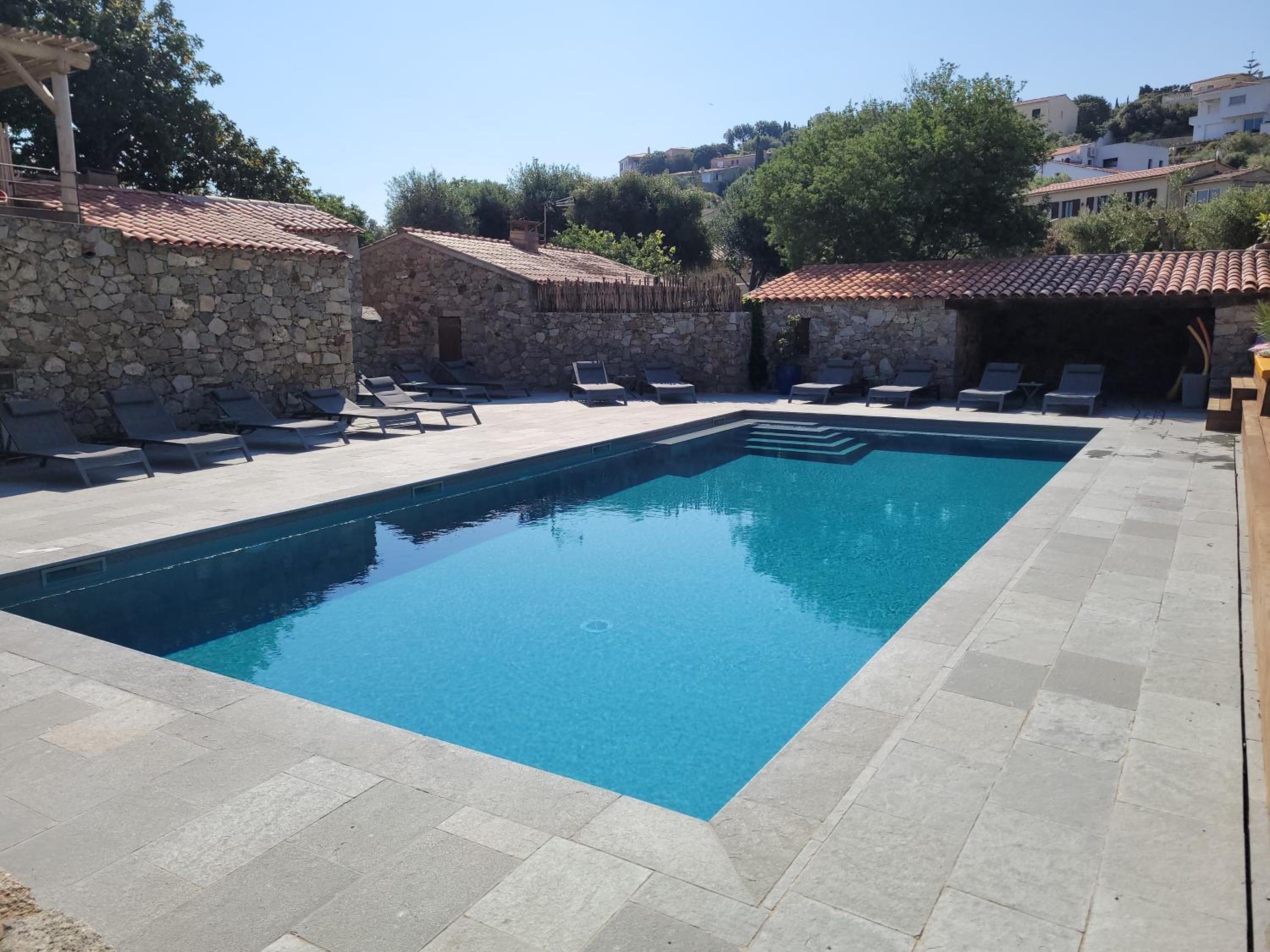 Scenic Views and Relaxation: Enjoy breathtaking views of Ile-Rousse from our outdoor swimming pool and various room options overlooking the garden, pool, or mountains. Unwind with a TV in our shared lounge or take a stroll to the nearby beach just 800m away.