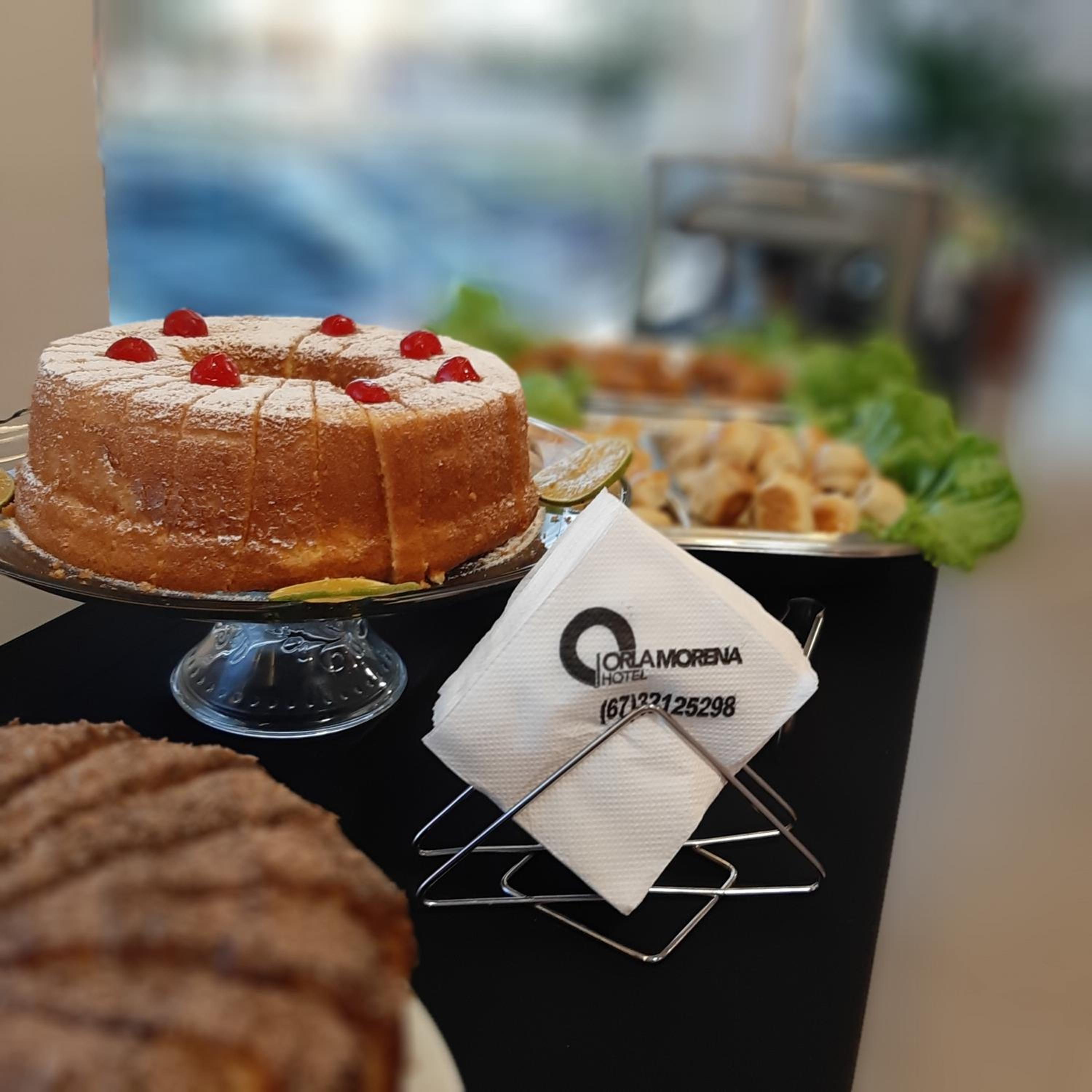 Café da manhã variado e com excelentes opções de bolo, pães, minipizza, frutas.