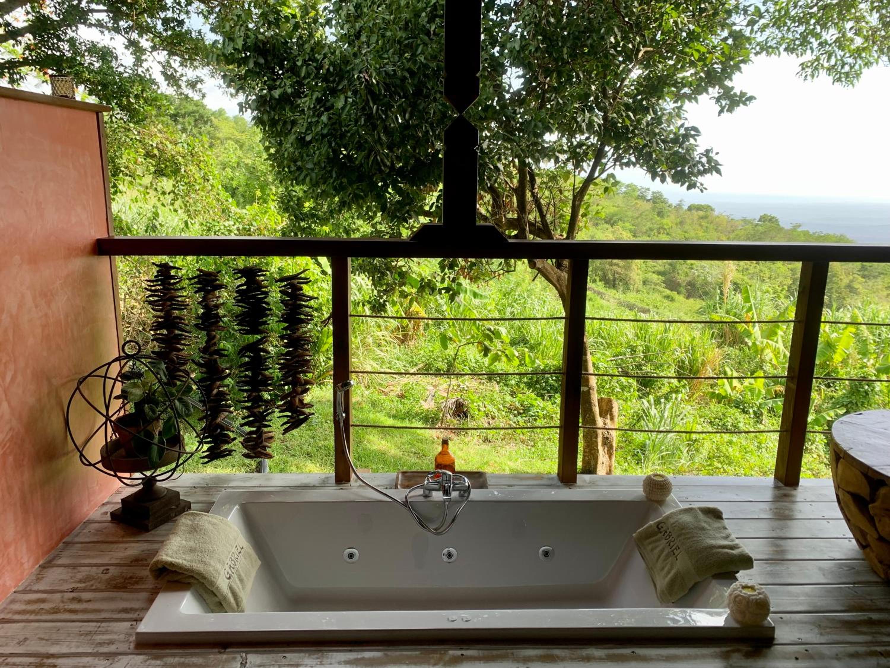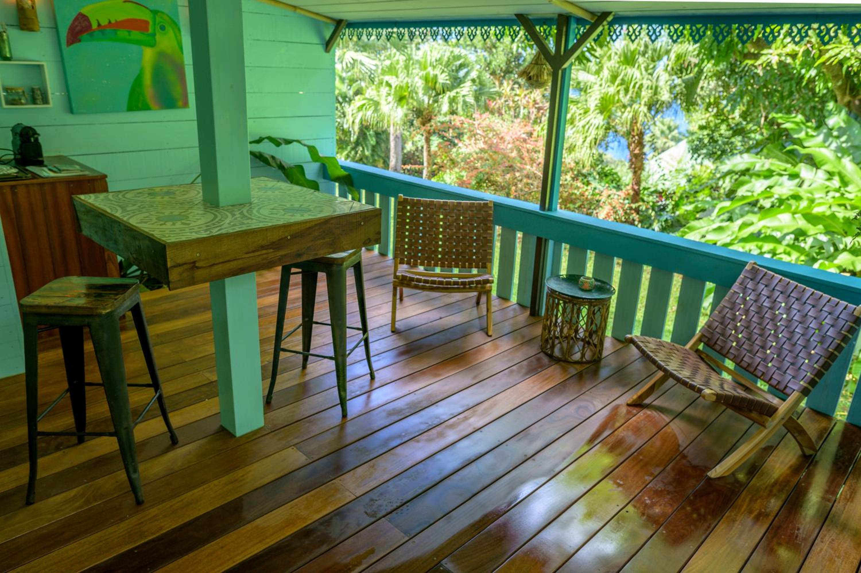 The situation is outstanding, set high above the Caribbean sea with a view over the luxuriant jungle and the delightfully kept gardens with mango, palm and other exotic plants and trees. At night the song of the frogs and birds lull one to sleep. Breakfast was good, as was the dinner we ordered. The massages were most relaxing, warmed by the last of the evening's sun as it set over the ocean. The host couple were friendly, helpful and efficient.