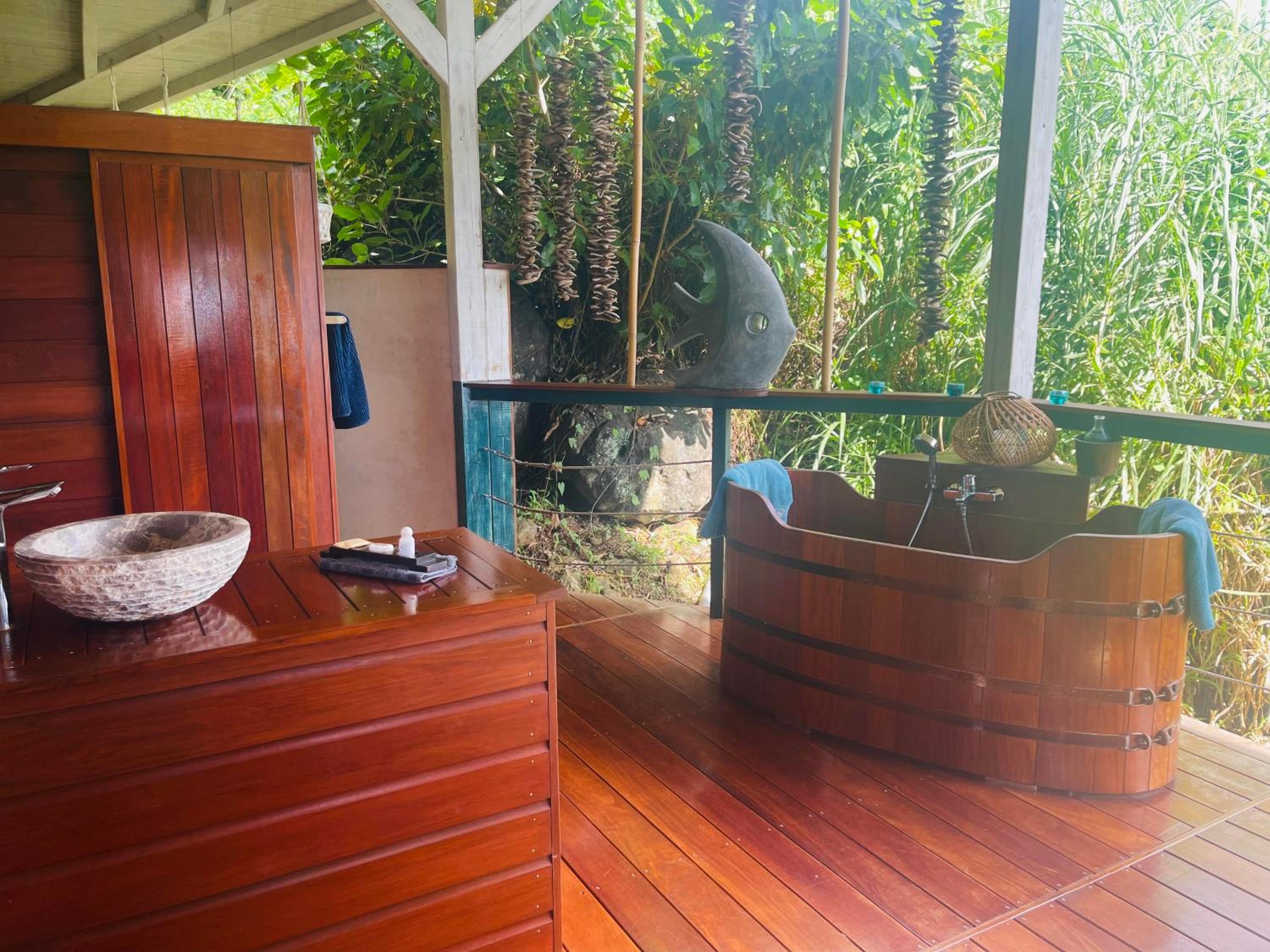 Il manque dans le bungalow un endroit pour se détendre. Seuls deux fauteuils mais on aimerait un gros canapé pour se détendre. Avec une vue. Aucune vue depuis la baignoire ou les canapés. Dommage !