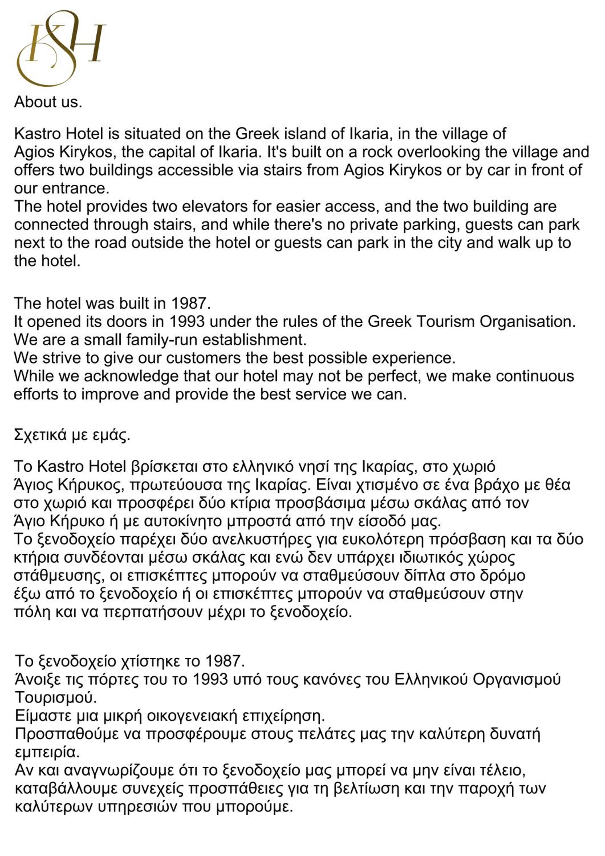 Conveniently situated in Agios Kirykos Village, Κastro Ηotel is a short walk from Agios Kirykos Port and only 11 km from Ikaria Airport. Benefit from free public parking nearby and explore the area with ease. Book your stay now for a memorable experience at our hotel.