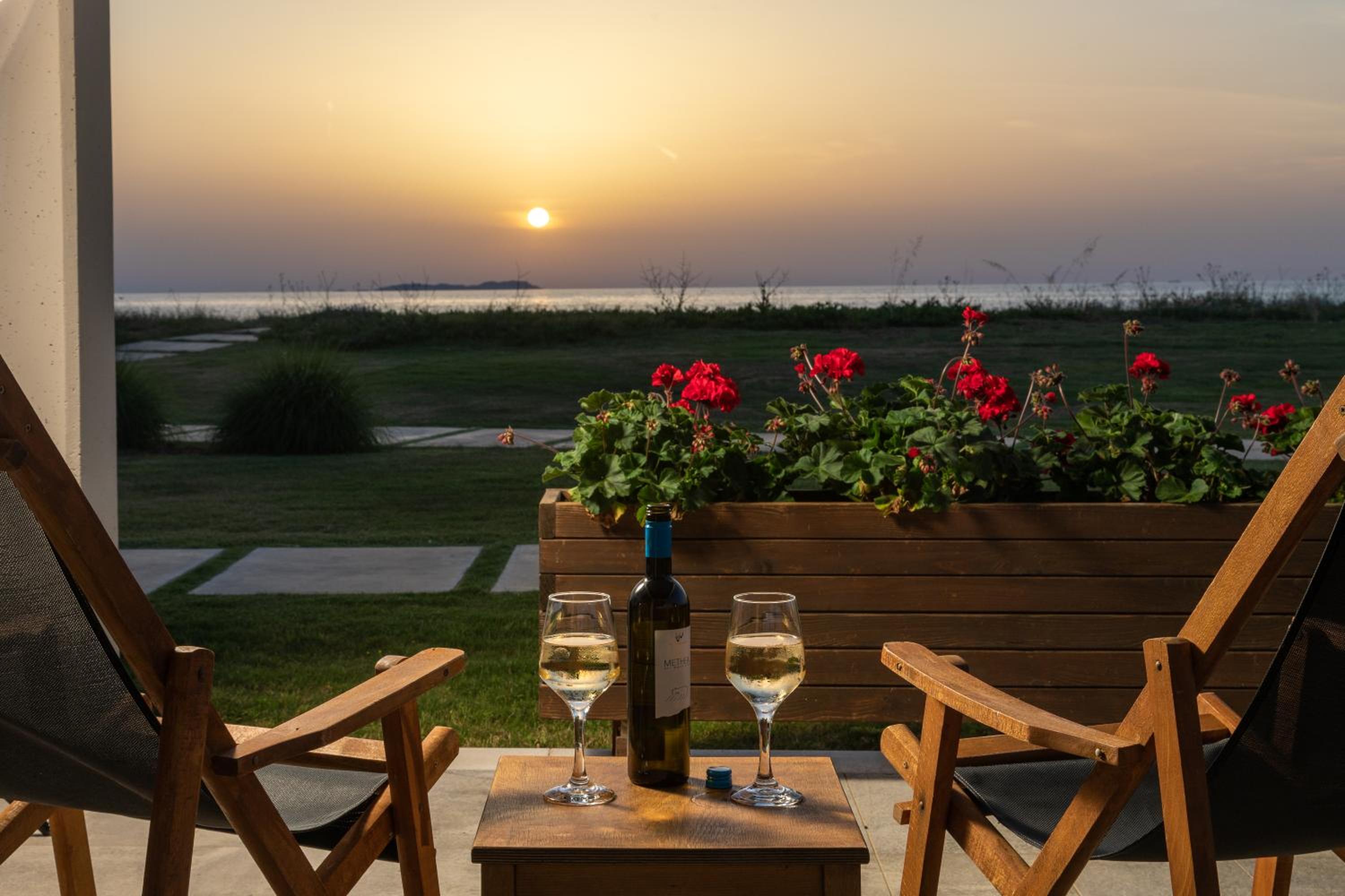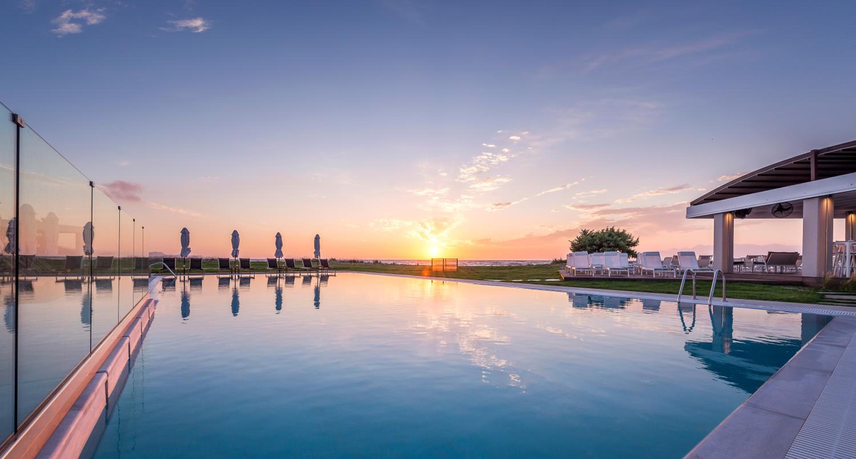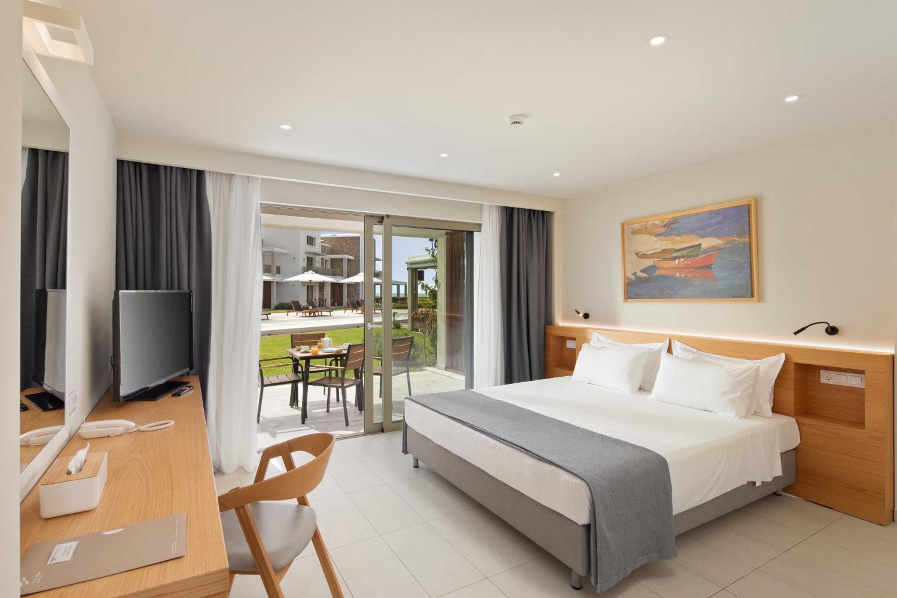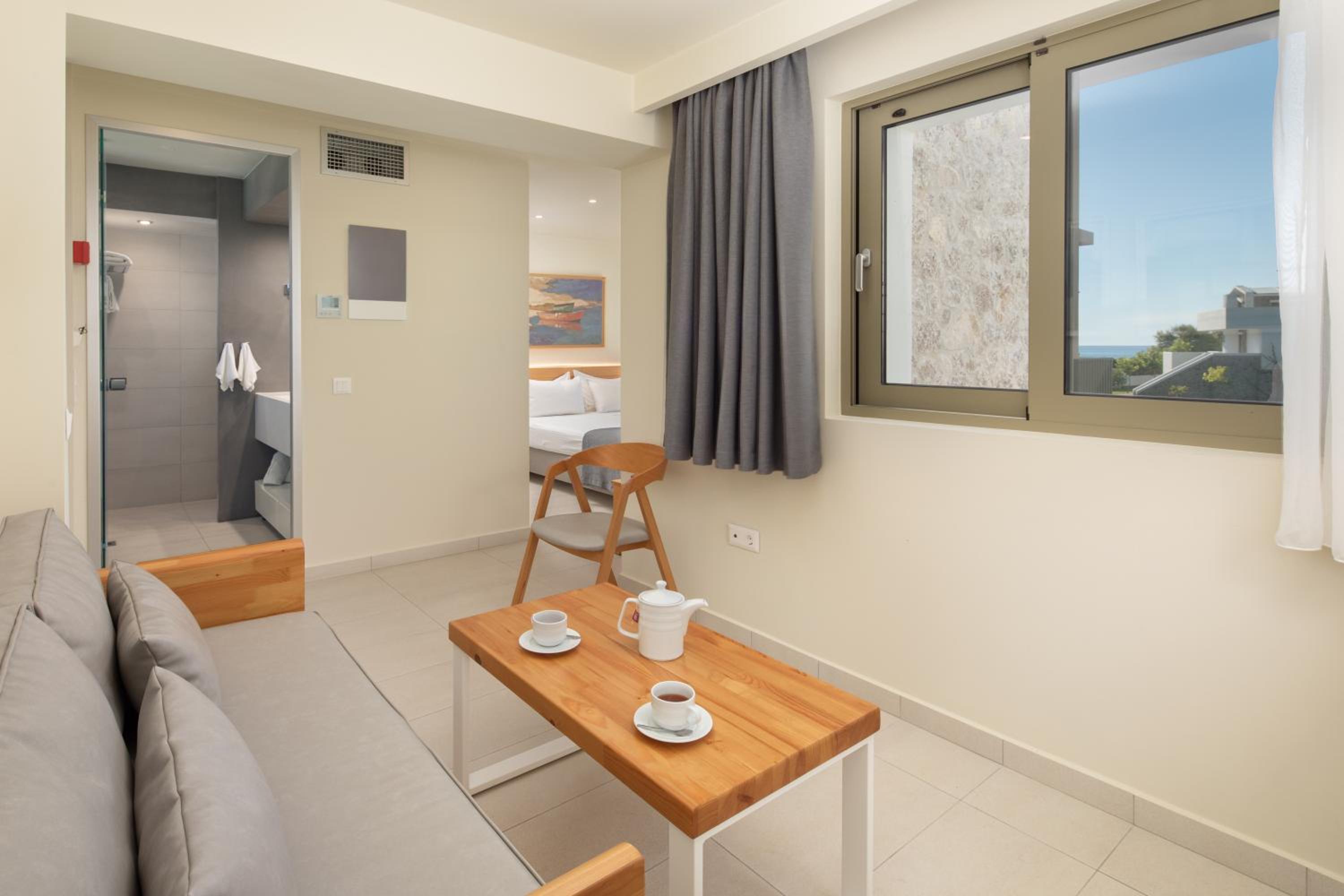 По существу: для тех, кто ищет чистоту, комфорт, домашний уют – только сюда. Просторный номер. Это сьют. Большая комната, Полноценная кухня с кухонным гарнитуром, холодильником, чайником, кофемашиной и даже капсулами для нее, с посудой для готовки и приборами, просто огромная ванная комната. Предусмотрено всё до мелочей! Шикарный и вместительный шкаф для одежды. Обстановка, мебель, шторы, всё абсолютно новое и очень ухоженное. Косметика в ванной NUXE. Я вожу всегда с собой шампунь и кондиционер для своих окрашенных волос. Здесь я даже своим не воспользовалась. Волосы были шикарные после этой косметики. У кого так же. Не везите с собой, здешний подошел идеально! Номер был на первом этаже, выход с террасы сразу же к бассейну, а через 10 шагов и ты уже на пляже и вот оно море. Мечта! Очень тихий район, и пляж свой без соседей, можно и помедитировать и позаниматься йогой. При заезде сразу же почувствовали себя дома! Приветливость персонала отдельная тема. Мы чувствовали искренность и беспрестанную заботу о нас, я не раз прослезилась от умиления и была тронута той нежностью, с которой к нам, относились. Как это важно и редко где такое встретишь, хотя путешествуем часто и селимся в отелях 4-5*. Персонал 100/10! Завтраки: Свежайшие овощи, вкусная выпечка, блюда из яиц, фрукты, десерты, кофе и капсульный и зерновой. Ресторан при отеле закрывал наши потребности – вкусно, всё очень свежее и после первого ужина персонал уже знал и чувствовал наши вкусы. По пятницам греческий вечер, музыка и блюда гриль, для любителей греческий танцев – можно и потанцевать! А какие тут закаты! Каждый вечер новая картинка! Ездить никуда не надо – любовались прямо с веранды ресторана. Обычно отзывы не пишу, ограничиваюсь оценками. Но здесь просто невозможно молчать, если вы такие же привереды, как я, то вам сюда )). Нам 8 дней было мало.