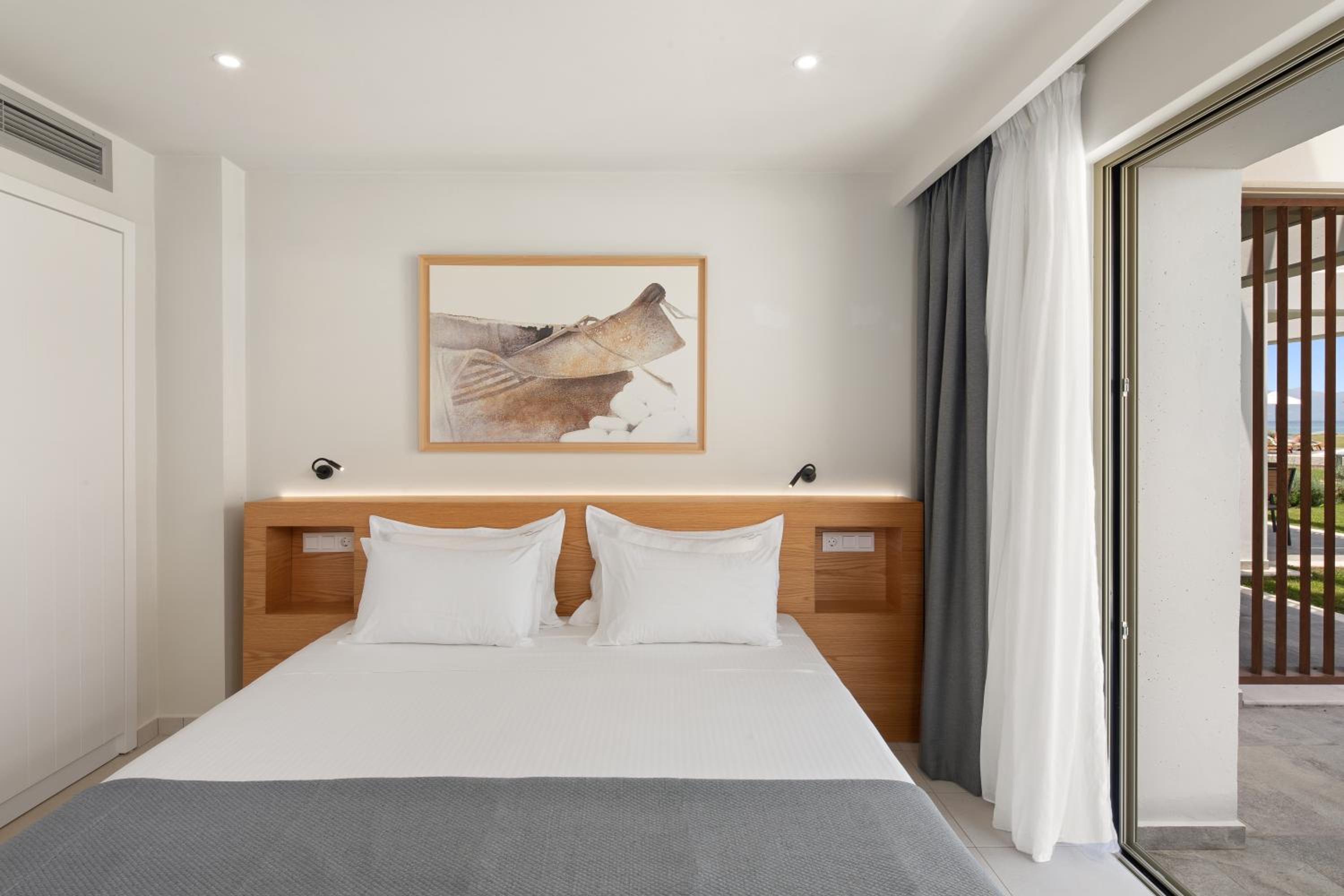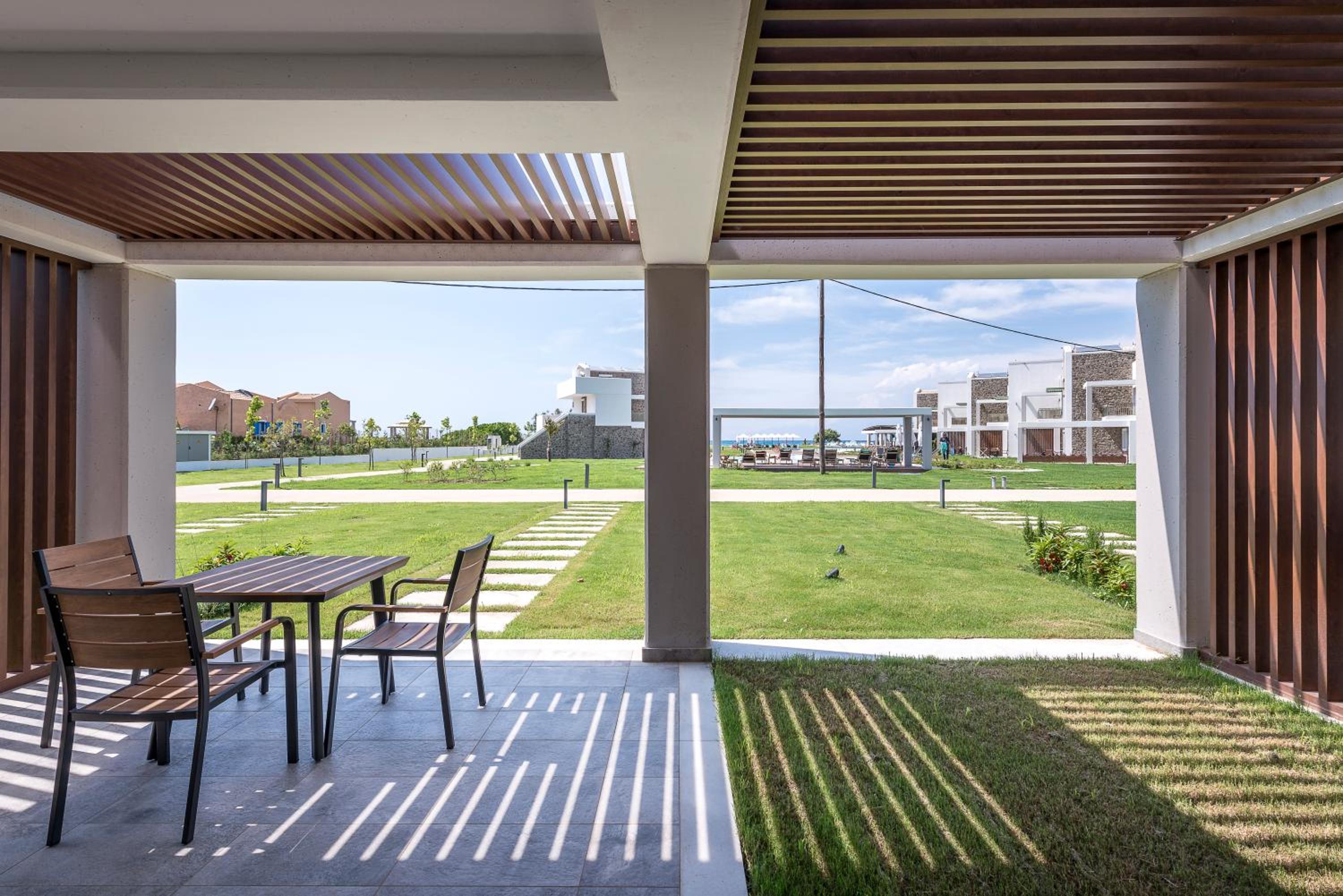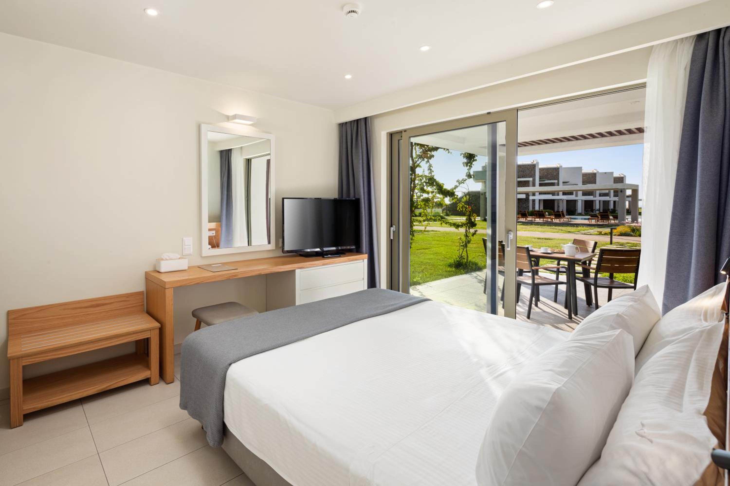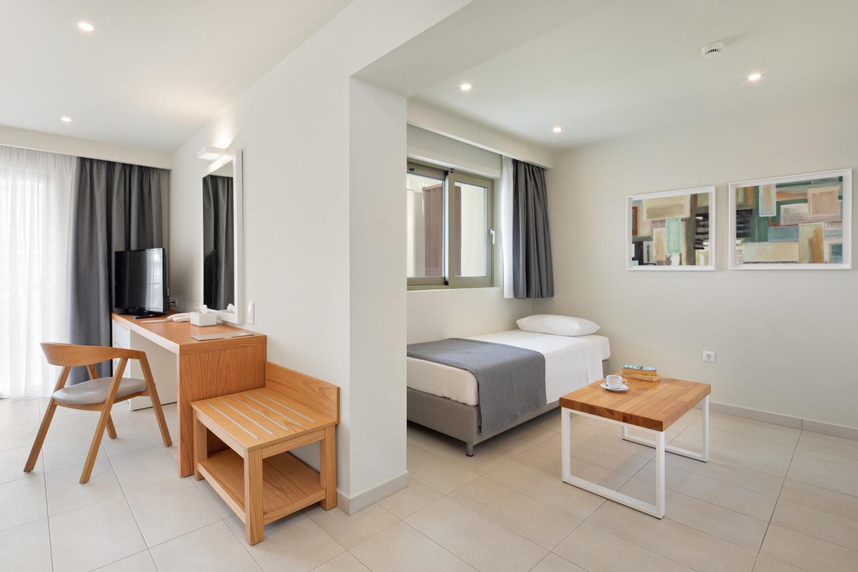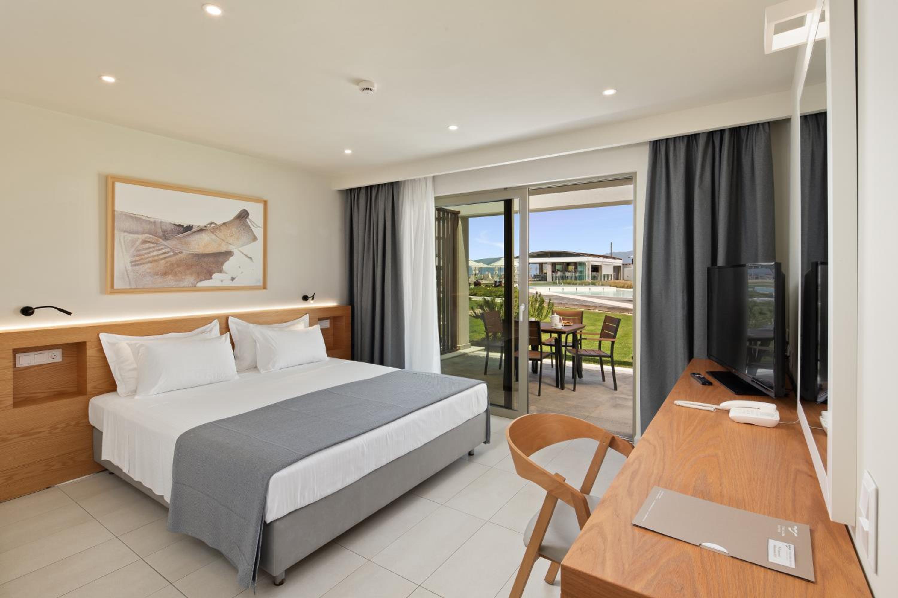 По существу: для тех, кто ищет чистоту, комфорт, домашний уют – только сюда. Просторный номер. Это сьют. Большая комната, Полноценная кухня с кухонным гарнитуром, холодильником, чайником, кофемашиной и даже капсулами для нее, с посудой для готовки и приборами, просто огромная ванная комната. Предусмотрено всё до мелочей! Шикарный и вместительный шкаф для одежды. Обстановка, мебель, шторы, всё абсолютно новое и очень ухоженное. Косметика в ванной NUXE. Я вожу всегда с собой шампунь и кондиционер для своих окрашенных волос. Здесь я даже своим не воспользовалась. Волосы были шикарные после этой косметики. У кого так же. Не везите с собой, здешний подошел идеально! Номер был на первом этаже, выход с террасы сразу же к бассейну, а через 10 шагов и ты уже на пляже и вот оно море. Мечта! Очень тихий район, и пляж свой без соседей, можно и помедитировать и позаниматься йогой. При заезде сразу же почувствовали себя дома! Приветливость персонала отдельная тема. Мы чувствовали искренность и беспрестанную заботу о нас, я не раз прослезилась от умиления и была тронута той нежностью, с которой к нам, относились. Как это важно и редко где такое встретишь, хотя путешествуем часто и селимся в отелях 4-5*. Персонал 100/10! Завтраки: Свежайшие овощи, вкусная выпечка, блюда из яиц, фрукты, десерты, кофе и капсульный и зерновой. Ресторан при отеле закрывал наши потребности – вкусно, всё очень свежее и после первого ужина персонал уже знал и чувствовал наши вкусы. По пятницам греческий вечер, музыка и блюда гриль, для любителей греческий танцев – можно и потанцевать! А какие тут закаты! Каждый вечер новая картинка! Ездить никуда не надо – любовались прямо с веранды ресторана. Обычно отзывы не пишу, ограничиваюсь оценками. Но здесь просто невозможно молчать, если вы такие же привереды, как я, то вам сюда )). Нам 8 дней было мало.
