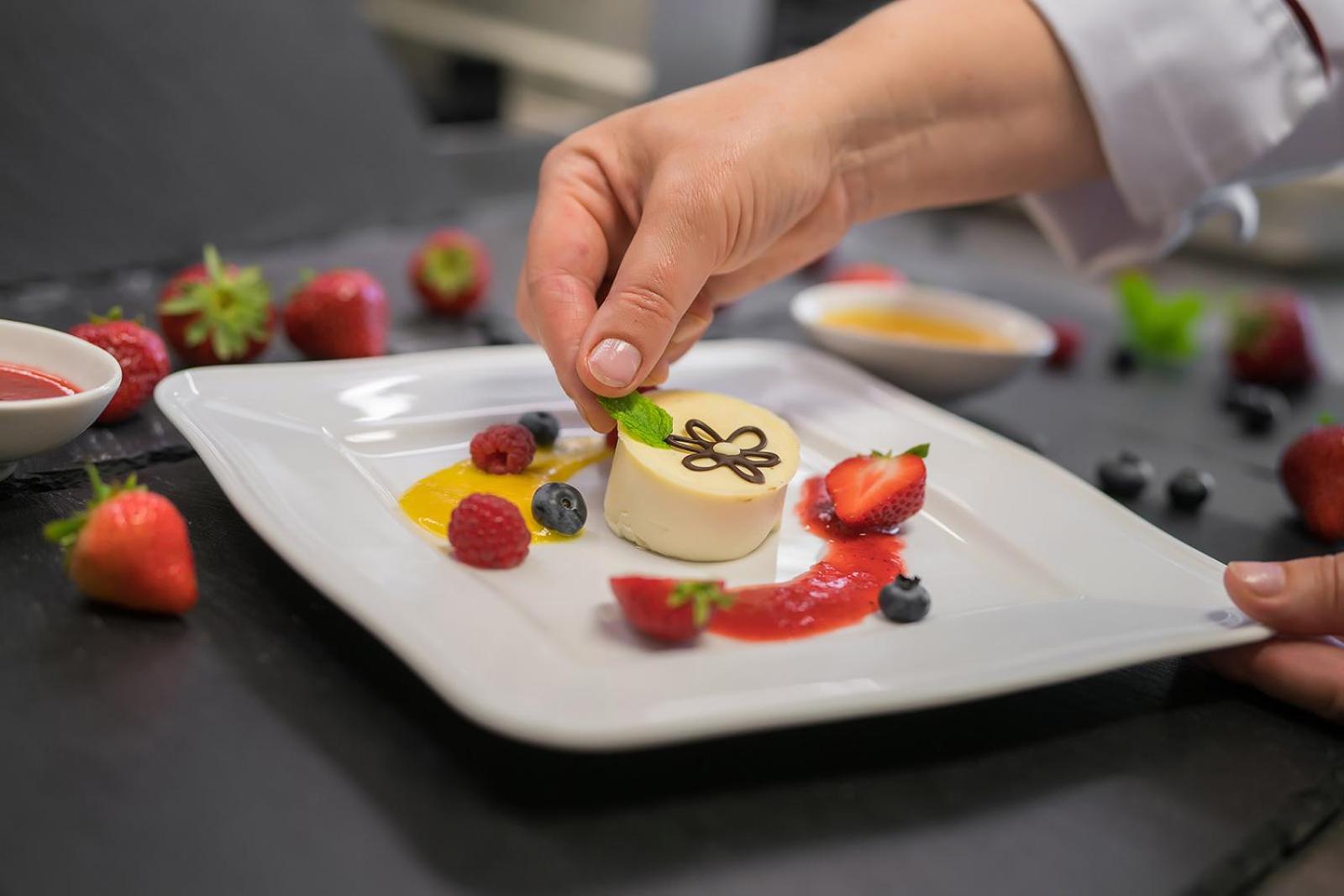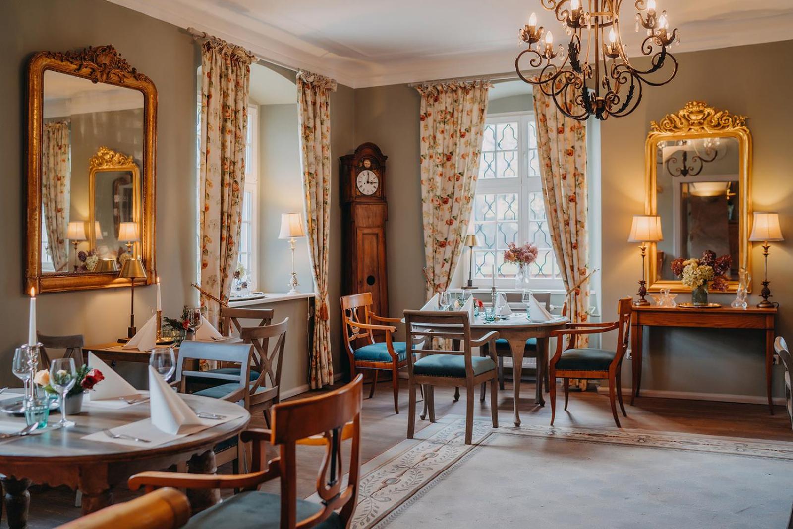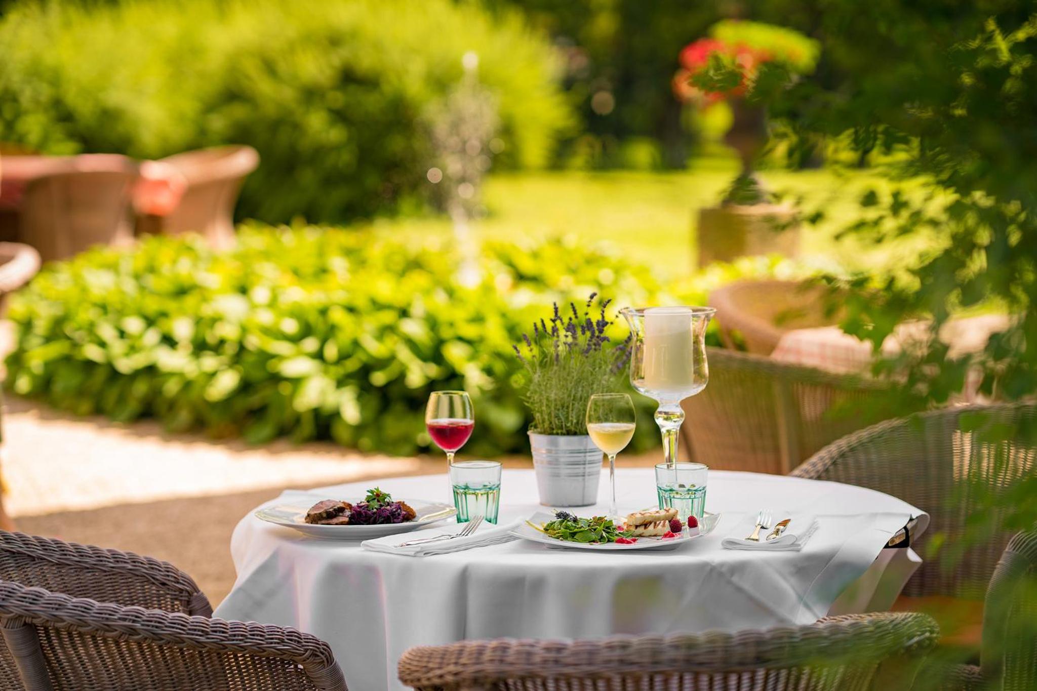 Indulge in delicious local cuisine at the on-site restaurant, set by a cozy fireplace or on the sunny terrace. With picturesque views of the river and park, the Blue Hall and Pink Salon offer a perfect setting for group gatherings and memorable meals.