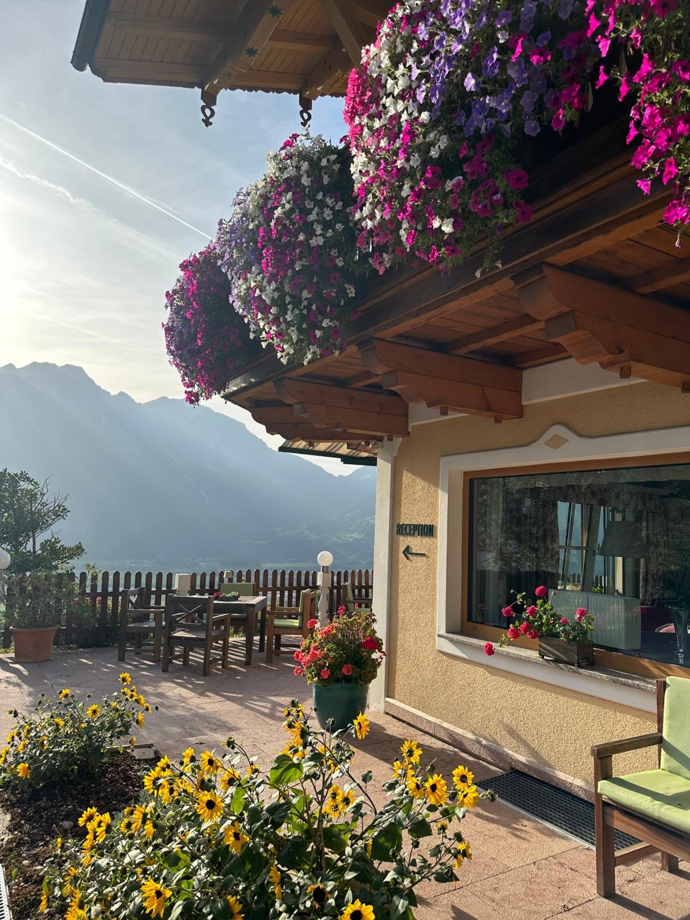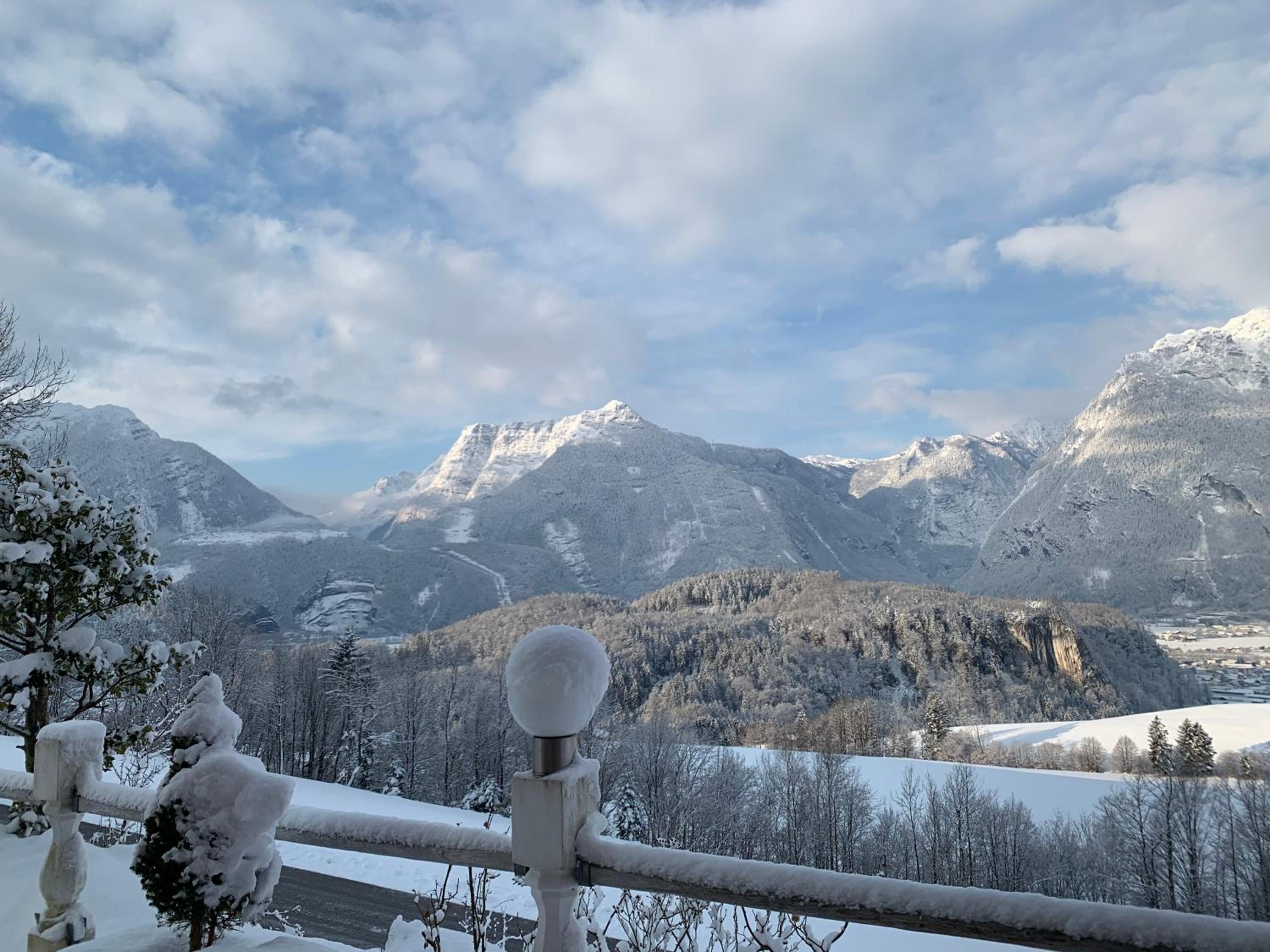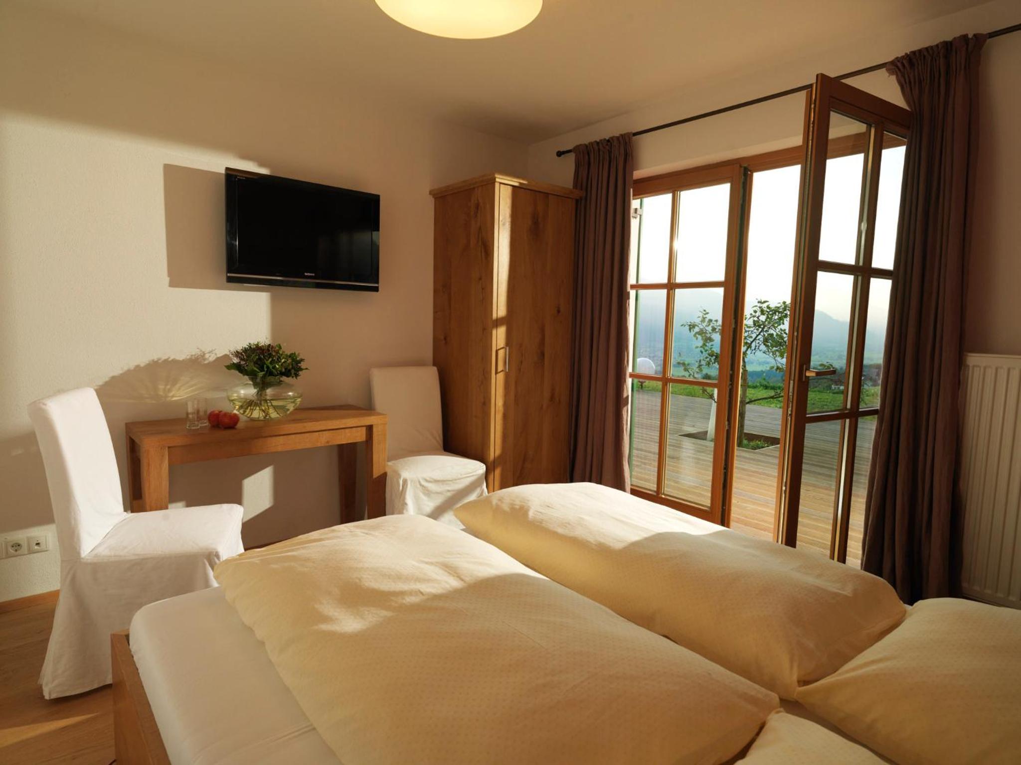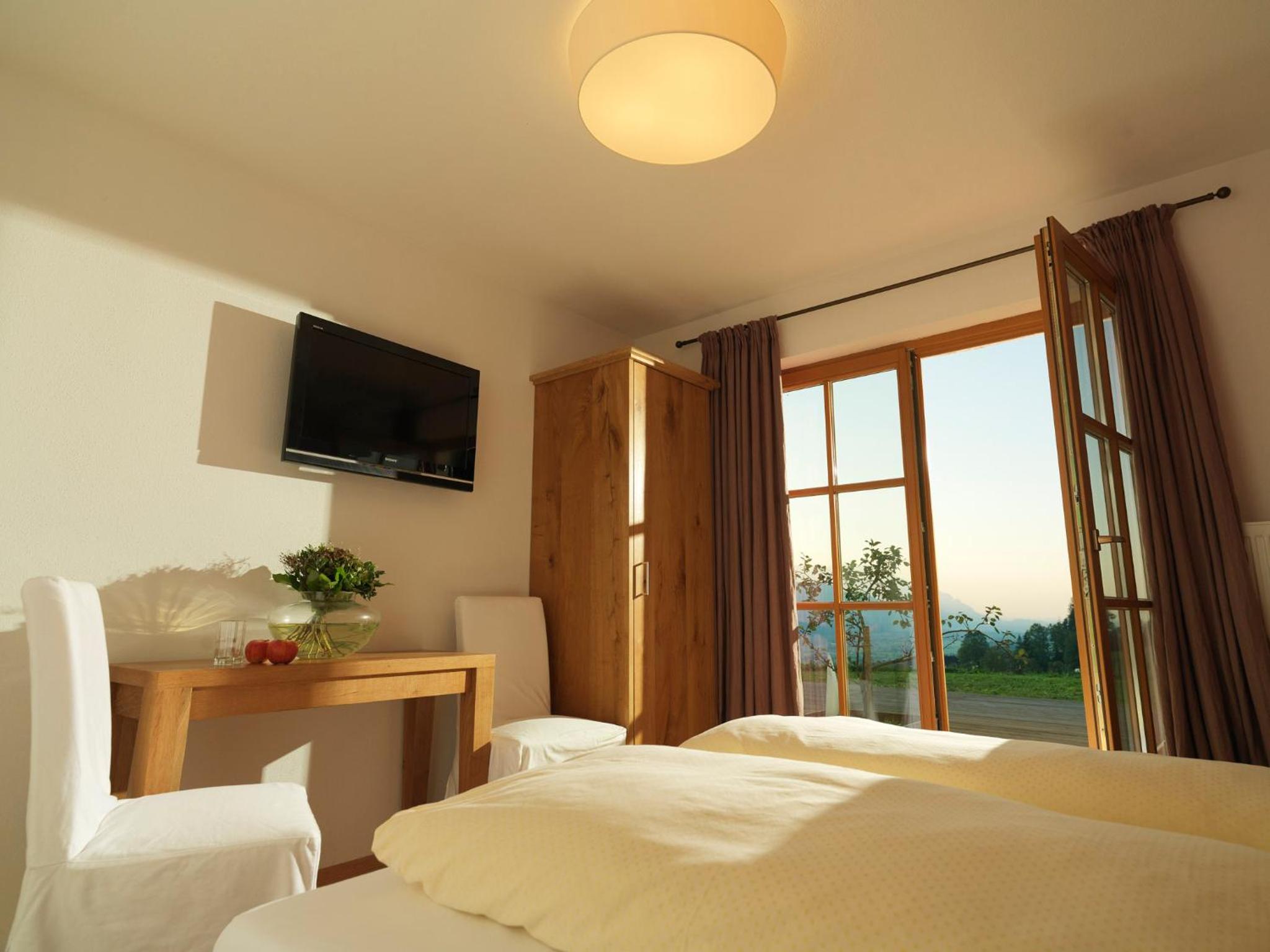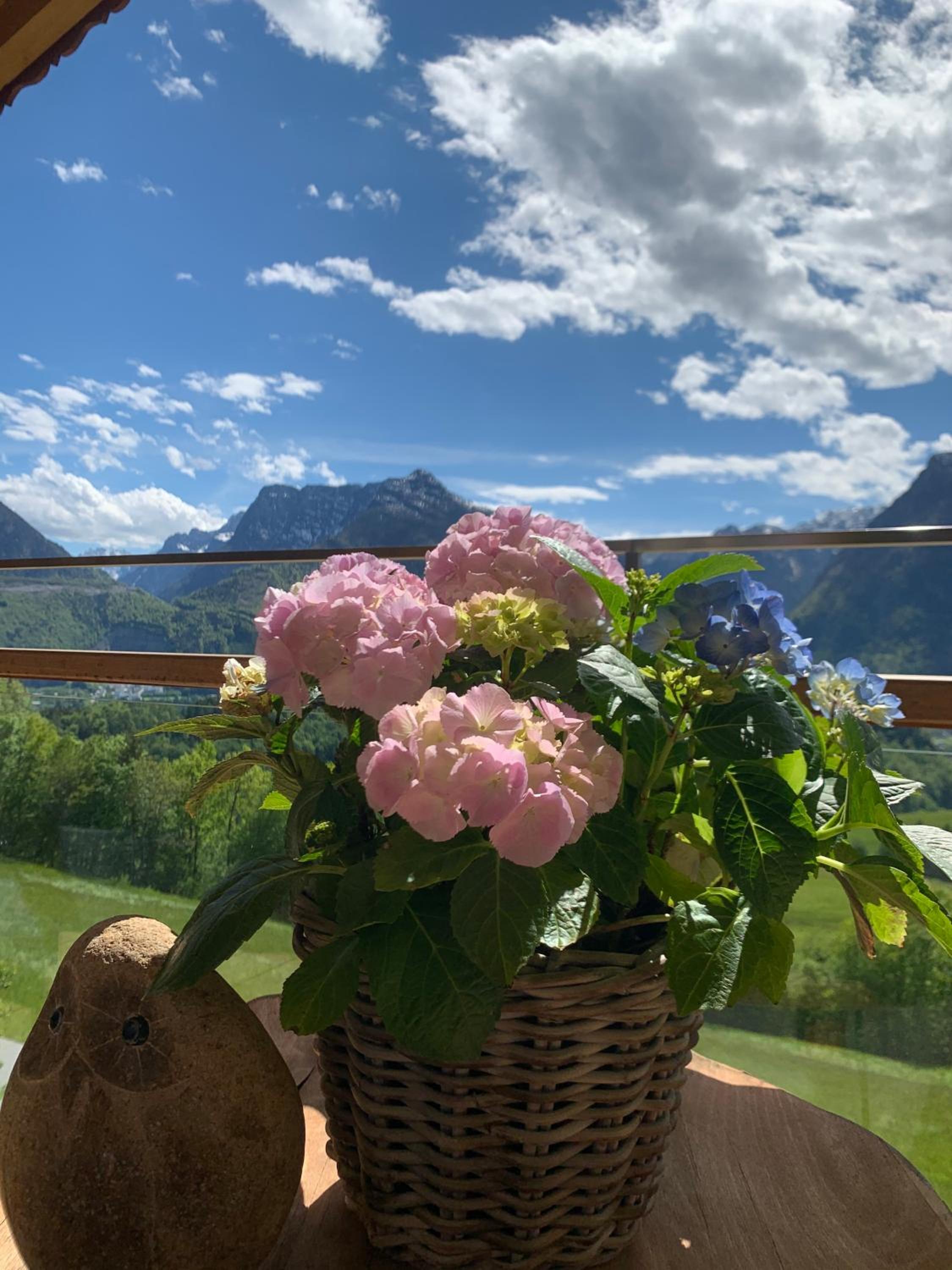Alps view from the front side of the building. Valley next to the building with access from the room. Clean bathroom, friendly Gardner & cute pet cat.