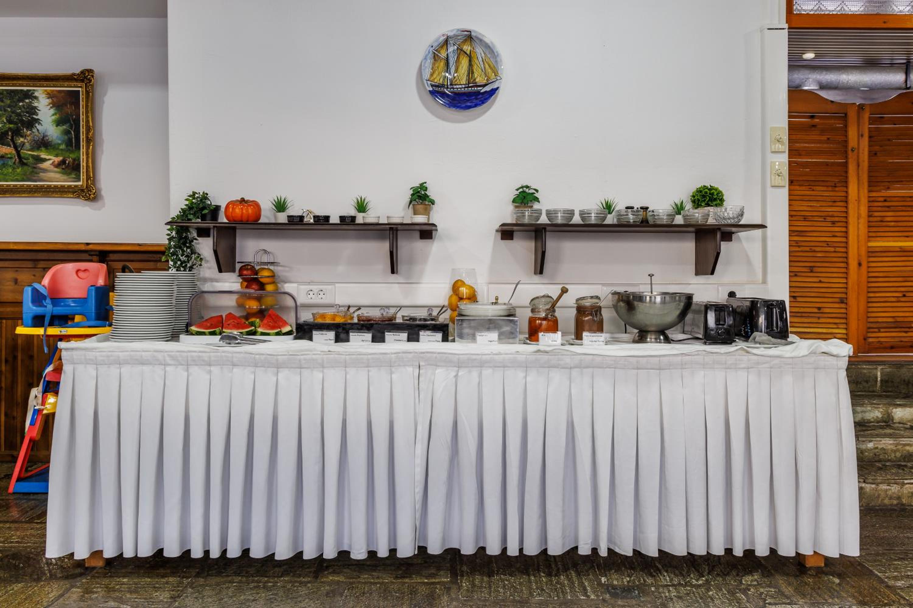 The breakfast offer was unimaginative and monotonous; the breakfast room was small and cramped though it was next to a huge unused lounge. The bar service was often offhand verging on hostile. The location was quite near the centre but up a very steep hill - like much of Skopelos. The pictures of a busy friendly bar on Booking had been one of the reasons we chose the hotel but experience was rather different.