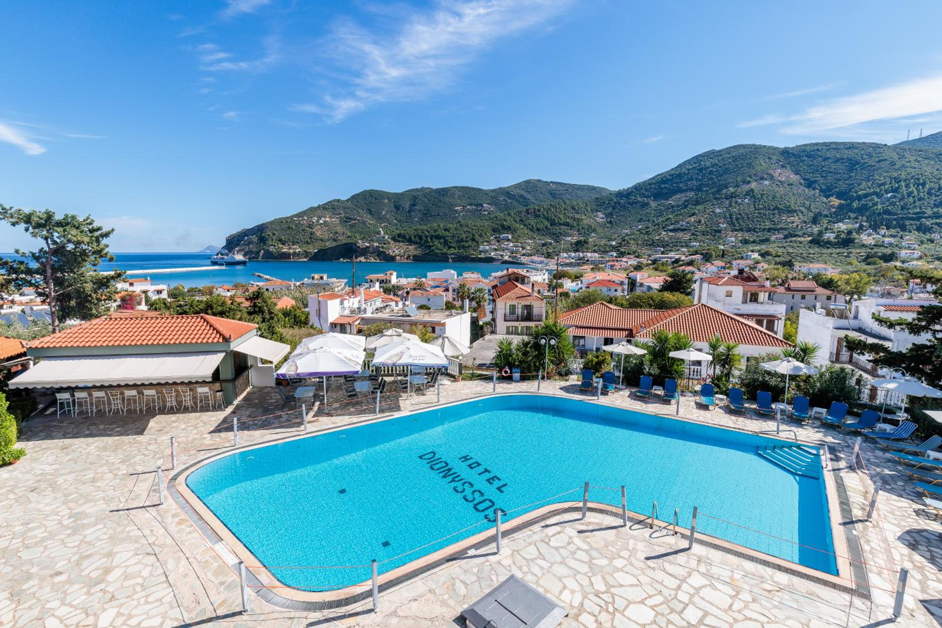 Immerse yourself in the lush gardens and breathtaking views at Dionyssos Hotel. The property's modern design offers a serene escape with a terrace featuring bamboo chairs overlooking the sparkling swimming pool and Skopelos Bay.