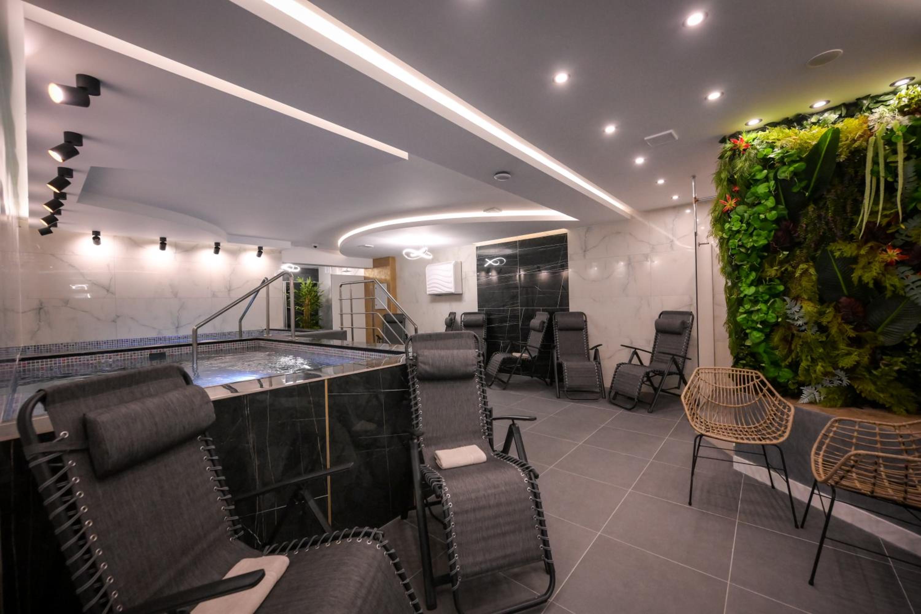 Guests can unwind in the wellness area featuring an indoor pool, sauna, and hot tub, or enjoy the outdoor garden with a children's playground, providing ample opportunities for relaxation and leisure activities.