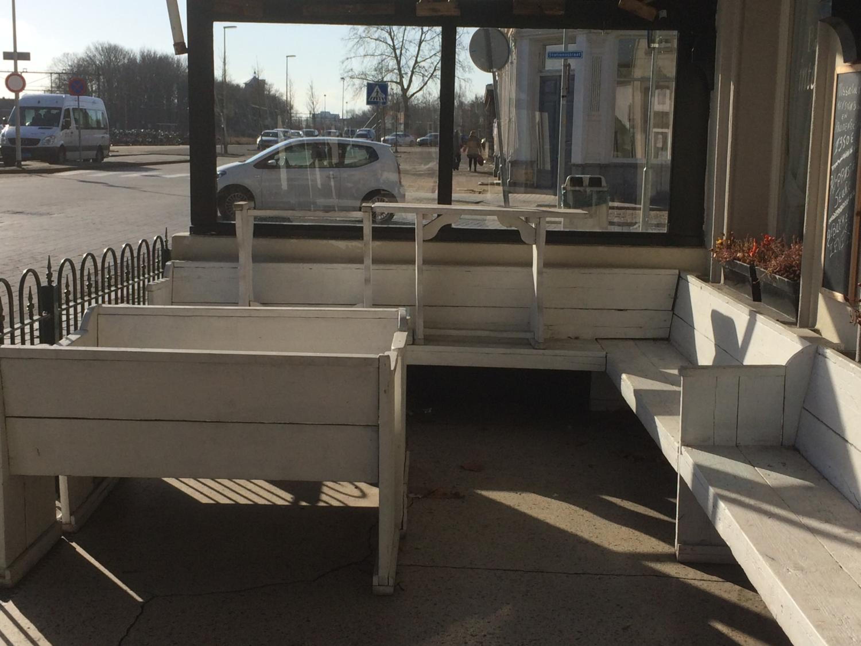 Een keukentafeltje met twee verschillende stoeltjes die eruit zien alsof ze bij elkaar geraapt zijn bij het grofvuil en loszittend behang. Scheuren in de muren etcetera.