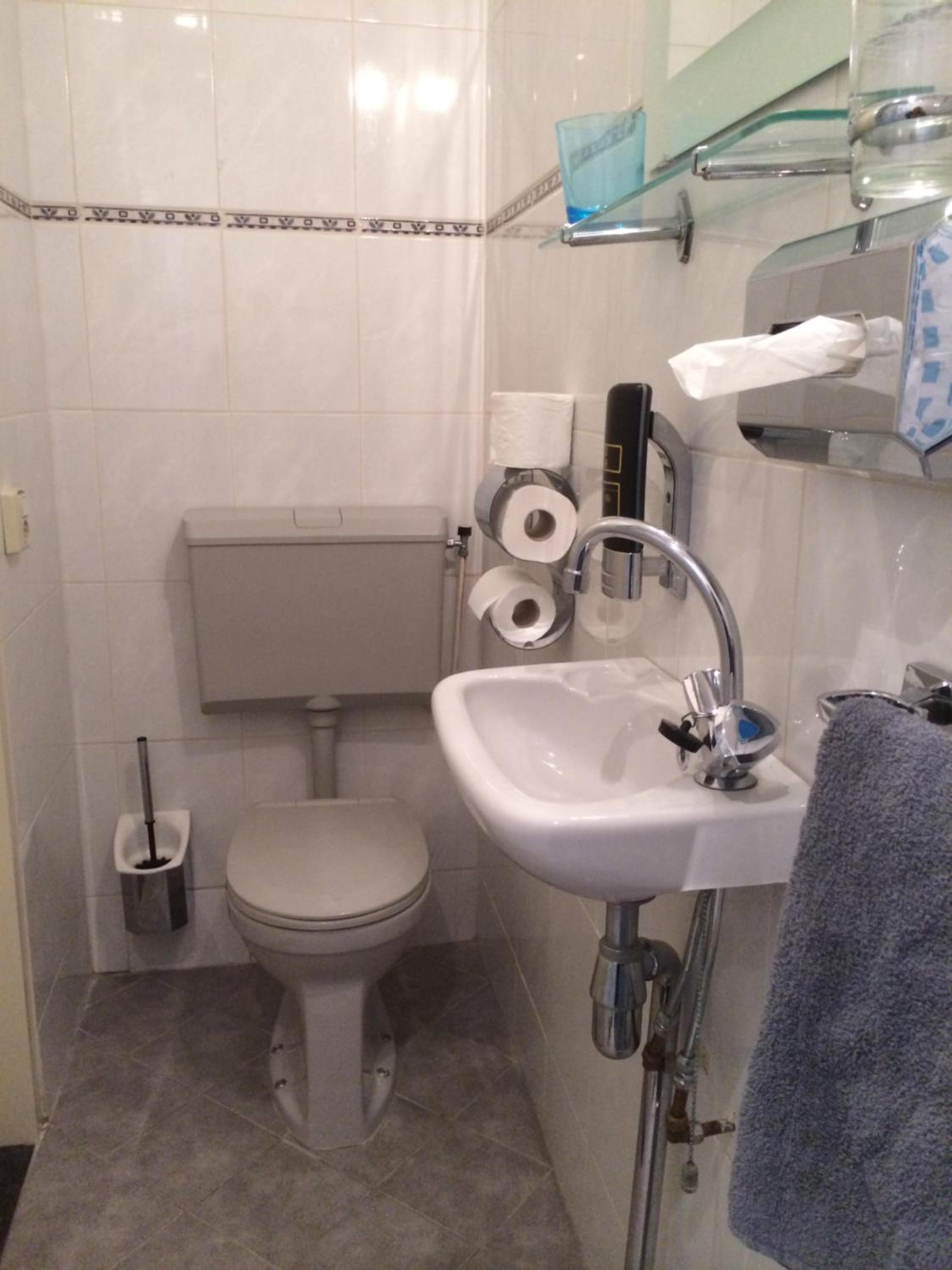 Vochtplekken op het systeemplafond, de radiator bij het derde bed hangt nog met één klem aan de muur en in de badkamer zitten overal schroefgaten van eerder gemonteerde spiegels of zeephouders. De lichtschakelaar zit vol met opgehoopt vuil en er zitten barsten in de tegels op de vloer.