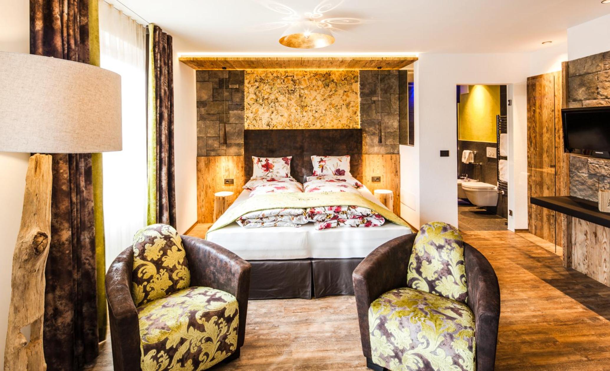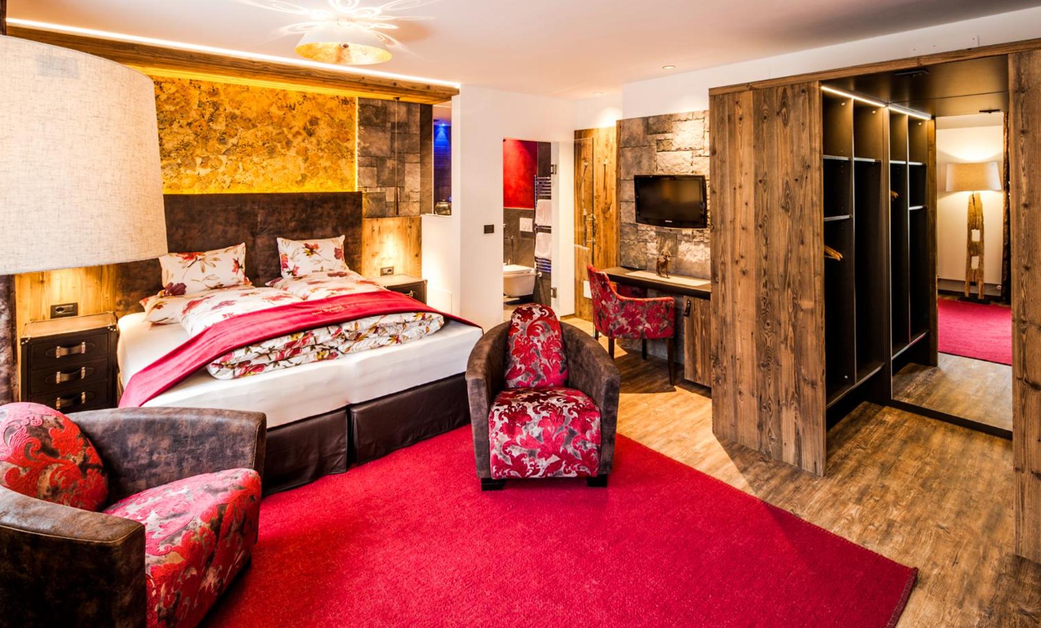 Experience comfort and luxury at Hotel Tyrol with mountain-view rooms featuring flat-screen TVs and wooden furnishings. Relax in the cozy seating area and enjoy the convenience of a private bathroom and some rooms even offer a balcony for stunning views.