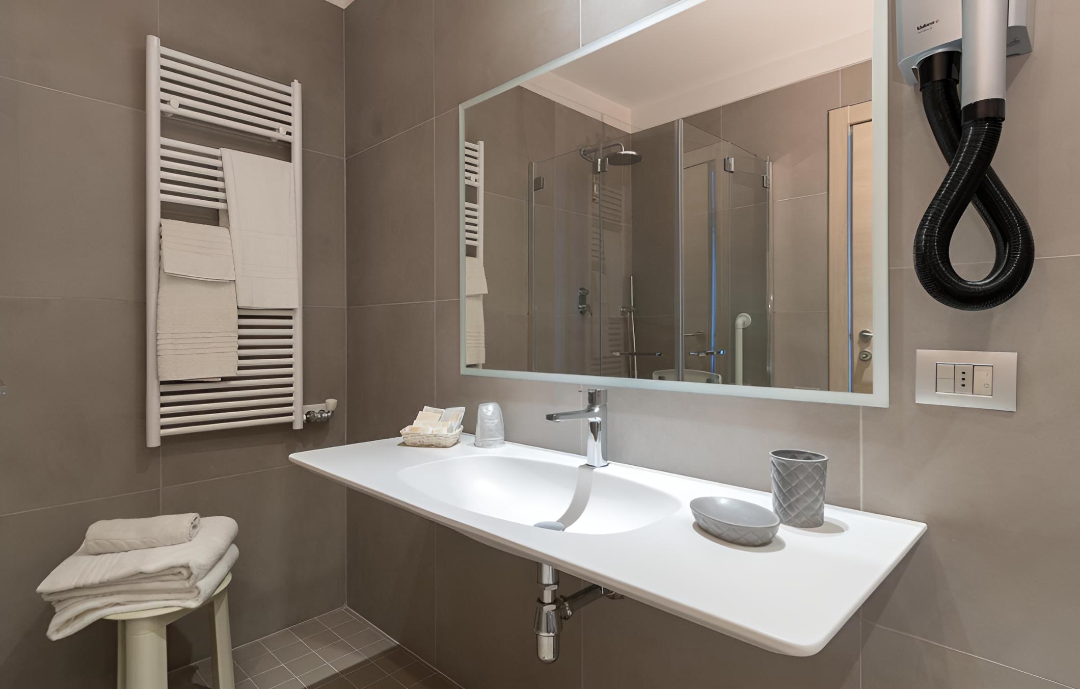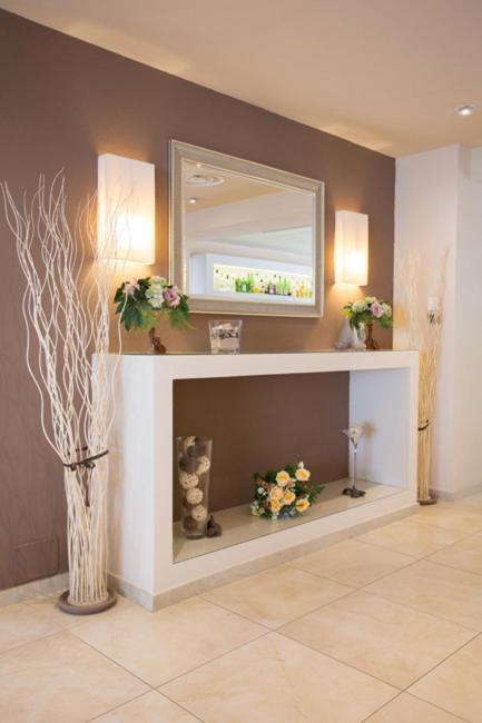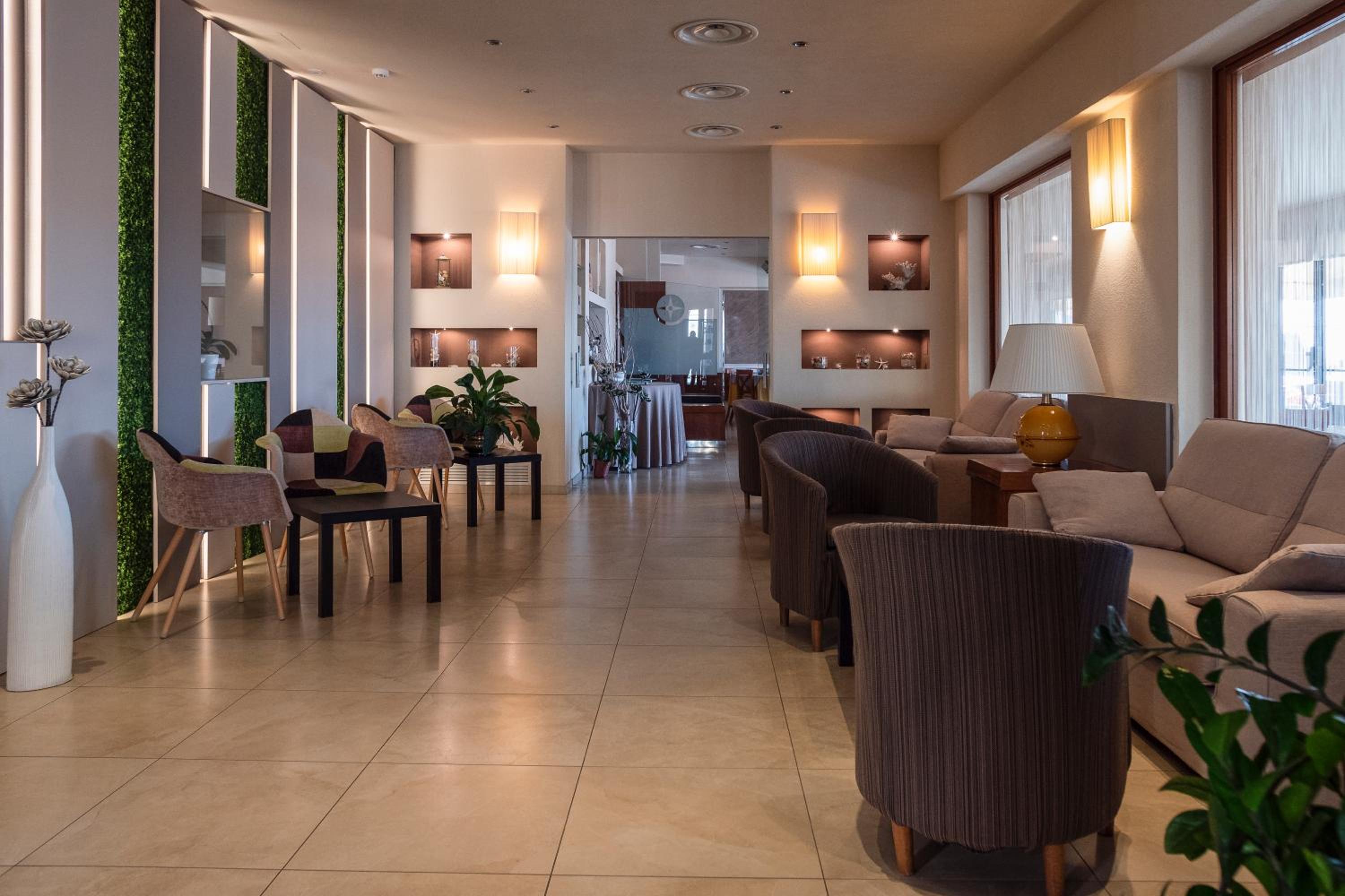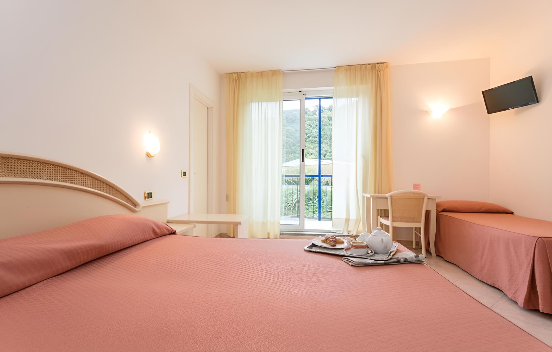 Indulge in the comfort of pastel-coloured rooms, some featuring terraces with stunning sea views. Modern amenities like flat-screen TVs and free Wi-Fi ensure a relaxing stay.