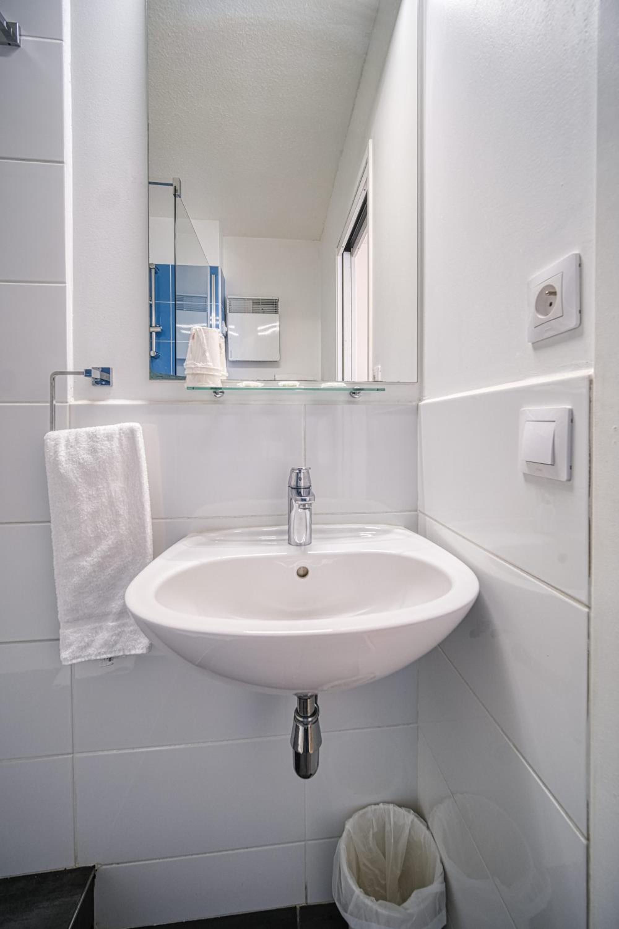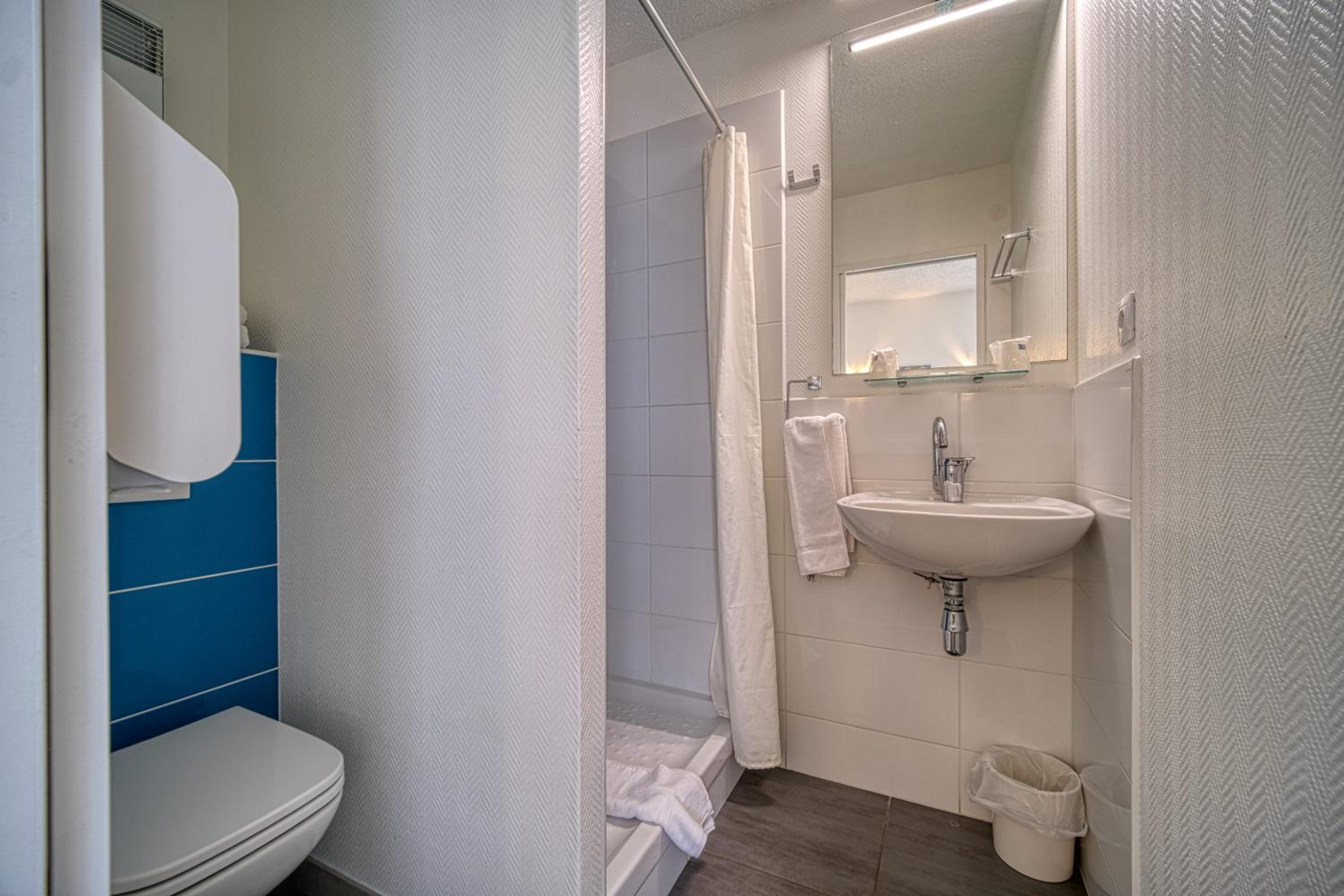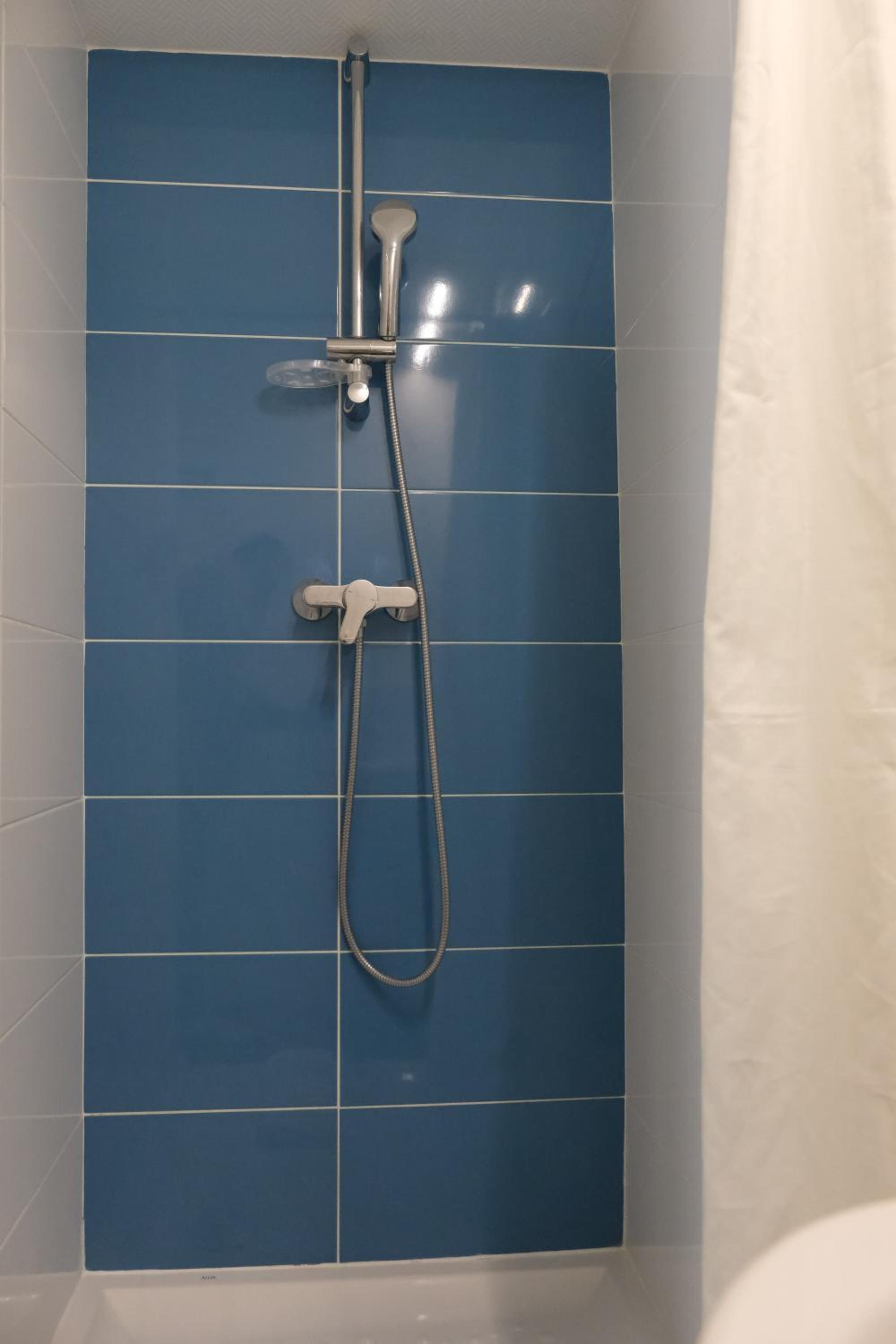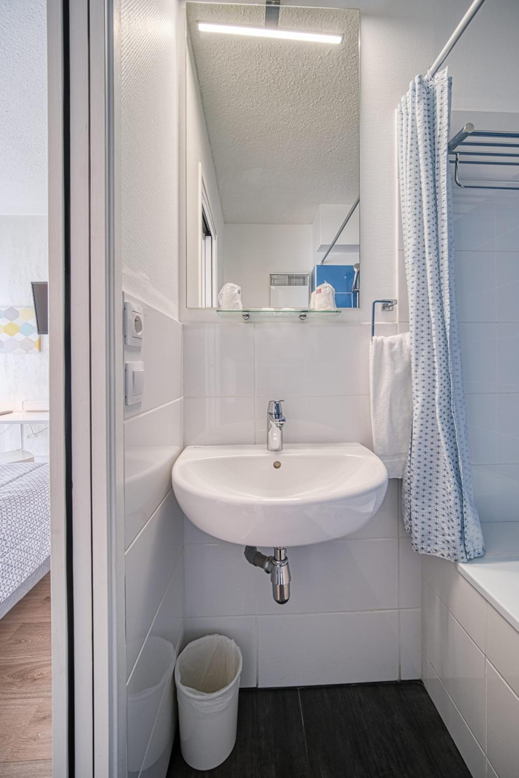 Chambre très petite. Pas de rideau à la baignoire pour prendre une douche.