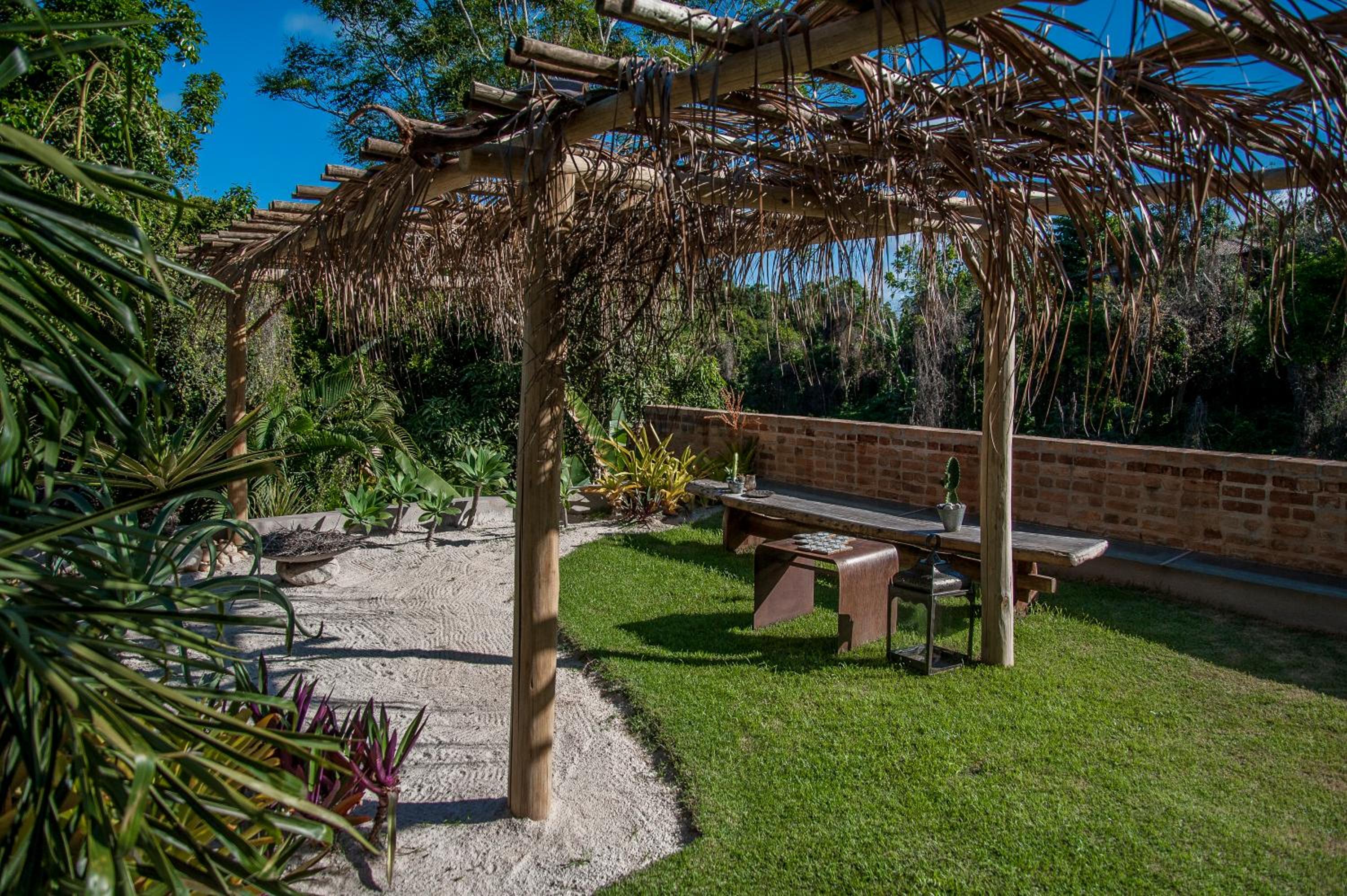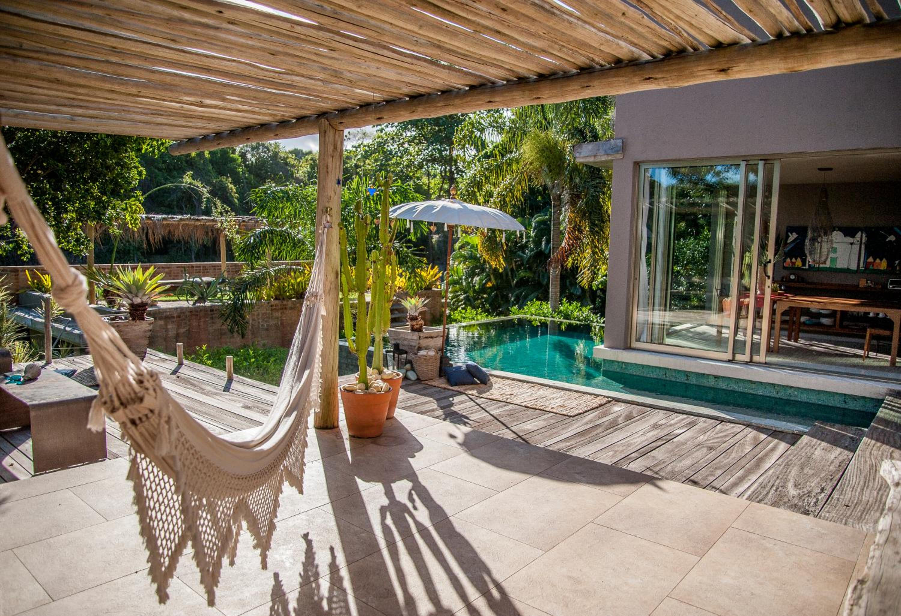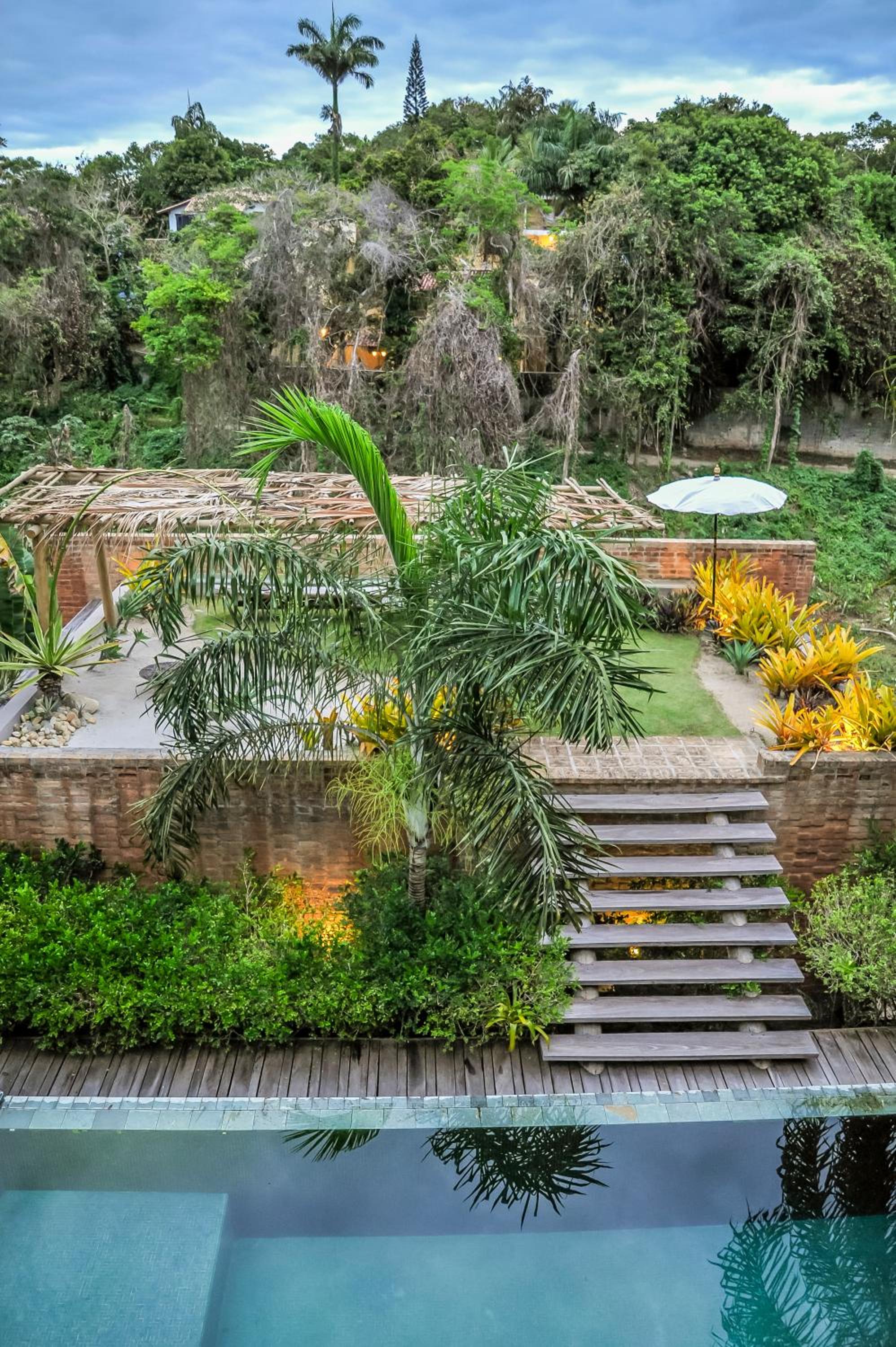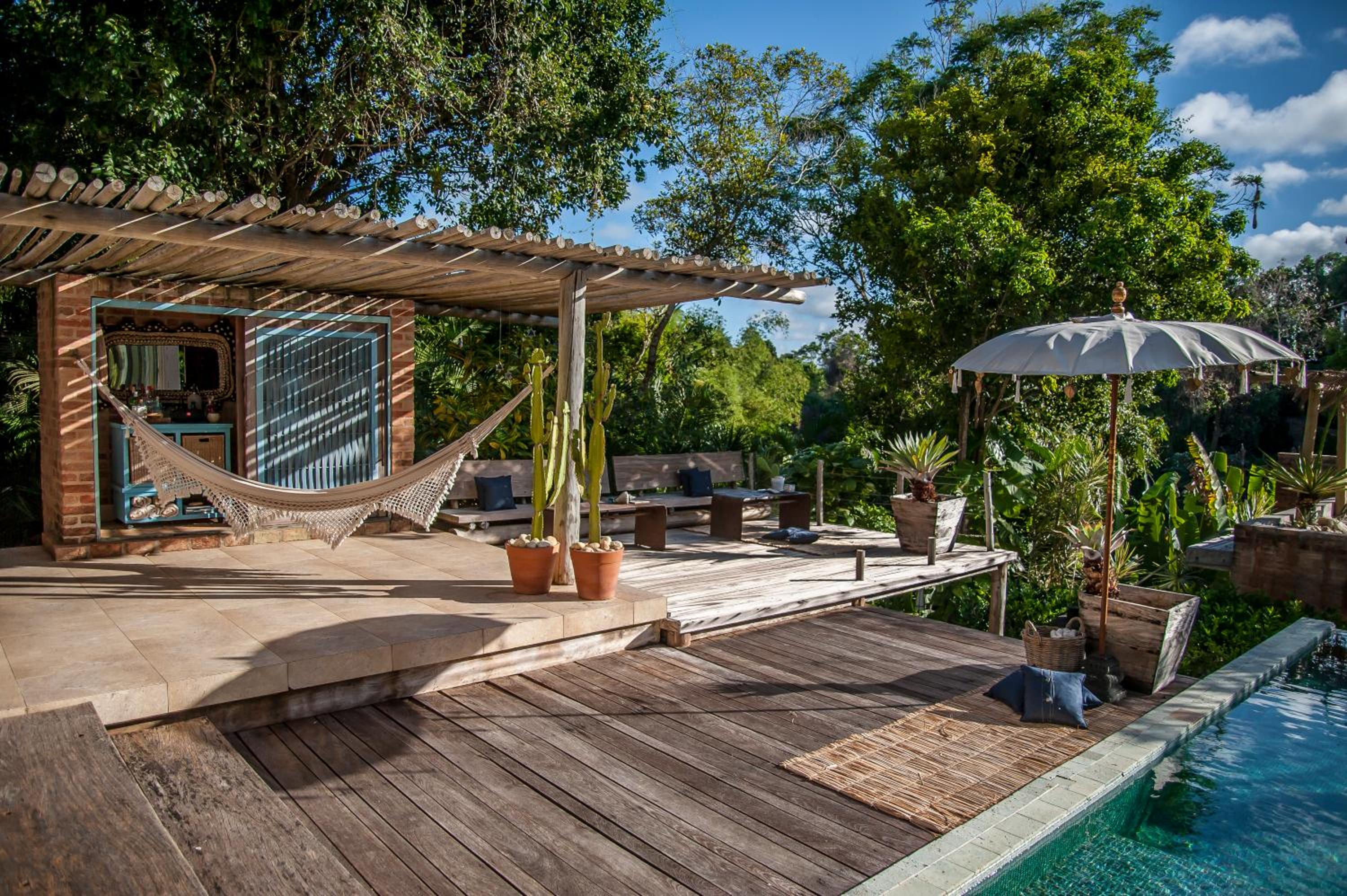 Relax by the outdoor pool surrounded by lush gardens filled with tropical trees, providing a peaceful oasis just steps away from Mucugê Beach.