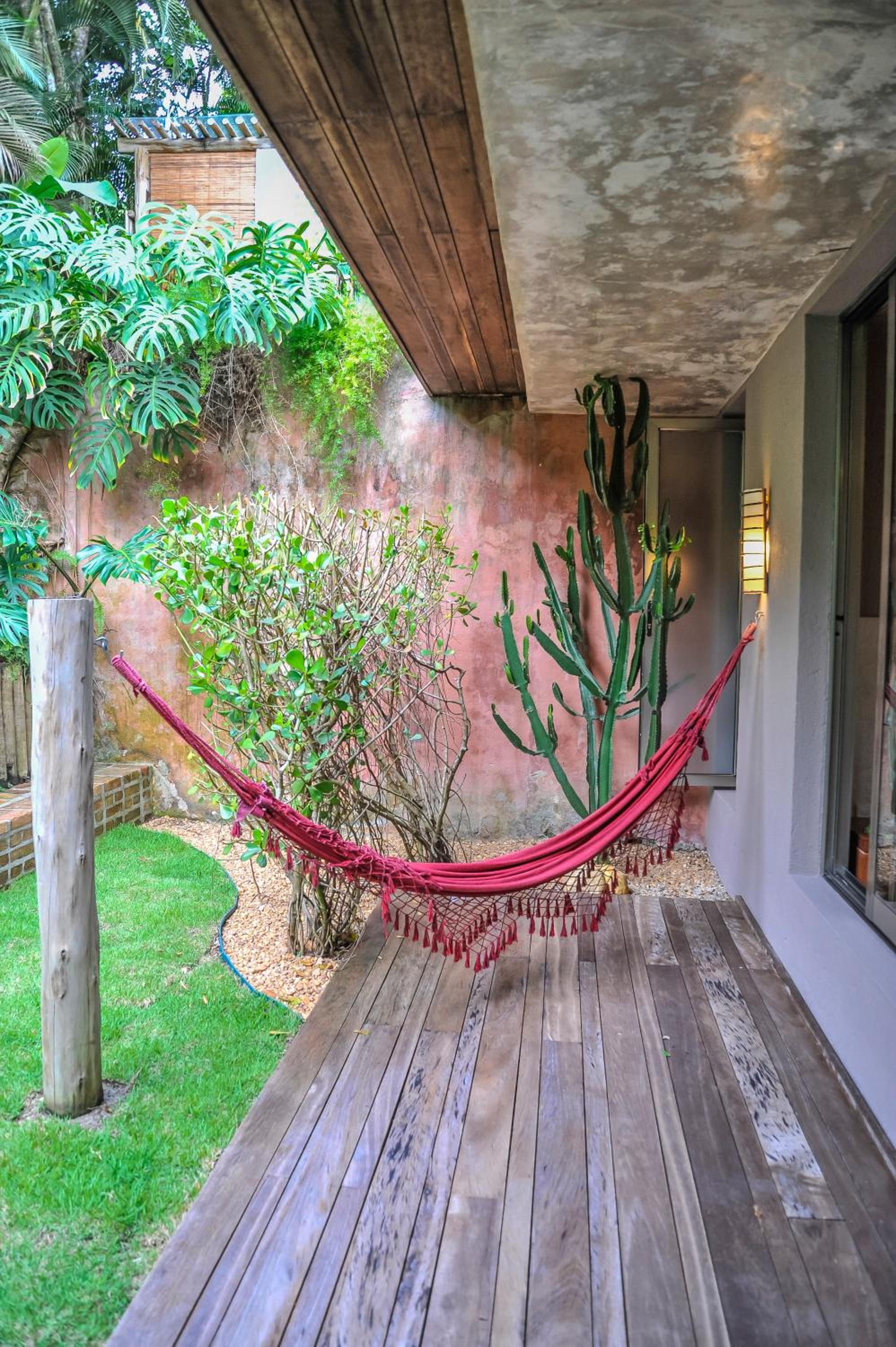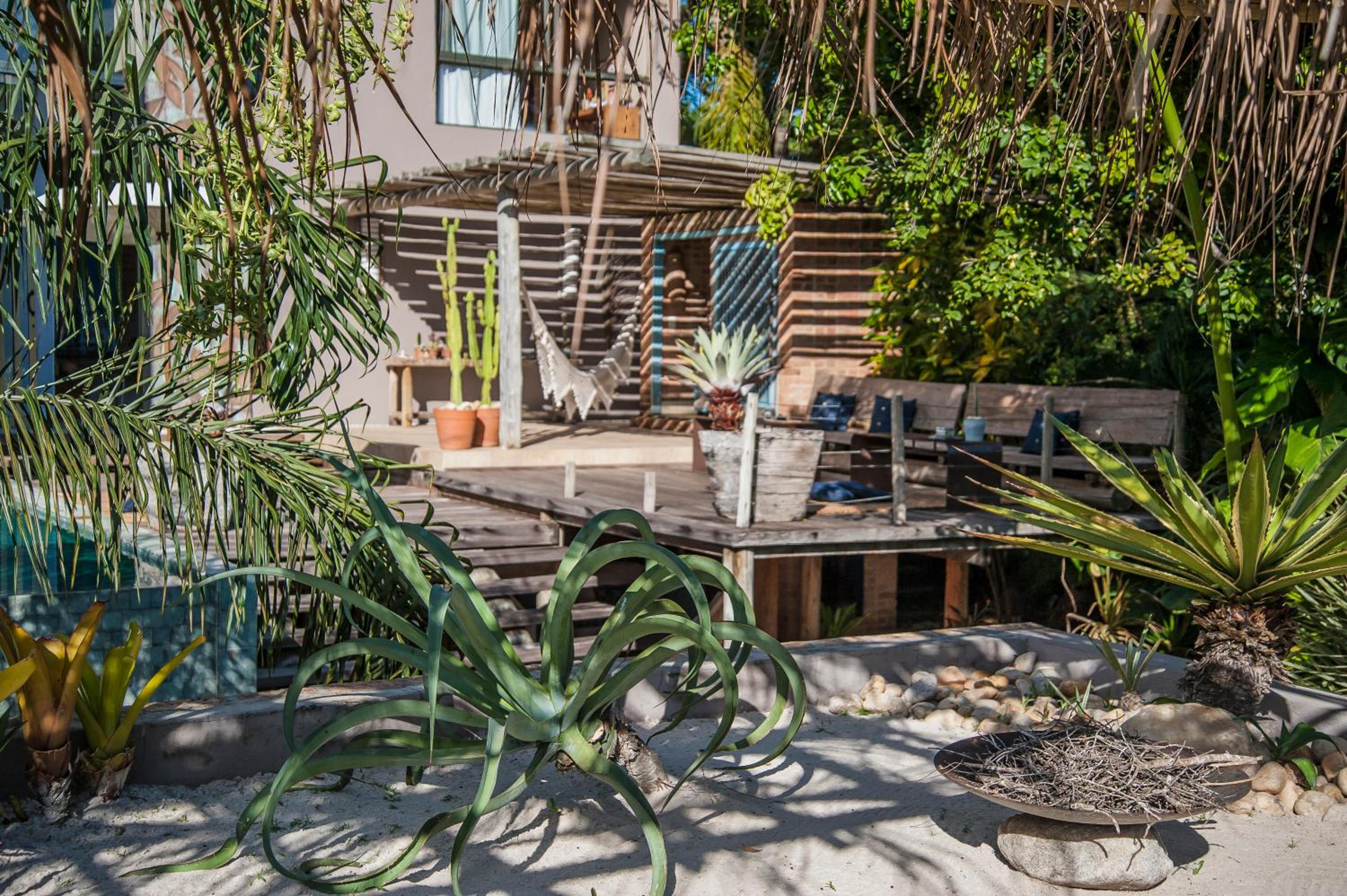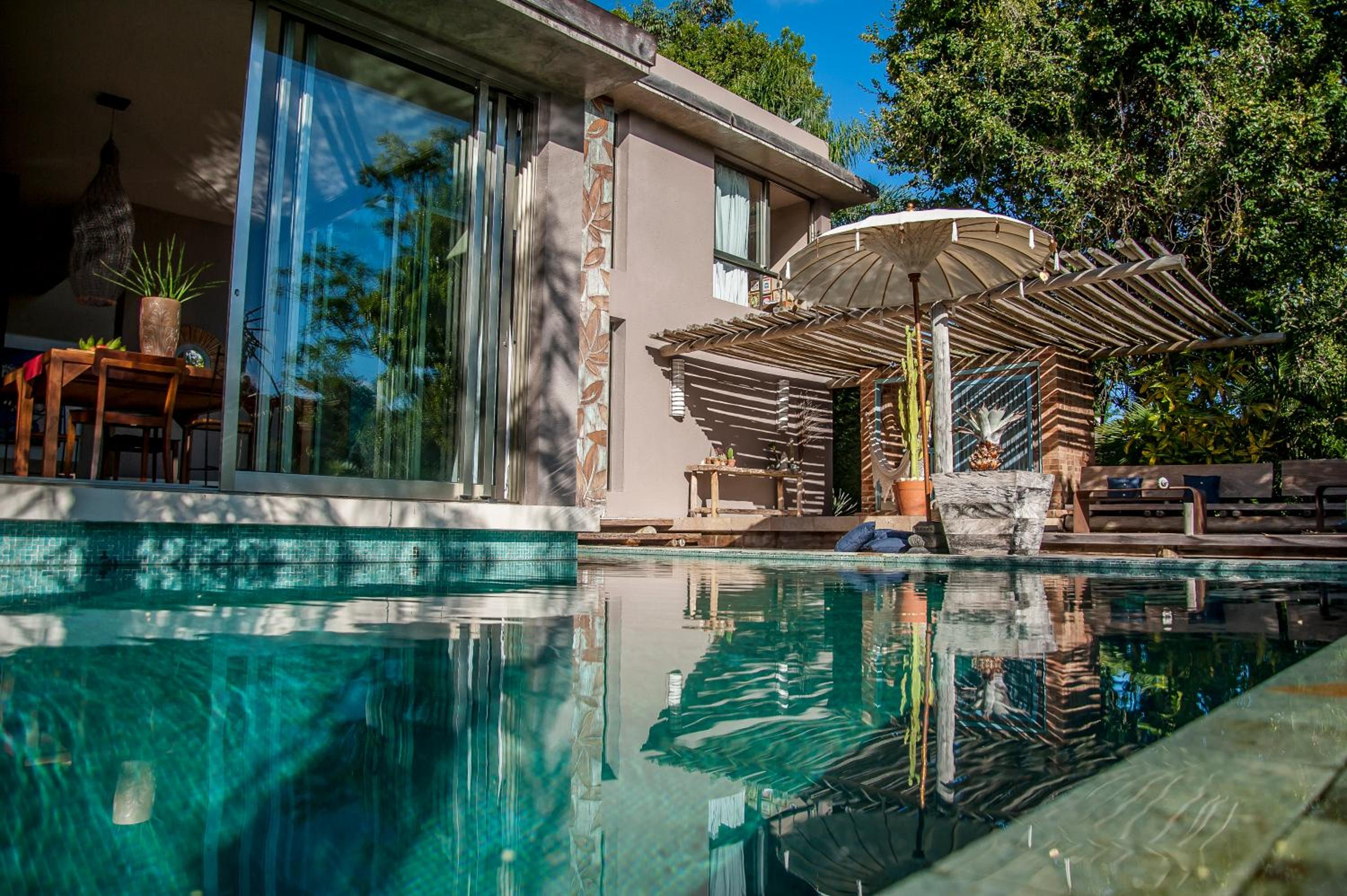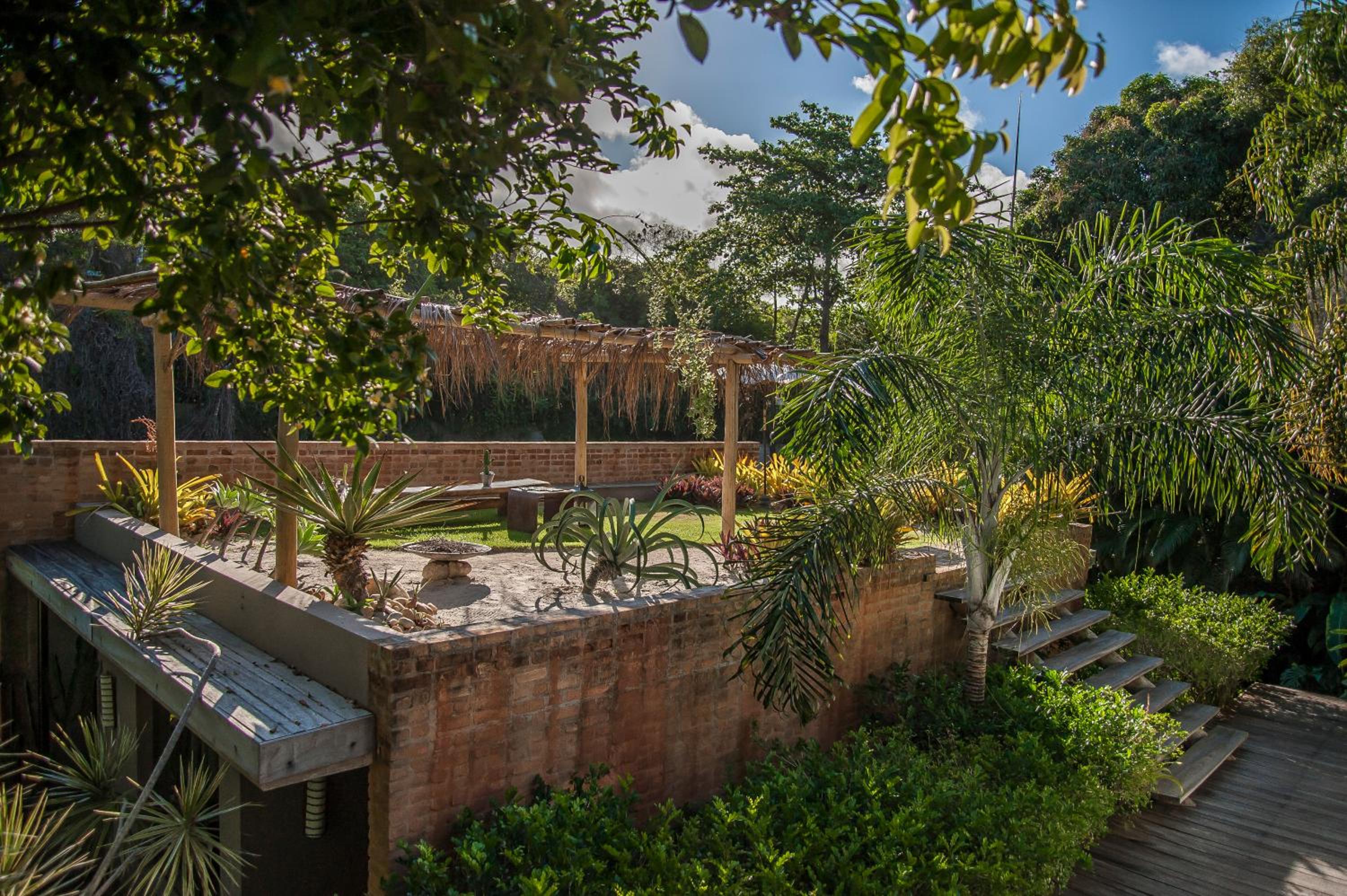 Relax by the outdoor pool surrounded by lush gardens filled with tropical trees, providing a peaceful oasis just steps away from Mucugê Beach.