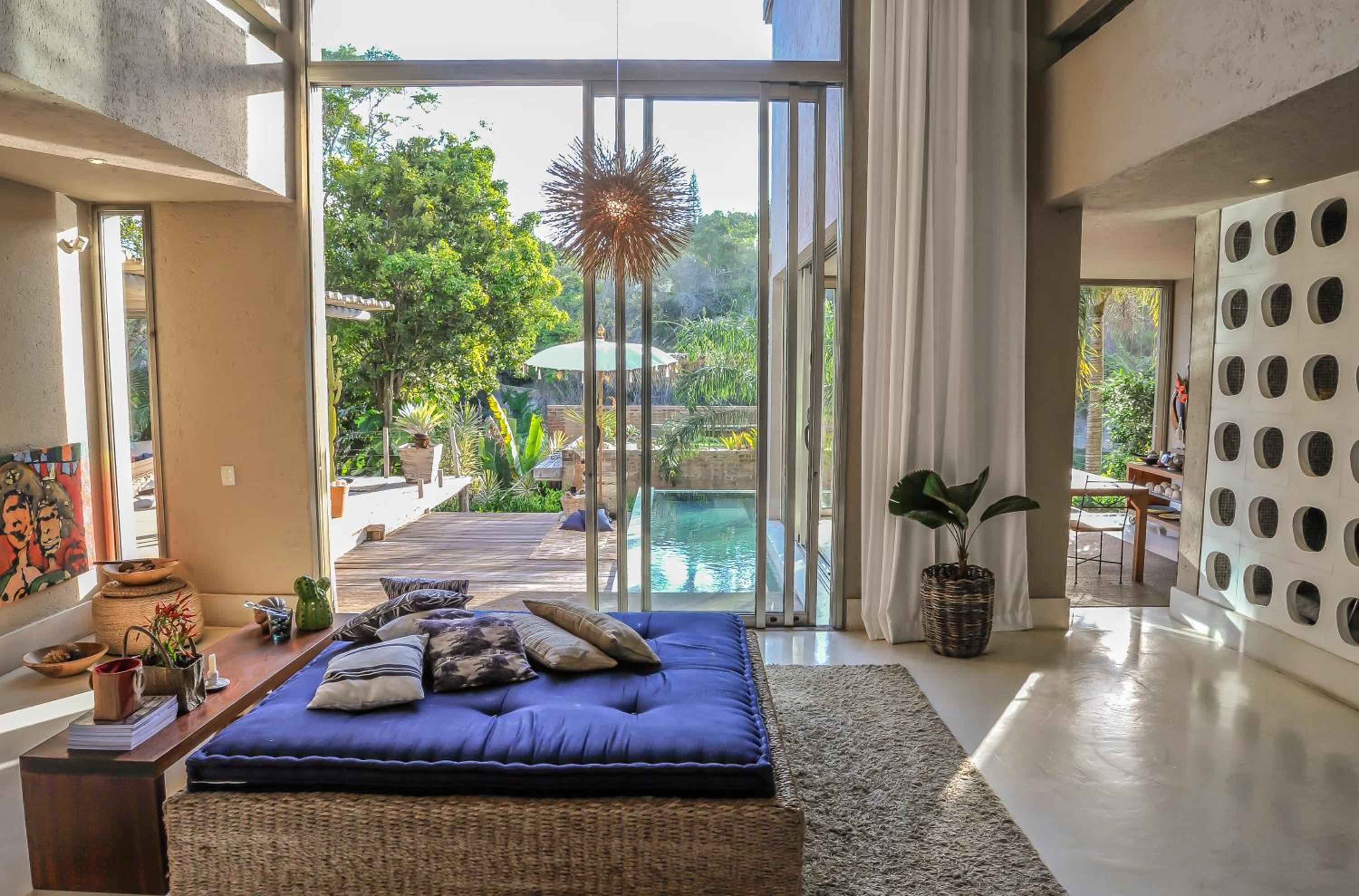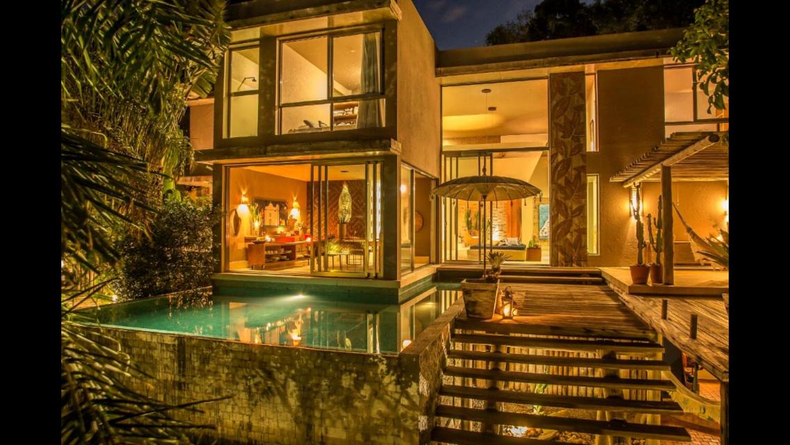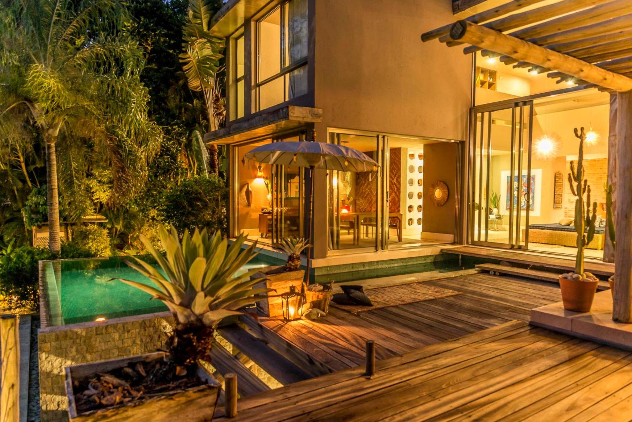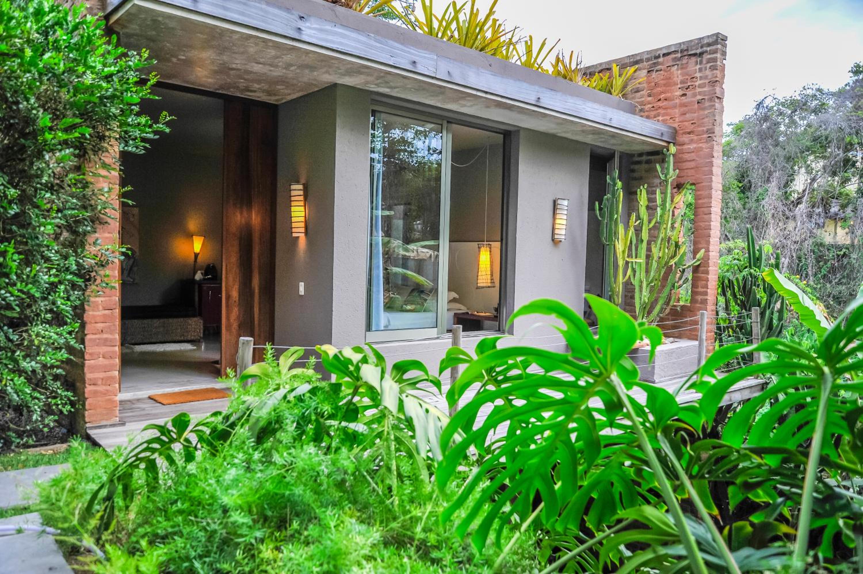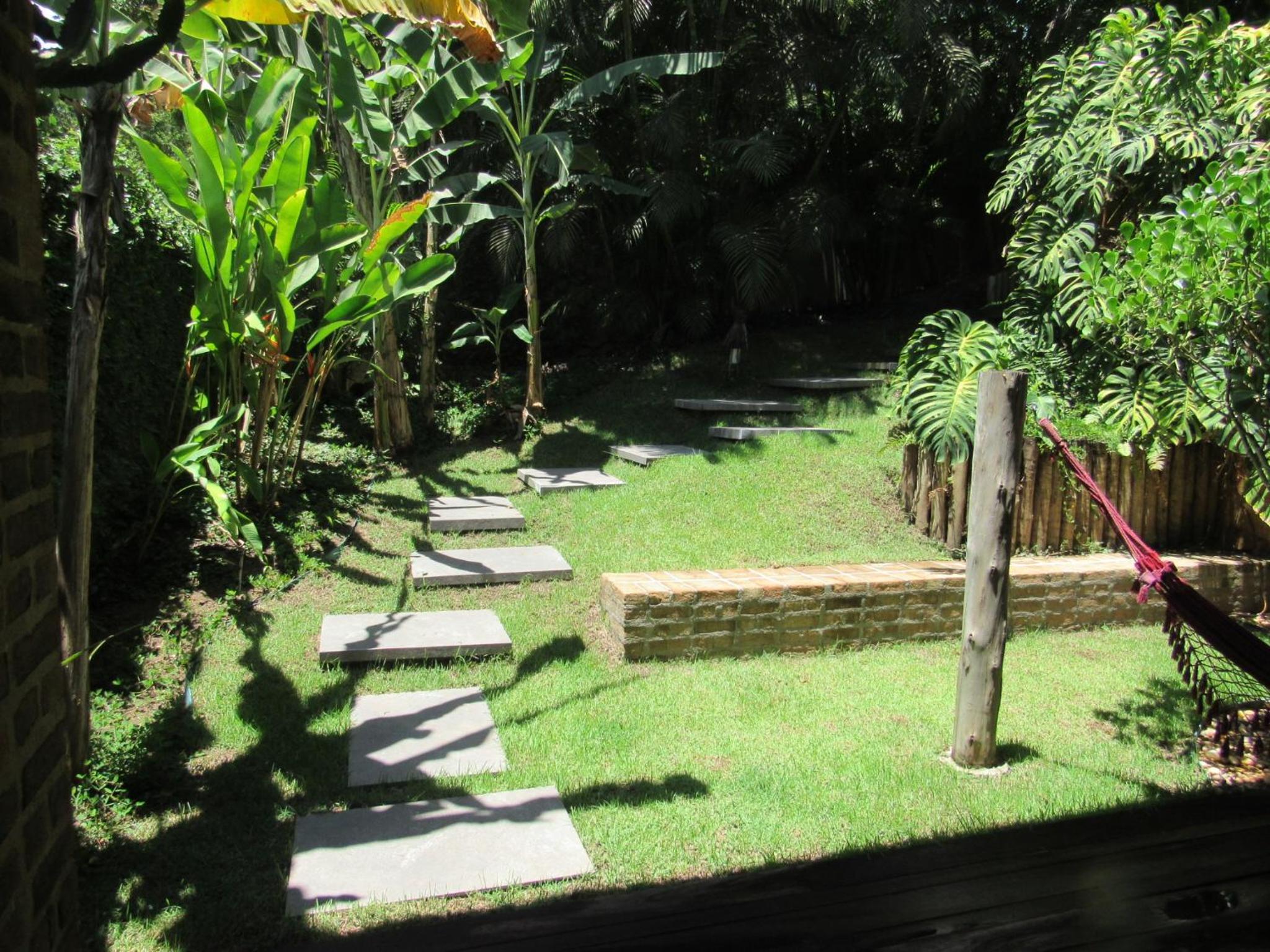 Relax by the outdoor pool surrounded by lush gardens filled with tropical trees, providing a peaceful oasis just steps away from Mucugê Beach.
