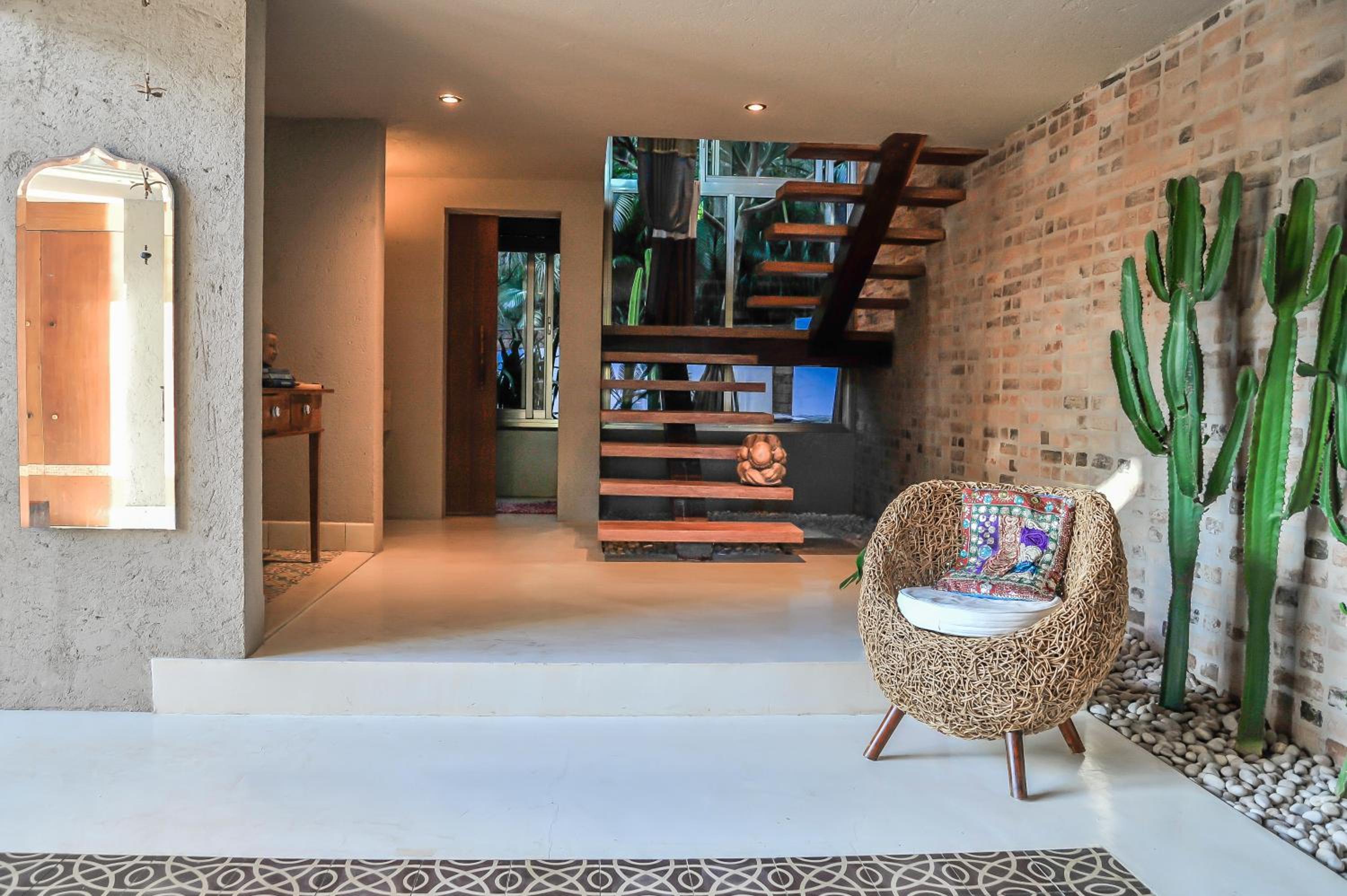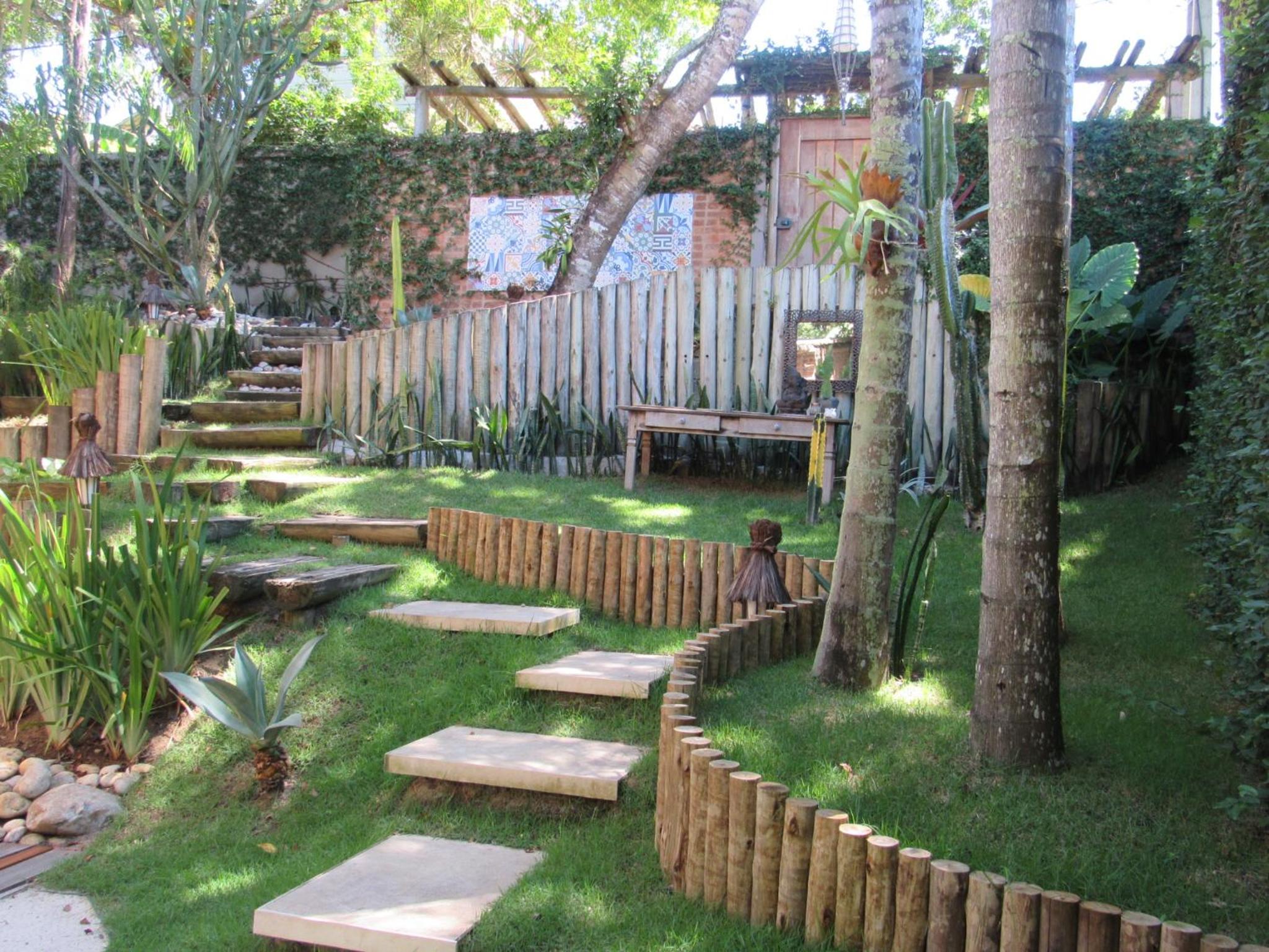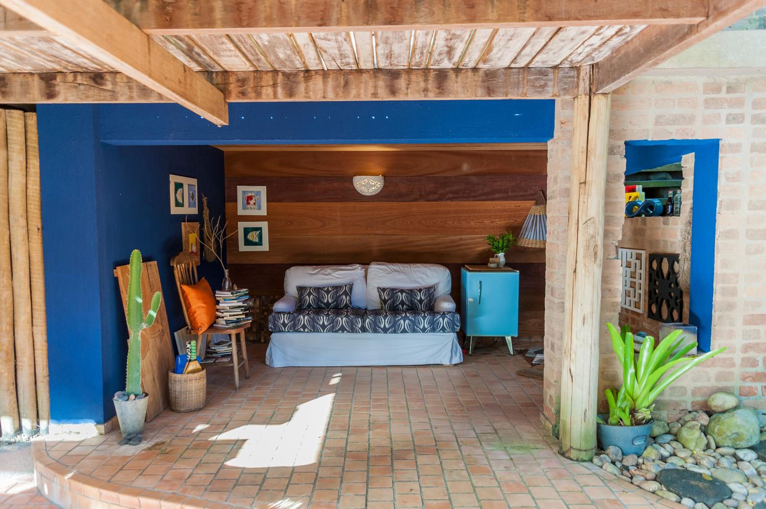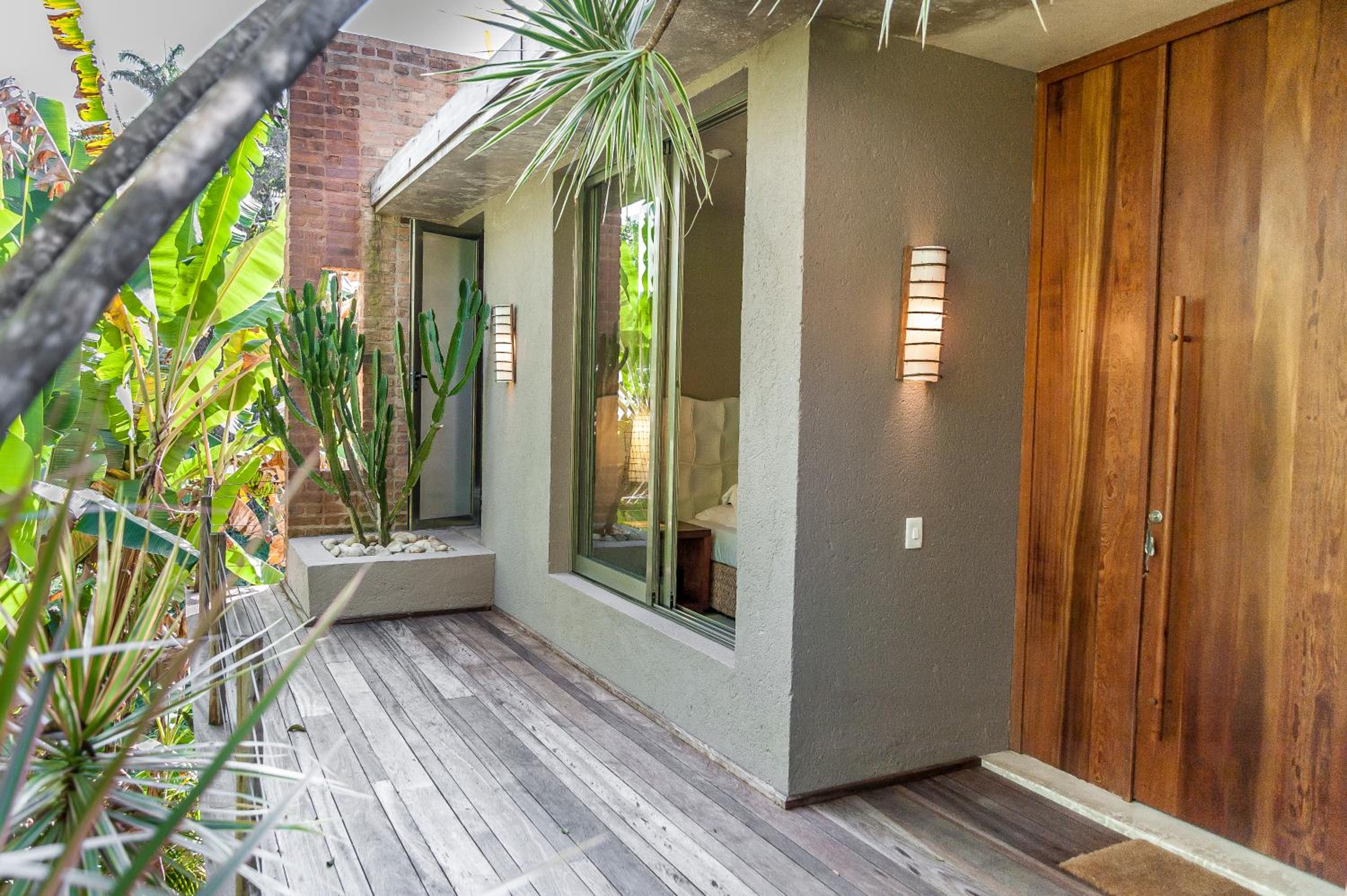 Relax by the outdoor pool surrounded by lush gardens filled with tropical trees, providing a peaceful oasis just steps away from Mucugê Beach.