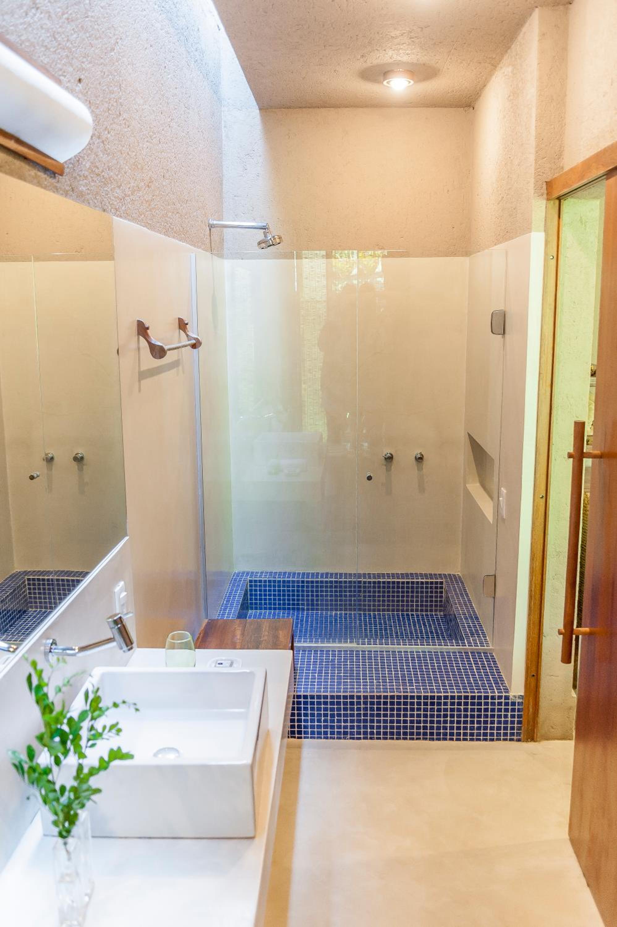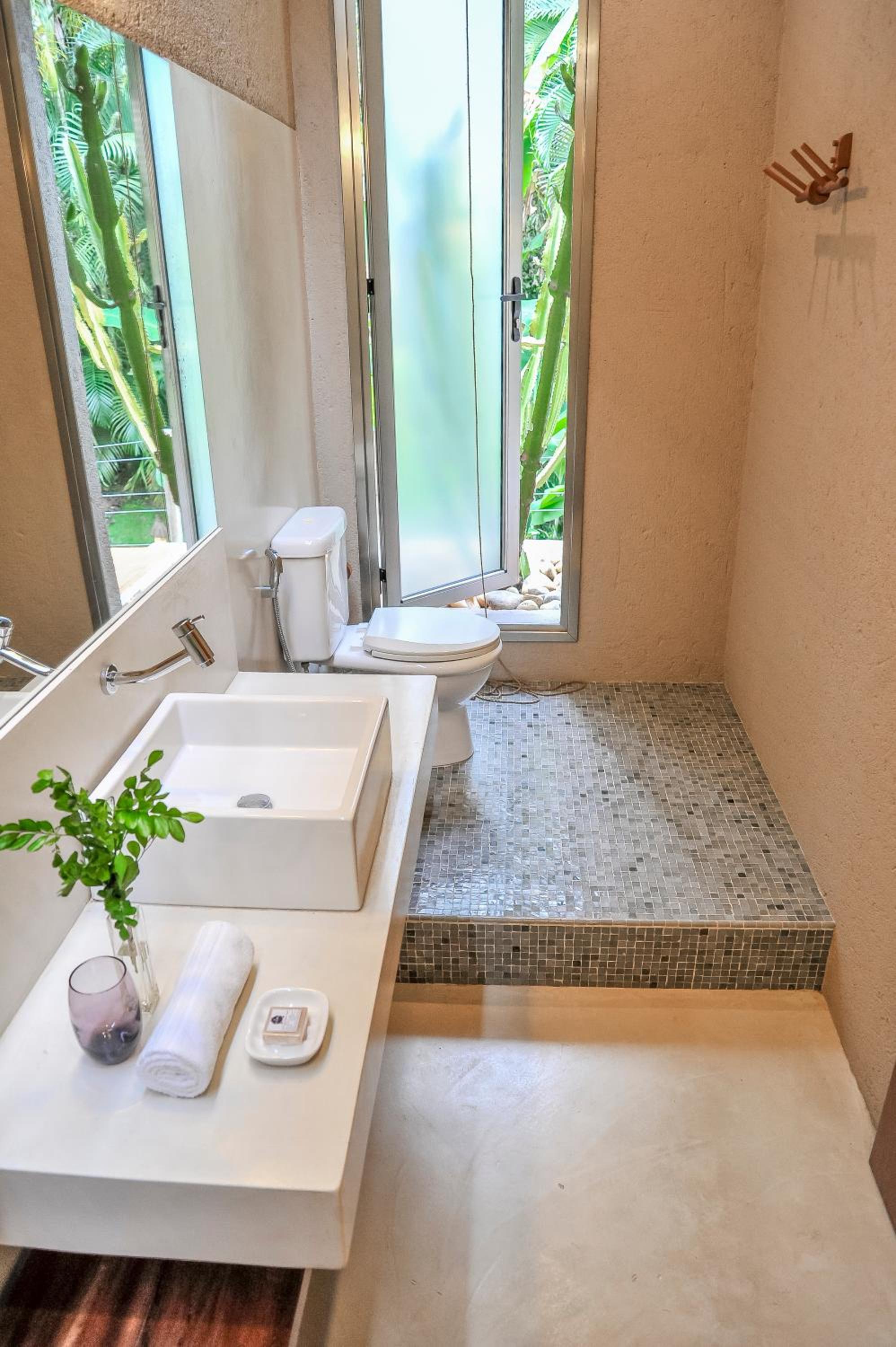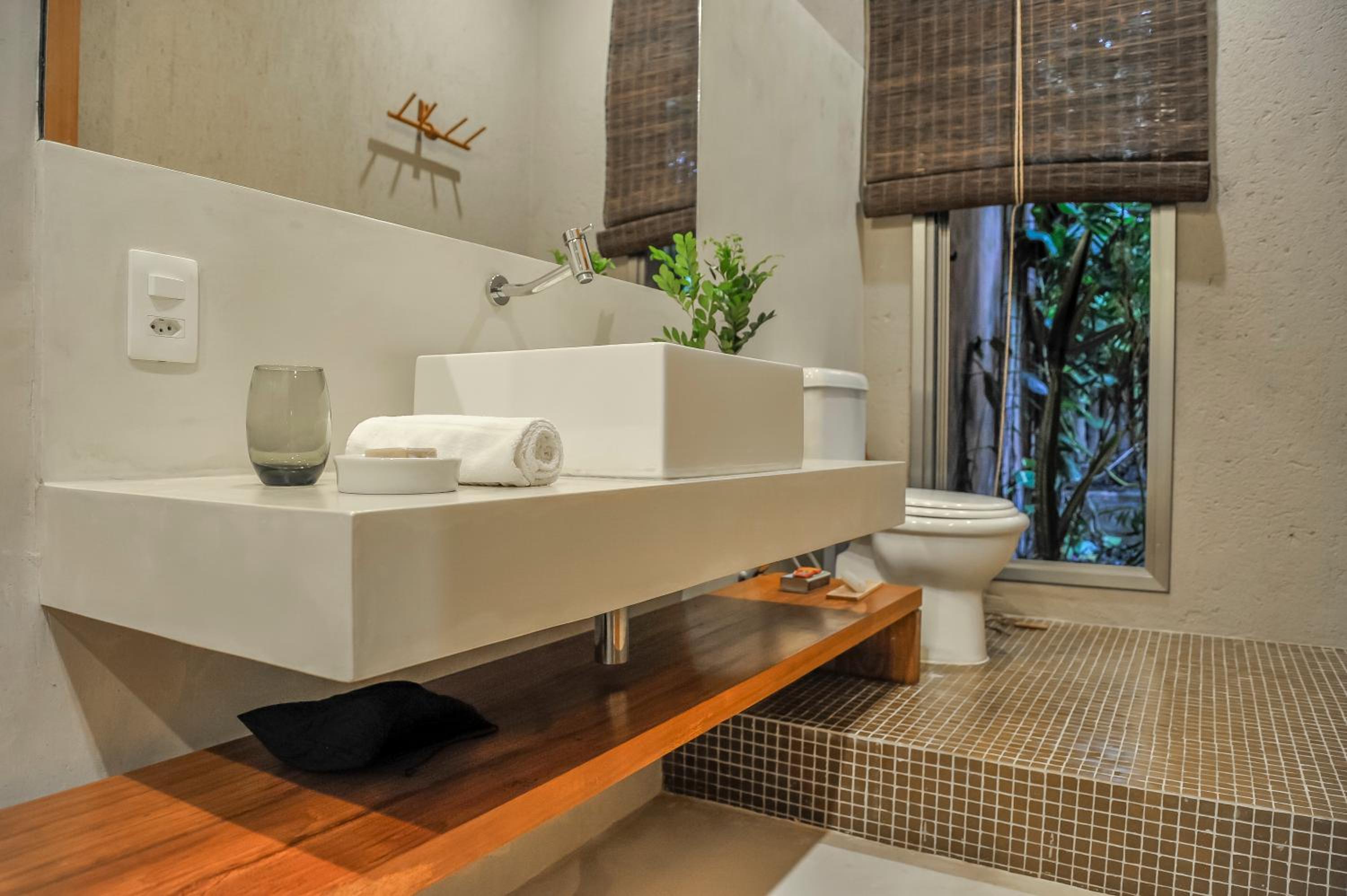 Comparando com outras hospedagens recentes, inclusive em Arraial, o café da manhã não é surpreendente como sugerem muitos comentários, está na média de outros lugares. Não oferecem shampoo nem condicionador. O quarto que fiquei tem um cabideiro embaixo de uma bancada, se colocar uma camisa no cabide ela fica arrastando no chão. Embora tenha um varal no box, a janela do banheiro é praticamente uma porta, é bonito de se ver, mas na prática não rola sair e deixar aberto para ventilar, então as roupas não secam.